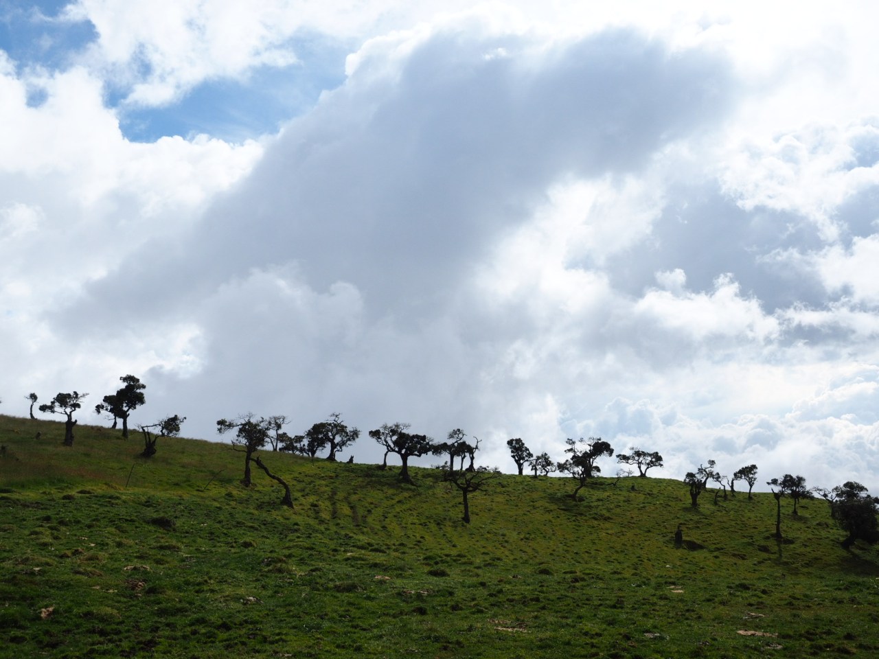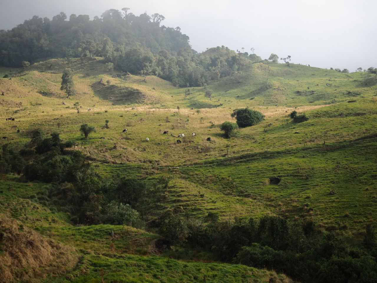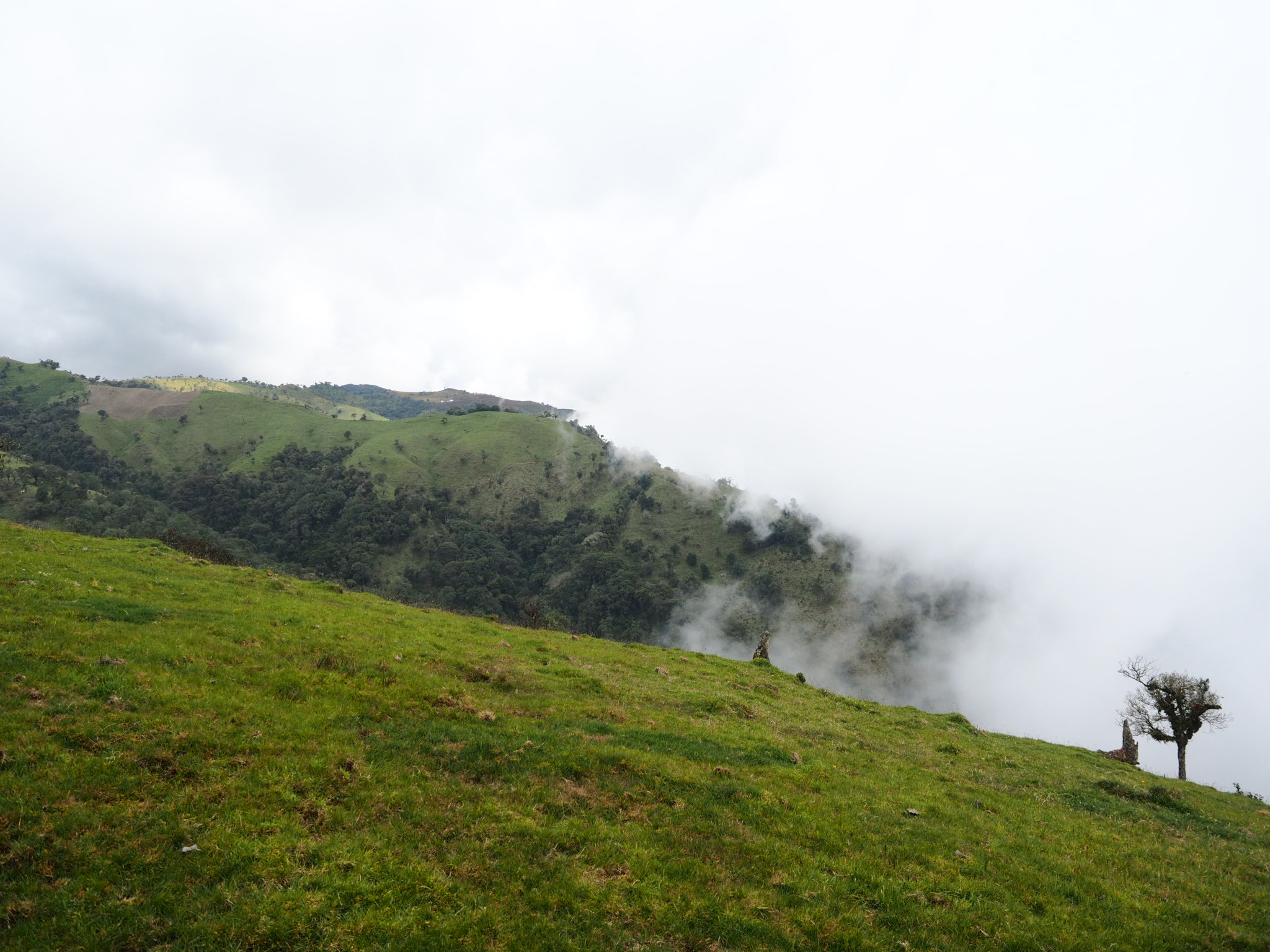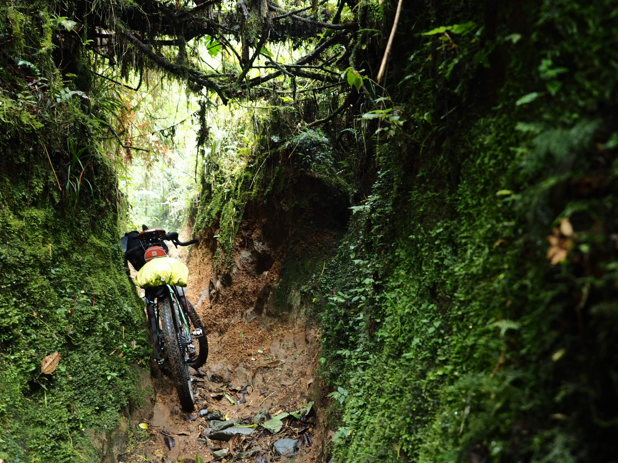 I continued to haul my bike up and over rocks and roots as I struggled to keep a grip on the muddy floor. At times the track was so narrow I had to carry my bike on my shoulders and shuffle sideways so it wouldn’t get tangled in the jungle brush. I measured my progress in tens of metres. Once in a while the trail would pop out into a farmers field, but the clouds obscured most of the views. I had to scare away an angry dog and stare down a curious cow to progress.
