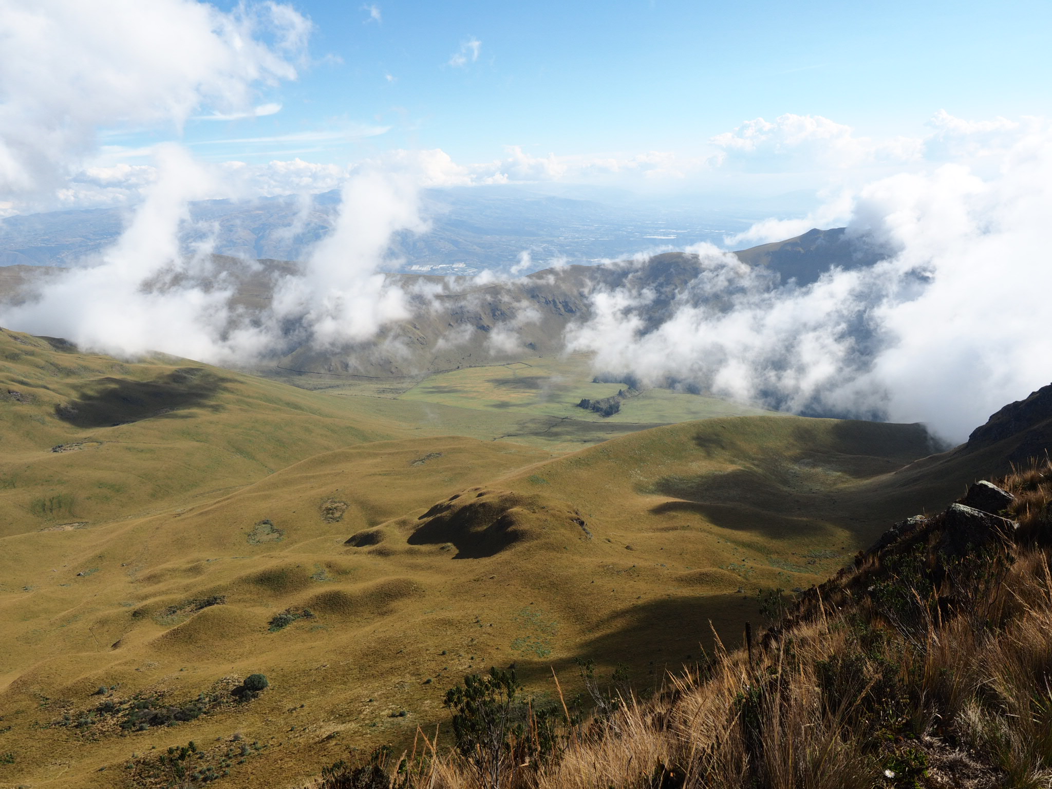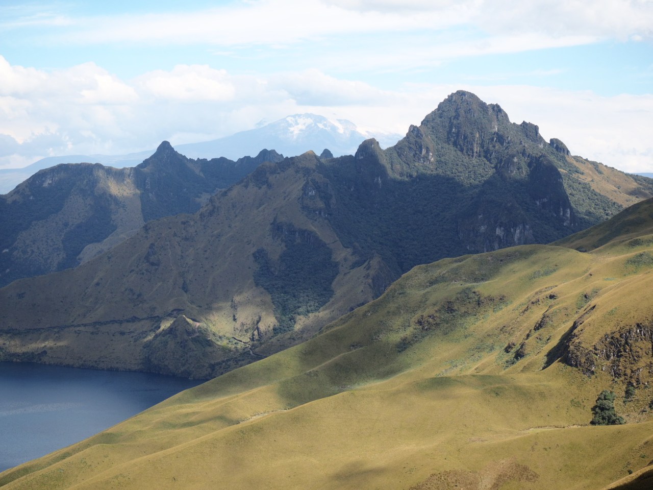 I was about 15 minutes into the hike when I realized I left my water bottle behind – not a smart thing to do at altitude. It wasn’t a long hike so I kept going rather than doubling back. The trail climbed steeply through tufts of yellow grass, making quick work of the 600 metres of elevation gain. It was slow going because of the elevation but as long as I kept a slow pace, I was fine. As I climbed, the crater lake revealed itself below and glacier-capped Volcan Cayambe emerged into view beyond the far ridge. I reached the top and watched as the clouds from the west ran into the mountains and whispered across the meadows below.