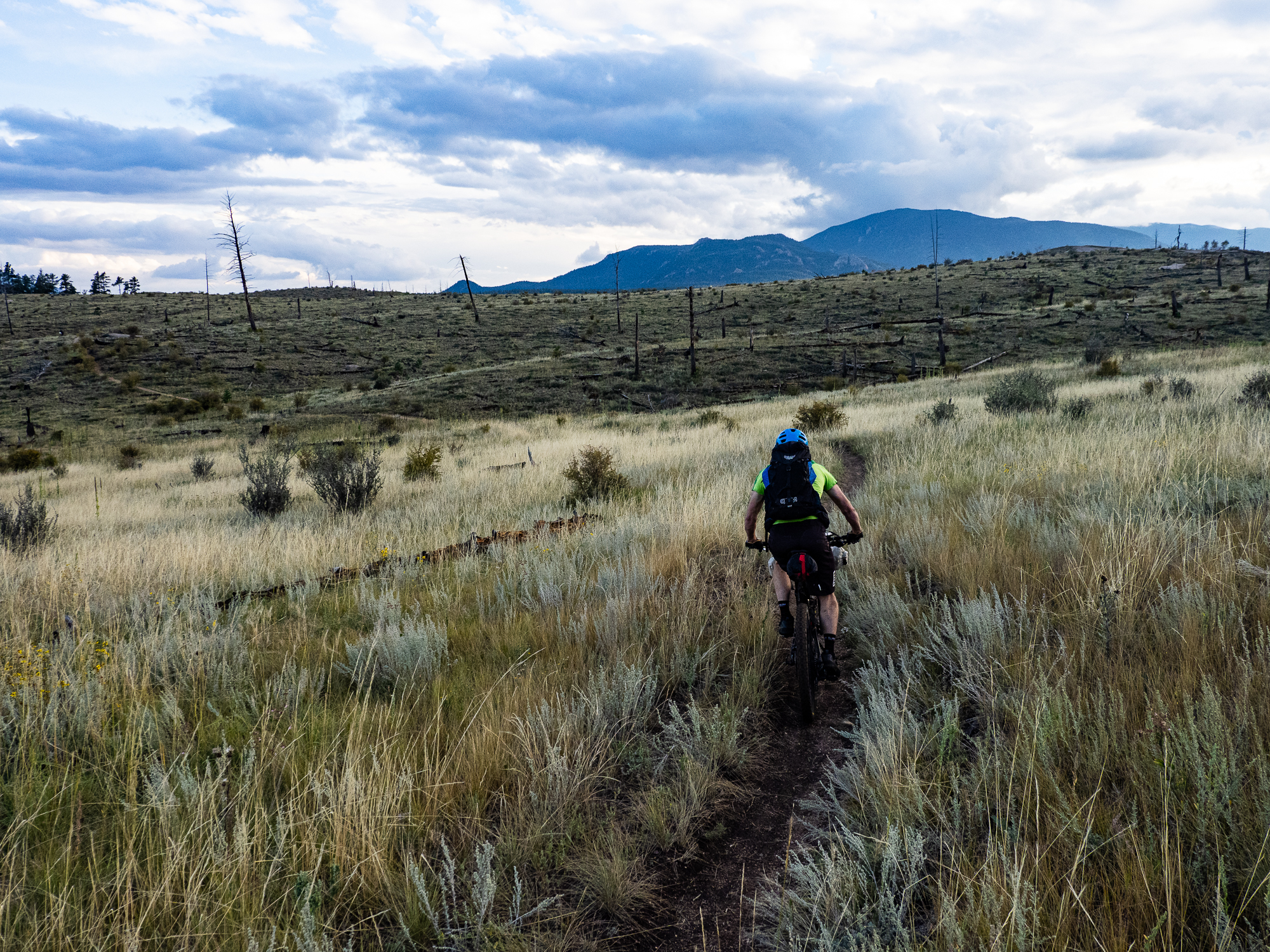 Segment 2 has a poor reputation because of how exposed it is to the elements. Several decades ago, the forest was destroyed in a fire, and it hasn’t grown back. There’s few trees standing, little shade, and no water. The plus side is the expansive views of big mountains and lots of impressive rock formations. It was mostly rideable too, and mostly uphill. The segment ended next to a rural firehall, where we topped up with water while locals showed up for a community meeting. We set up camp across the road, back on public land.