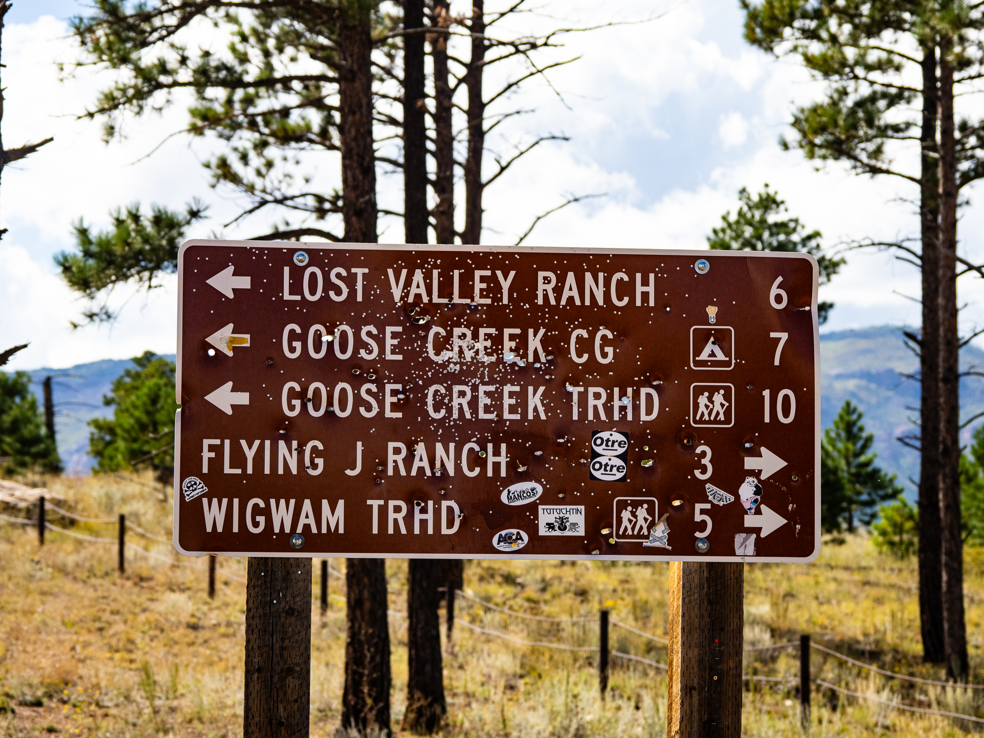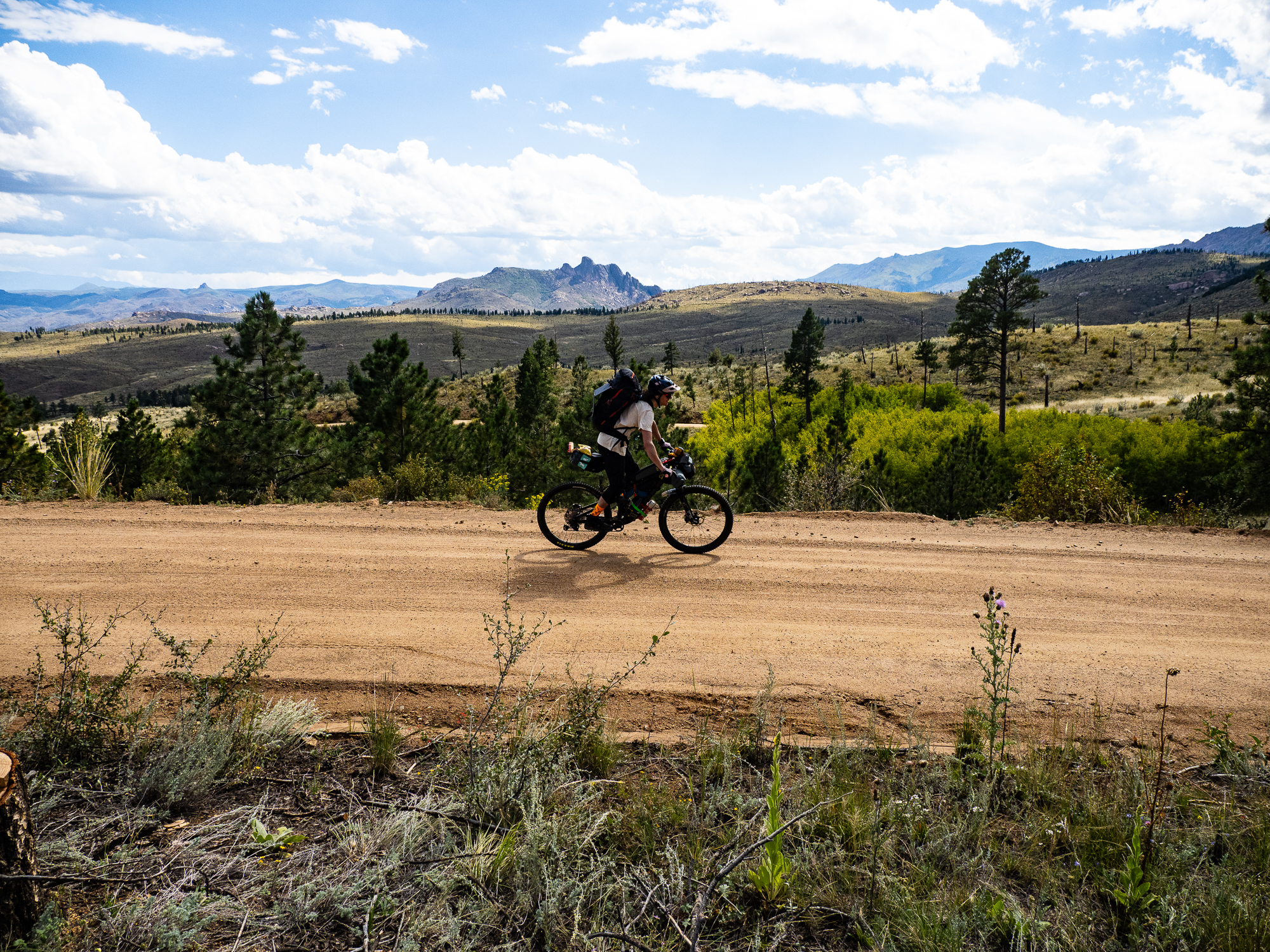 We started with 20 km of proper mountain bike trails, with great flow and reasonable grades. Even though the riding was relatively easy, it still took us three hours to complete this section. There was stops for photos and water and snacks, which all add up. We reached a campground to get more water, then stopped for lunch further down the road to avoid paying the day-use fee at the campground. The Tarryall detour was hot and exposed, with long climbs on loose surfaces, which made for somewhat slow travel. The scenery across the arid landscape was beautiful, with one rocky mountain dominating the view. The biggest issue was the lack of water—we went about five hours between water sources until we reached Goose Creek around 4 p.m.
