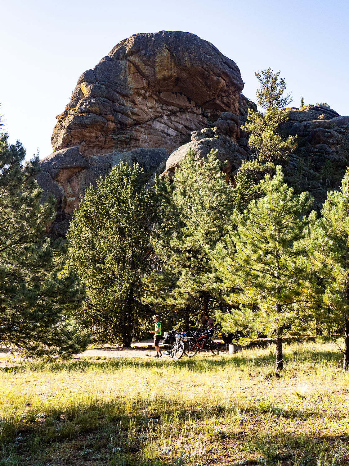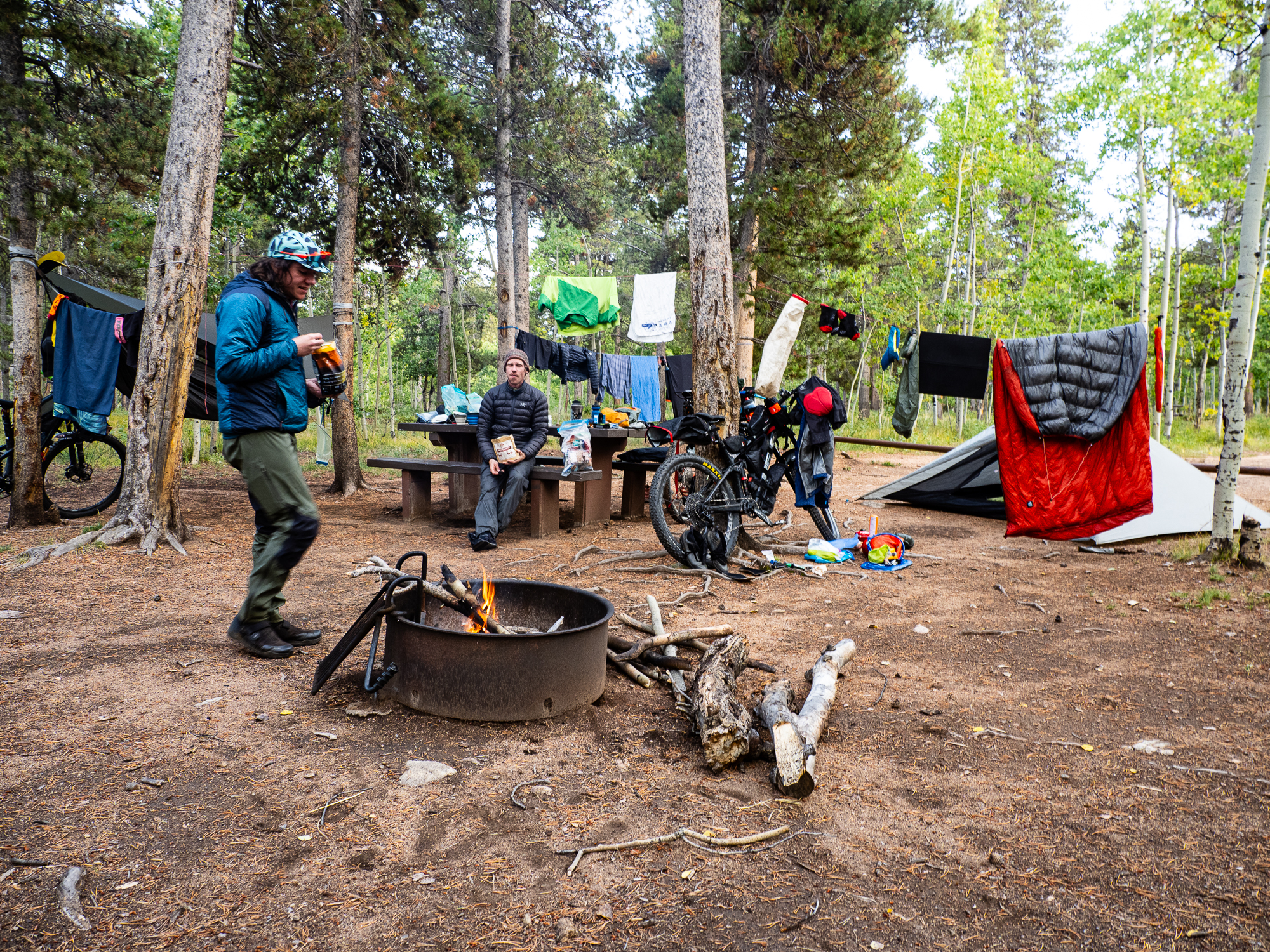 We reached Kenosha Pass Campground around 5 p.m. and set up camp. We had ample time to hang stuff up to dry and I scavenged leftover wood from other campsites so we could start a fire. Dru busted out some instant caramel pudding for desert.