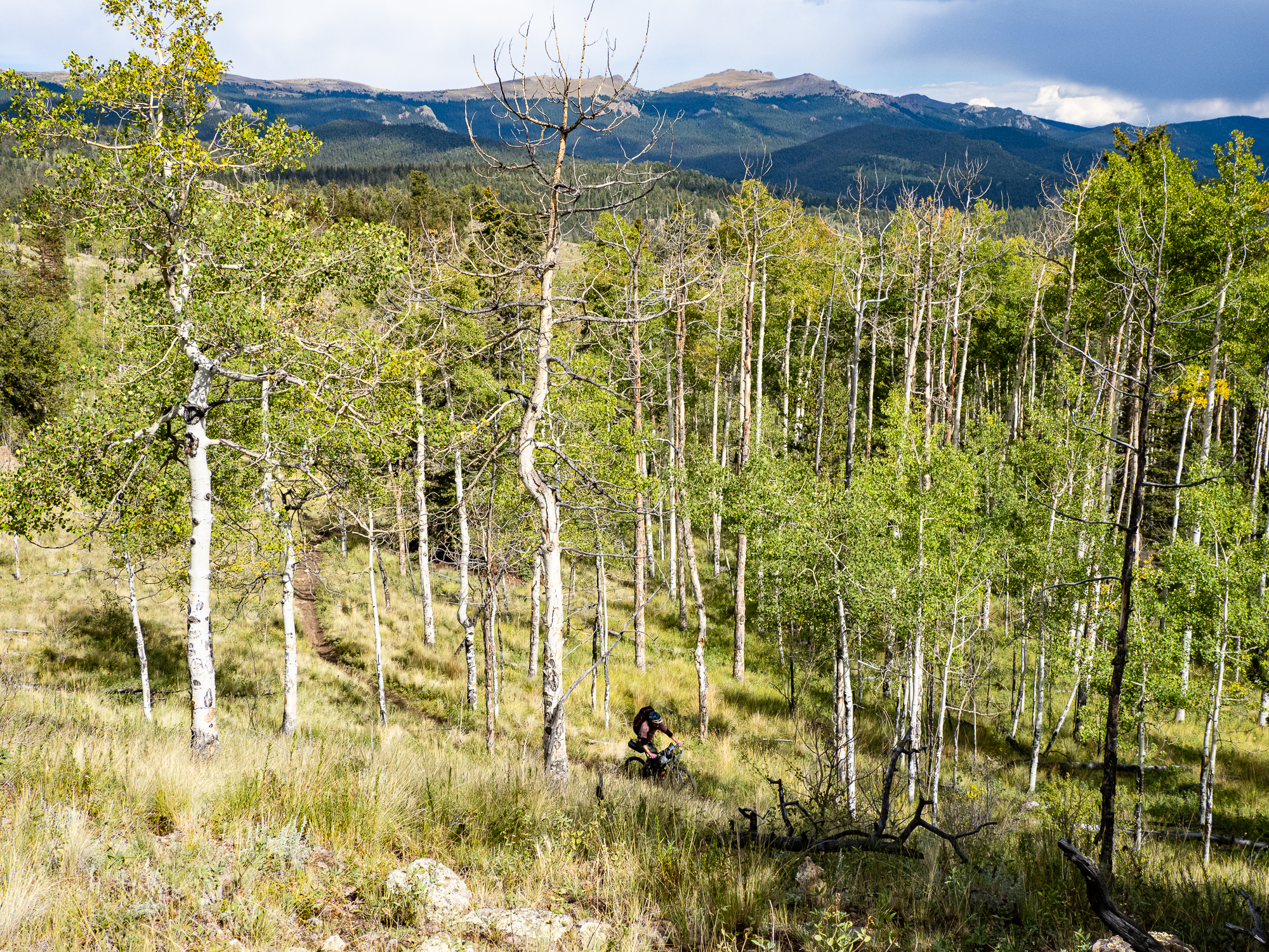 Dru caught up not long after; he missed the turnoff and pedaled an extra 5 km down the Tarryall Road before realizing his mistake. But, where was Russ? Russ left the Stagestop first, so he should have been there. Turns out, he also missed the Rock Creek turnoff, and went even further the wrong way than Dru! So much for an easy day, but at least we were all back together. The remaining 10 km to our campground took us through open grasslands and stands of towering aspen, the trunks like twisting marble columns.