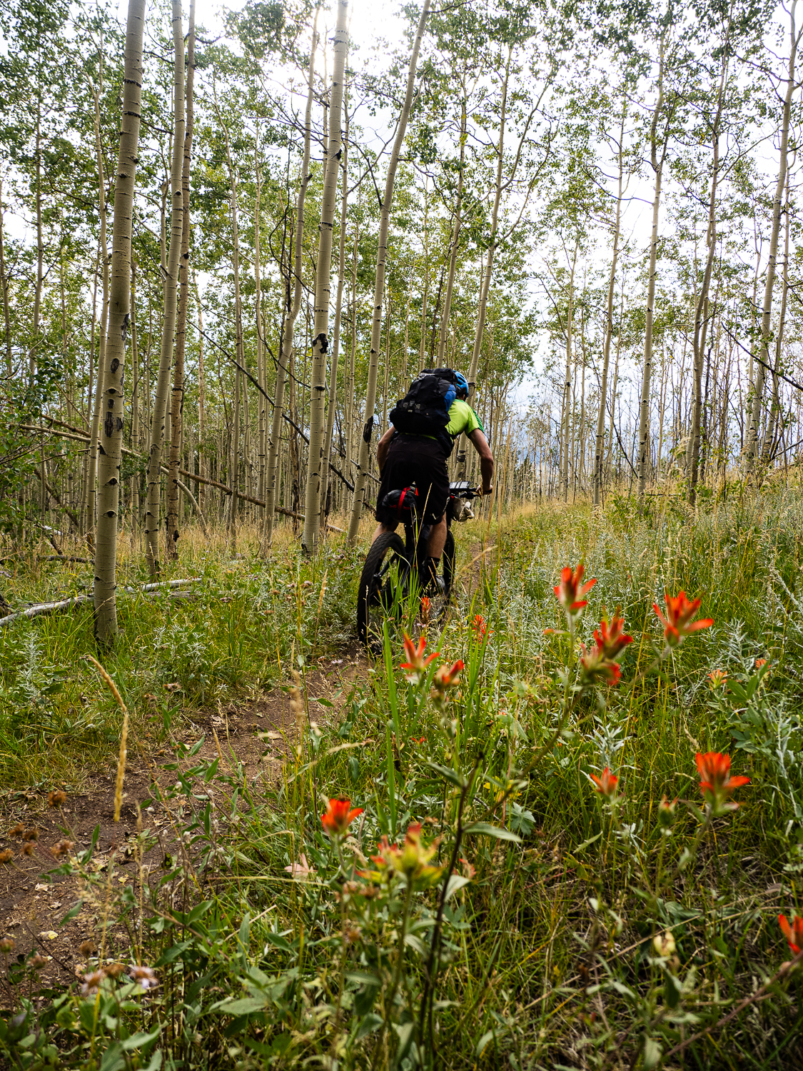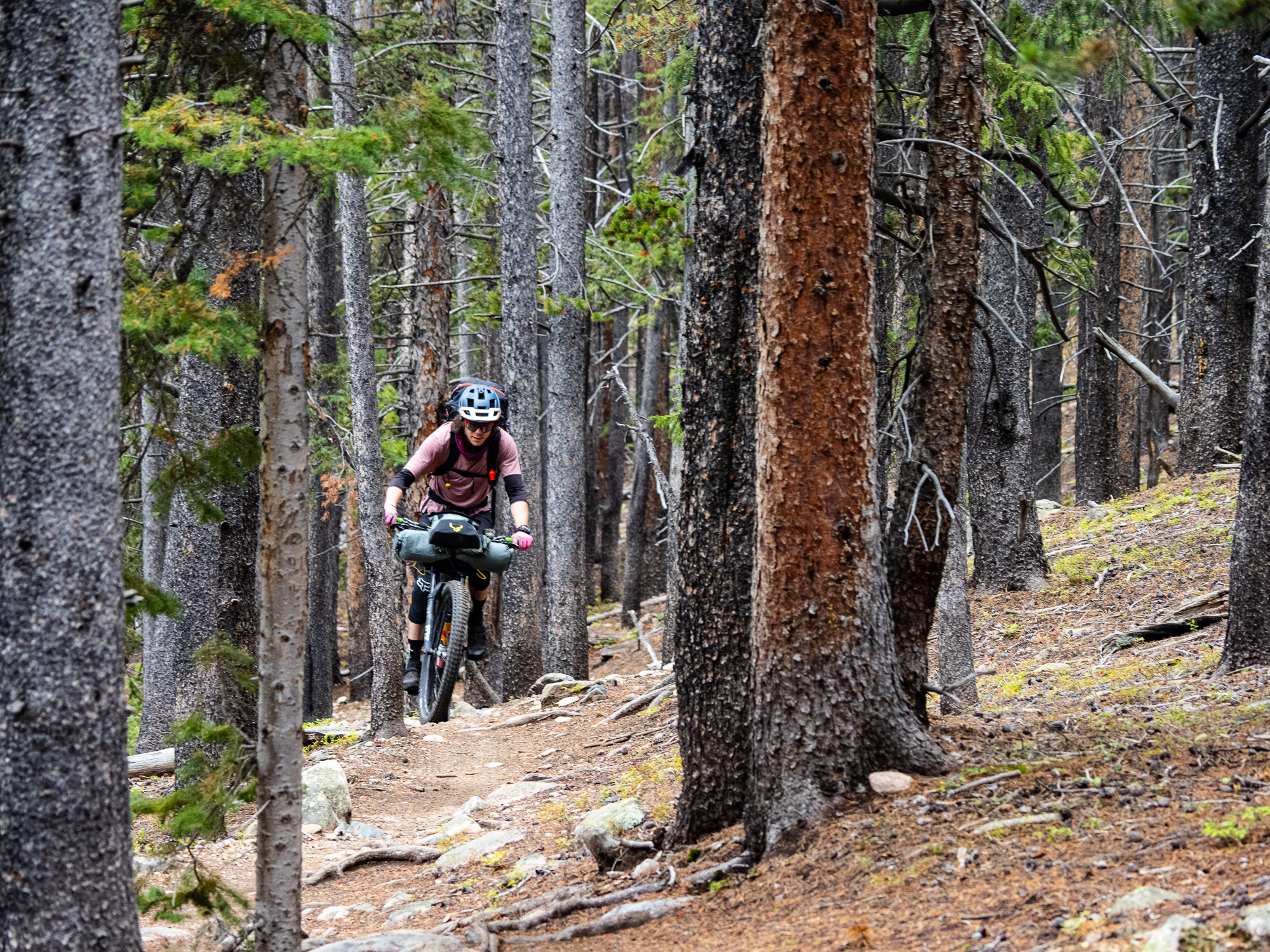 The first 10 km featured small ups and downs, most of it pretty fun. We enjoyed expansive views of South Park, which is actually a vast plateau and not a small town filled with bizarre characters. Then we began the 9 km, 600 m climb to Georgia Pass. The first third was filled with soul-sucking roots, the second third was buff and mellow, and the final stretch in the alpine was rutted and frustrating. Dru uncharacteristically brought up the rear. As we waited for him to catch up, we got the bad news—his shock had blown. We crested the pass in the snow; our only hope was his shock would get him down to Breckenridge, and he could get it repaired promptly.