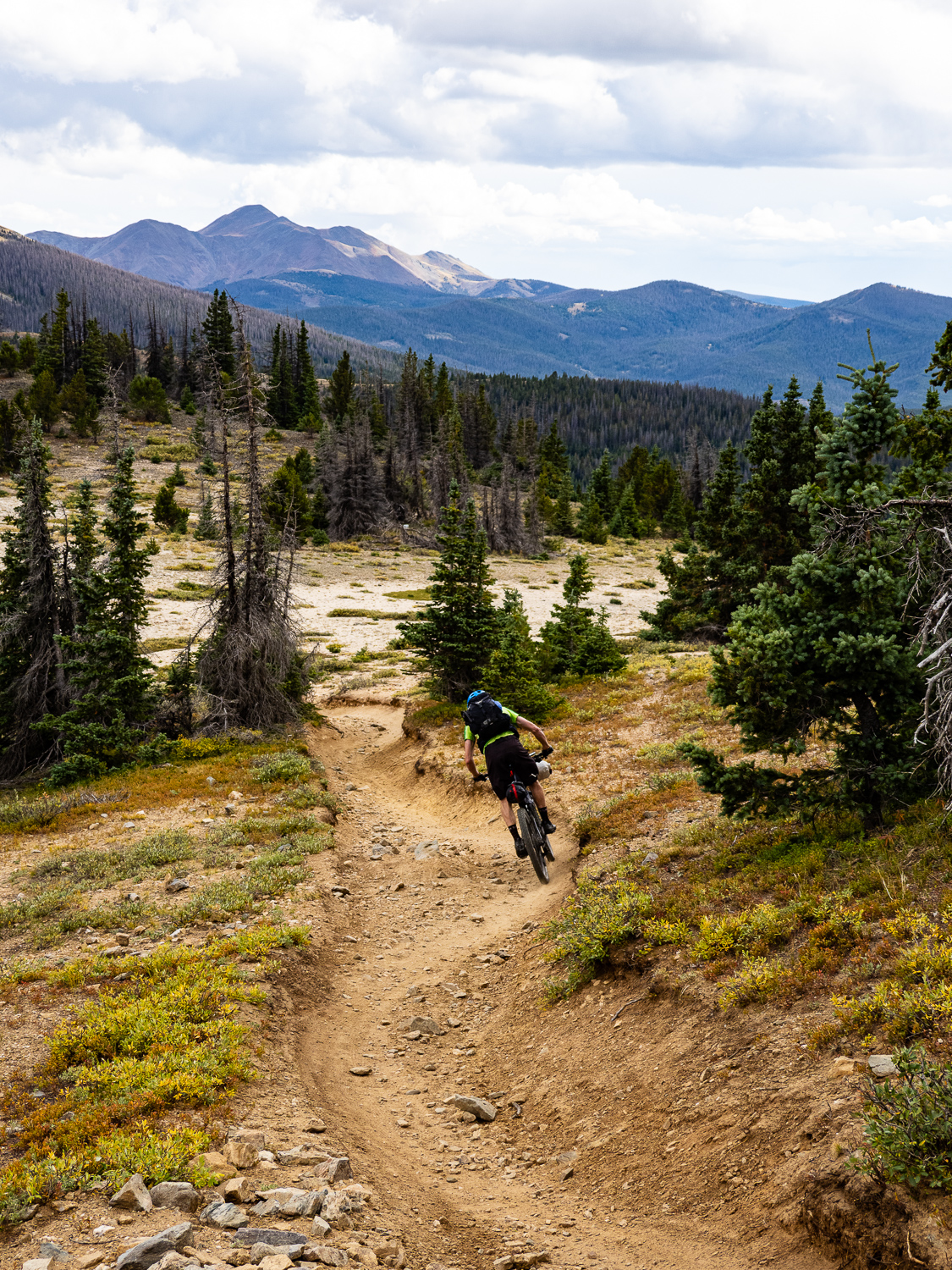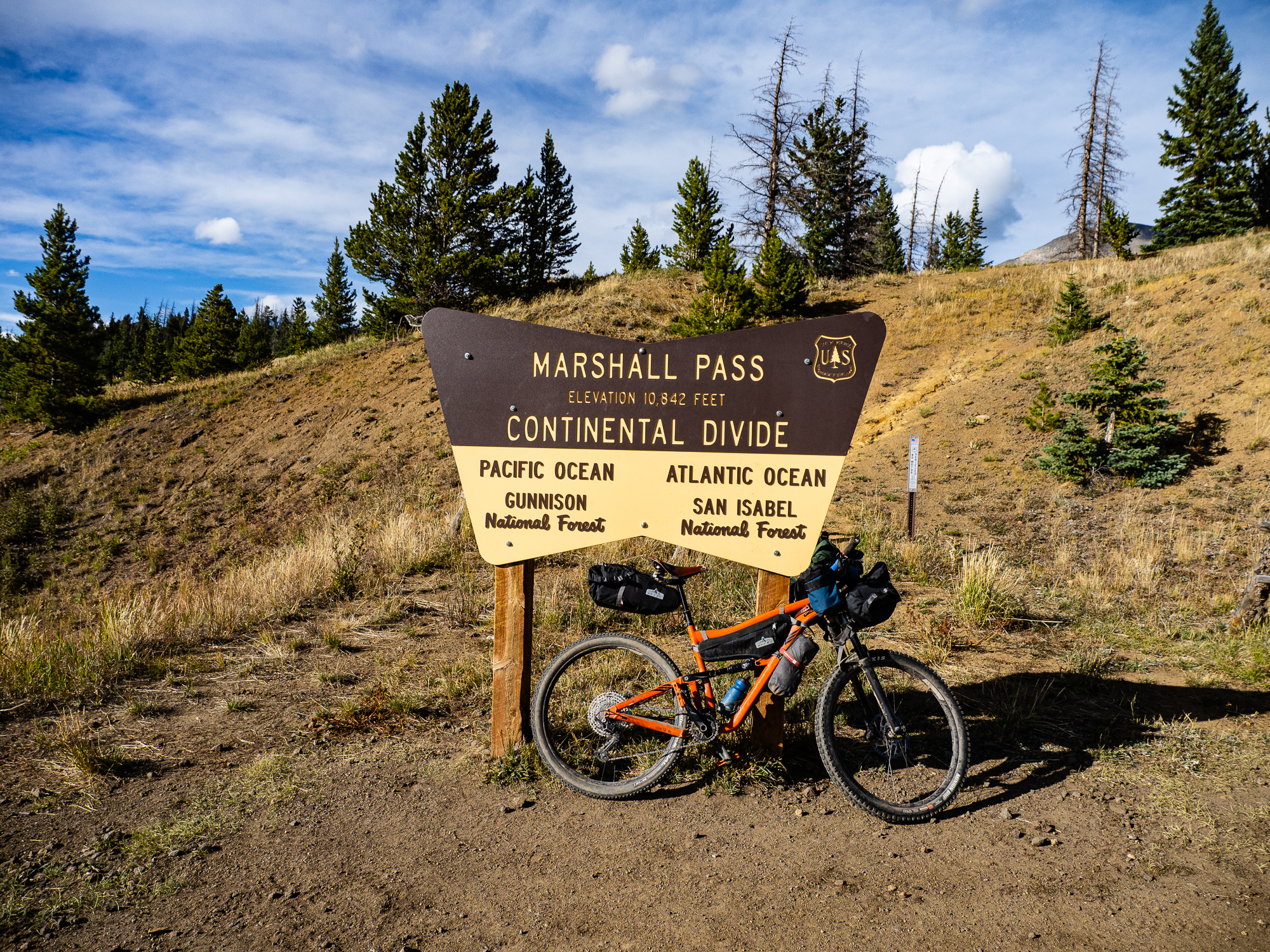 By the time we got going again, Russ and I decided to forego Sargent’s Mesa and take the detour. Dru’s pain was my gain. We enjoyed some splendid singletrack along Monarch Crest. We were treated to expansive views while dramatic clouds threatened rain but mostly failed to deliver. We then turned off the CT and made the long descent to Marshall Pass to the town of Sargent’s. We found a perfect campsite behind at Tomichi Creek Trading Post, which serves as a gas station/general store/bar/restaurant/campground, and settled in. We picked up a couple of beers and a bag of chips, and took advantage of free showers and cheap laundry, all for the low price of $12.