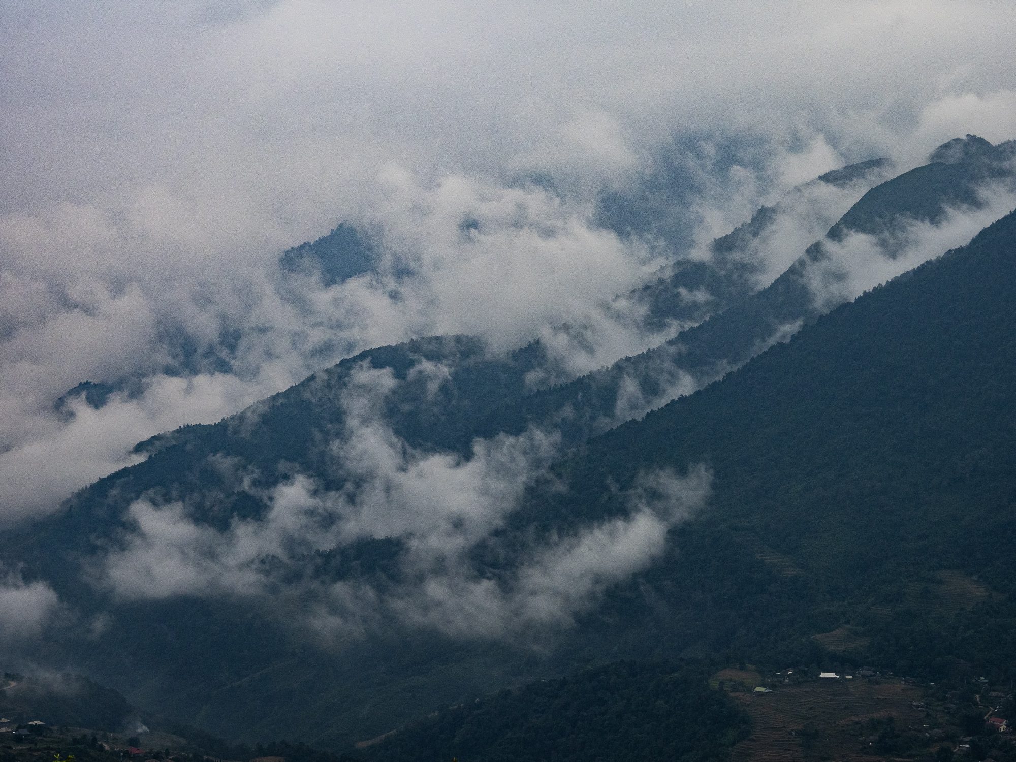 Since the main road was closed, I took the same stupidly steep road to start the day that I took the day before. It rained lightly but steadily as I pushed my upwards. I climbed high above the valley, passing a group of backpackers on a trekking tour on my way up. The clouds obscured the views of Fansipan, but they were still pretty amazing as I gazed down at the terraces far below.
