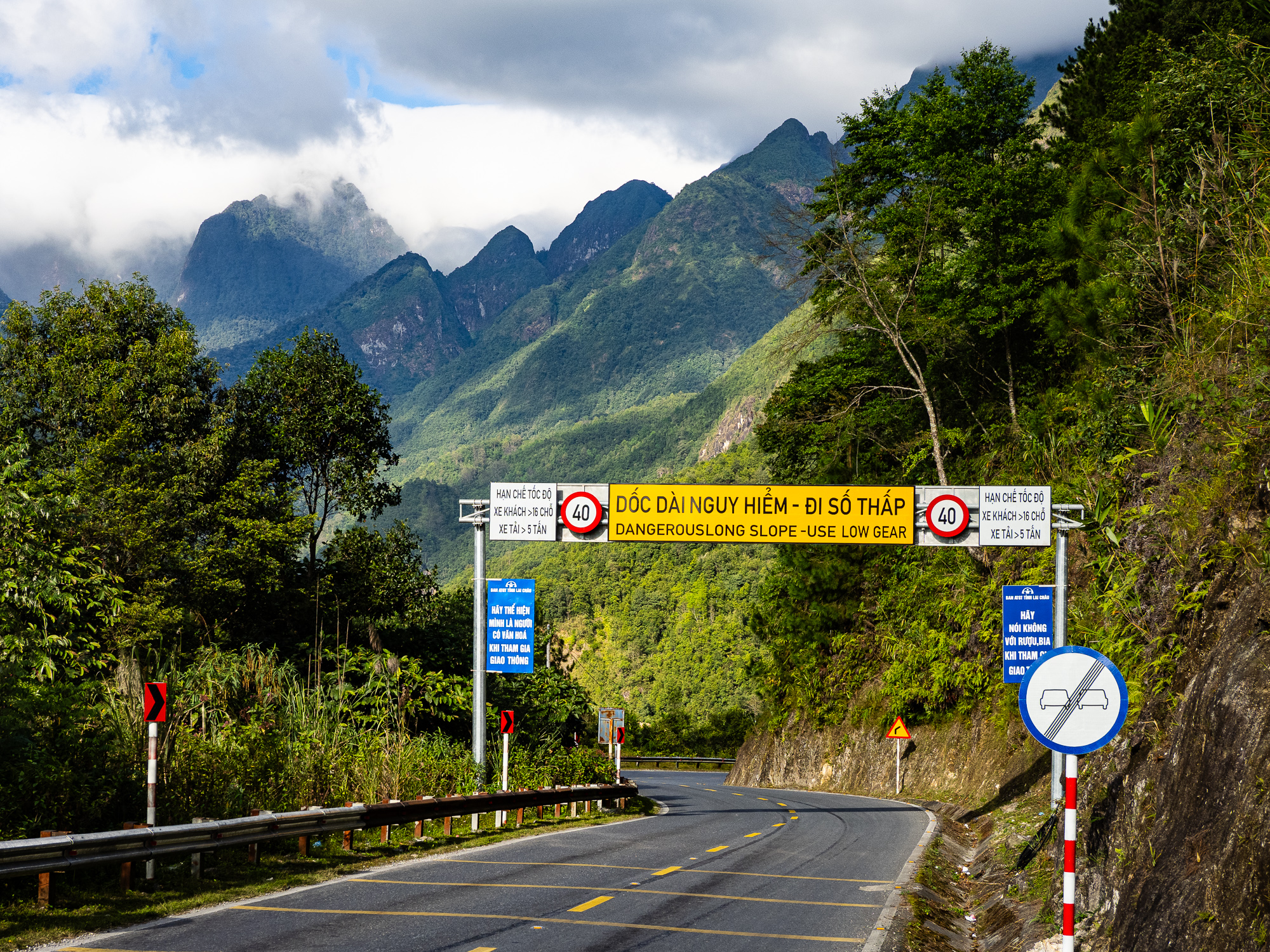 The rain continued as I left Sapa. Fortunately, the main highway was a pleasant grade and I climbed toward O Qy Ho Pass, the highest in Vietnam, in the clouds. At the summit, the clouds broke up and the views down the other side were stunning. A deep valley split the mountains, the clouds breaking apart along the green flanks of the mountain slopes. The highway snaked its way downwards, disappearing into the valley below. I had to pay to enjoy this view, but it was worth it.