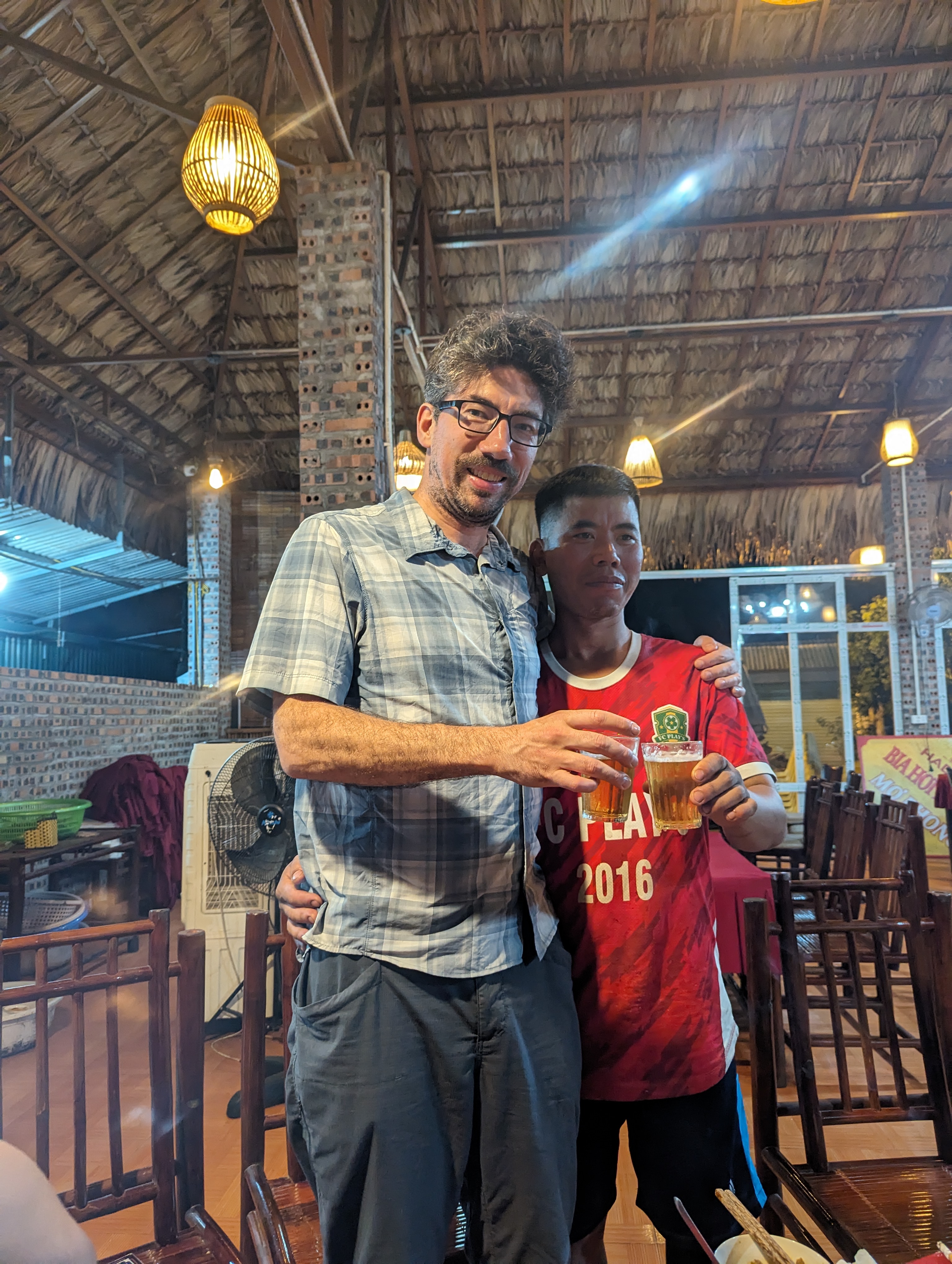 Still hungry, I headed down the road and turned into the next establishment I saw—a beer hall where I knew I could get food. Almost immediately, I was invited to sit down with a group of friends who were out for a celebratory meal after their soccer game. They happily gave me shots of rice wine and challenged me to multiple beer chugging contests (which I handily won). They shared their food with me, which included fried rice, frog, water buffalo jerky, and more. One of them was a teacher and spoke a little English, but mostly we communicated via Google Translate. I’m usually not the type to engage like this, but it was a great experience. They kept trying to give me more shots and more beer, but eventually I convinced them I needed to get up early to ride my bike and they relented. They also invited me to play a game of soccer with them, which I also politely declined. I walked back to my hotel, drank some water, and took a pre-emptive ibuprofen before going to sleep.
