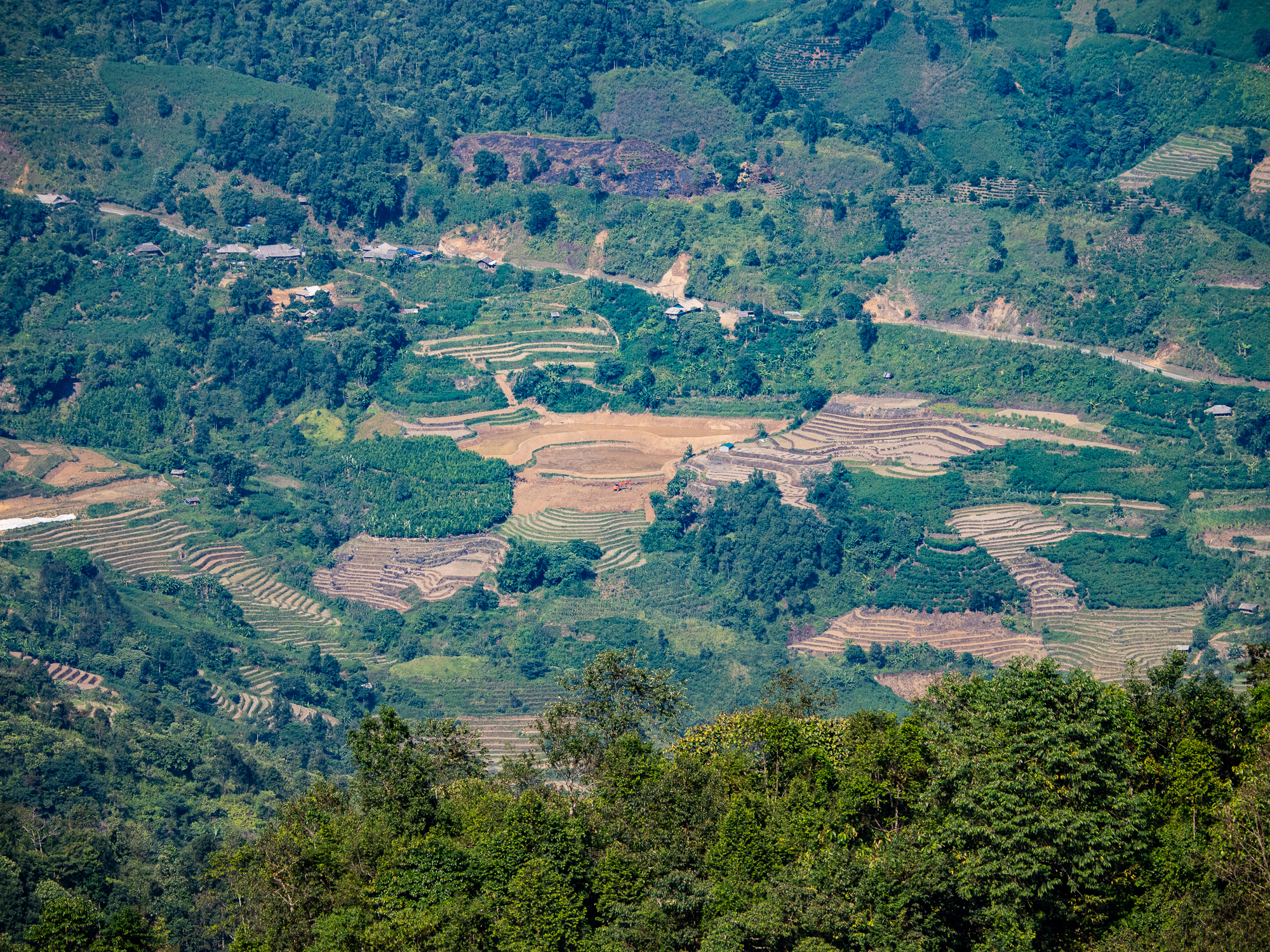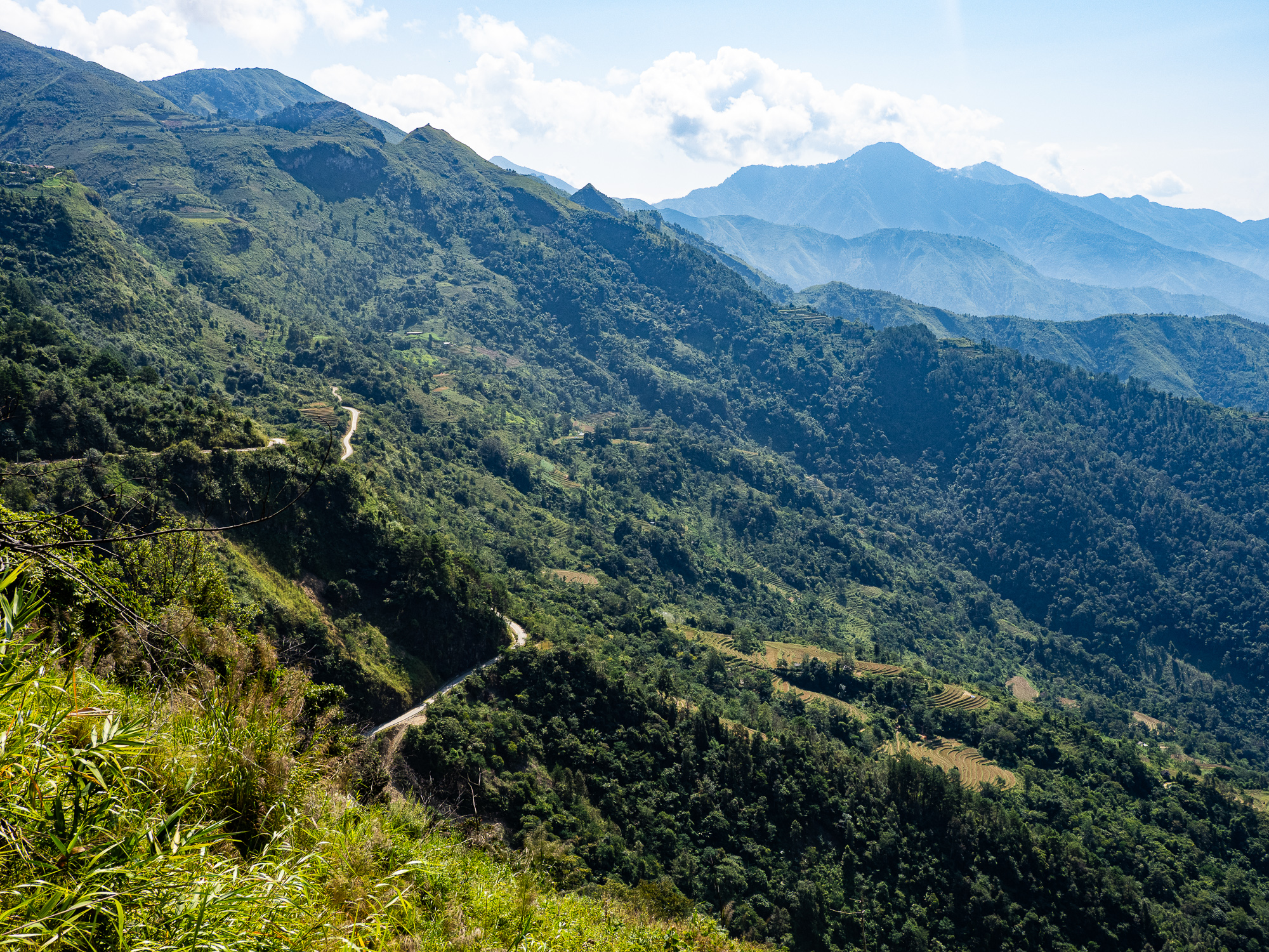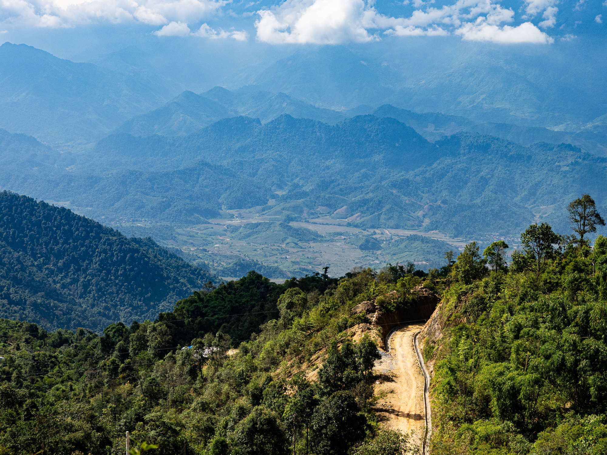 The first climb of the two was mostly forested, but occasionally I could look back and enjoy views back towards Lai Chau. Limestone karst formations surrounded the city, all backed by 3,000 m peaks. A pass at 1,375 m brought me to the west side of the mountains I’d been climbing, far above the Nam Ma River. I descended to a junction where a group of women were set up on the roadside selling various produce. I got a ball of sticky rice wrapped in a palm leaf for lunch, then started on the second climb of the day—a 900 m grunt up to Sin Ho. It was never too hard and I slowly ticked away the kilometres, the cool temps in the mountains a welcome reprieve compared to the previous day. At one point I attempted what I thought would be a scenic detour, only to turn back when the track turned into a steep dirt trail. Back to the highway it was.