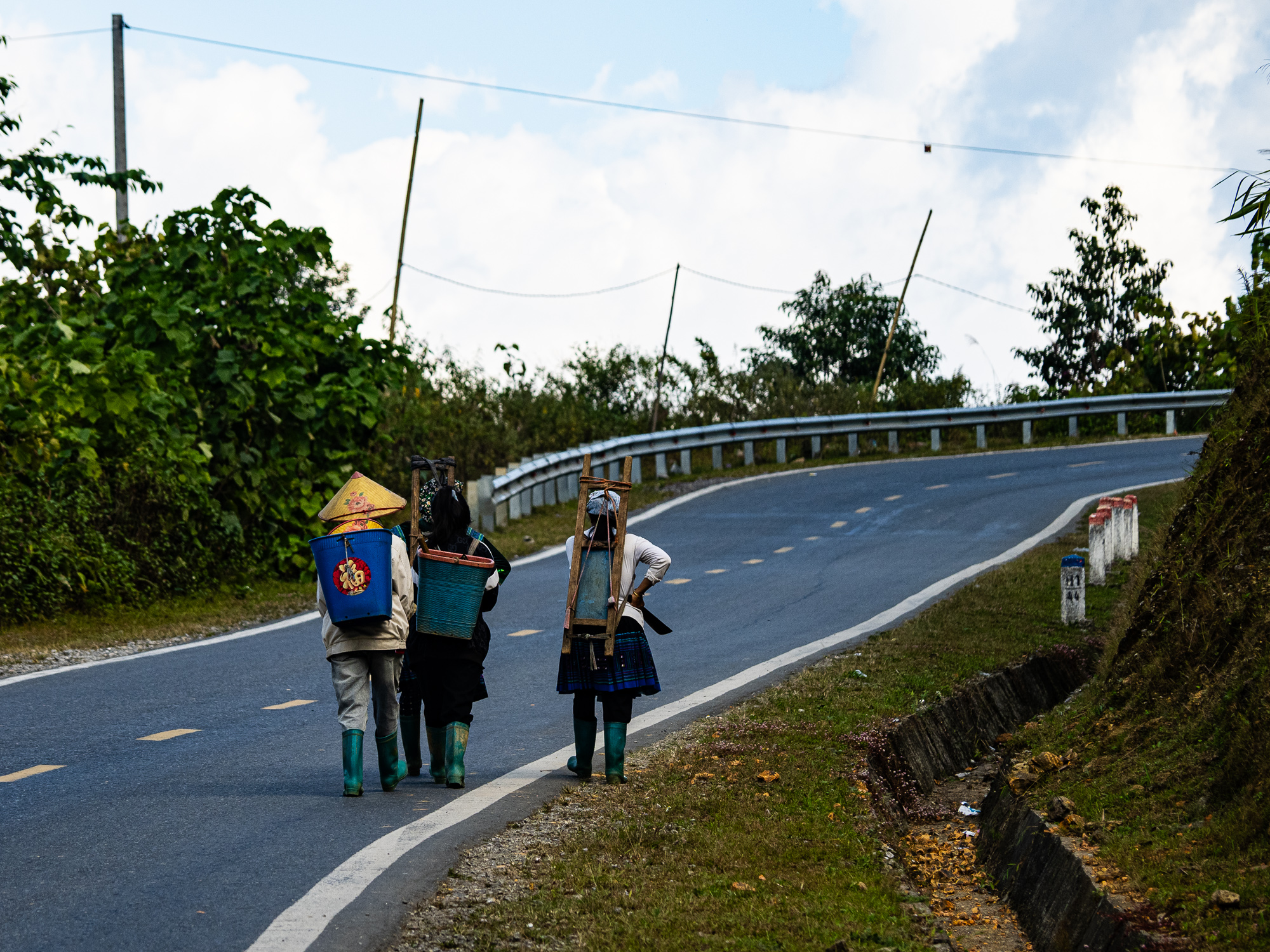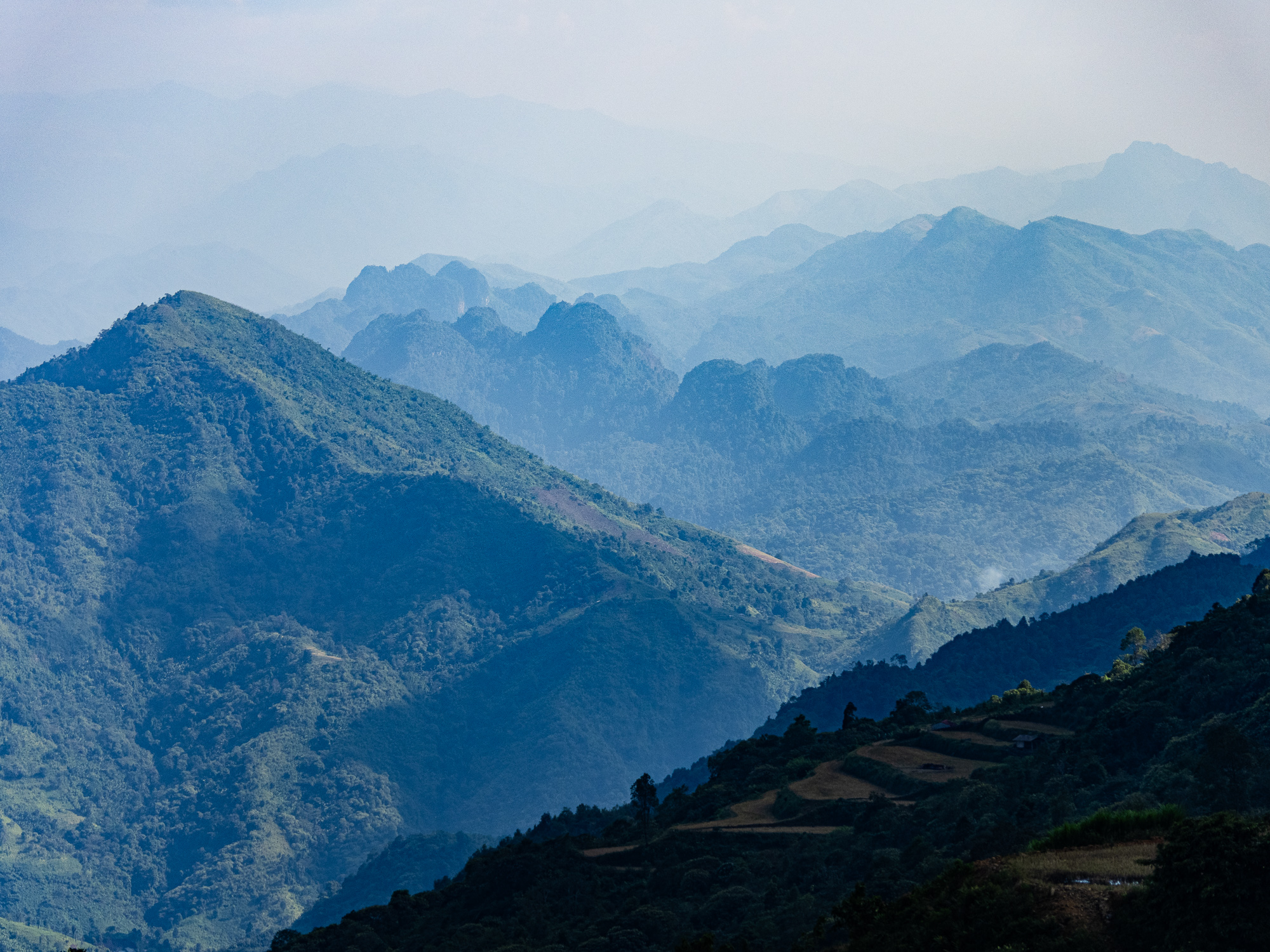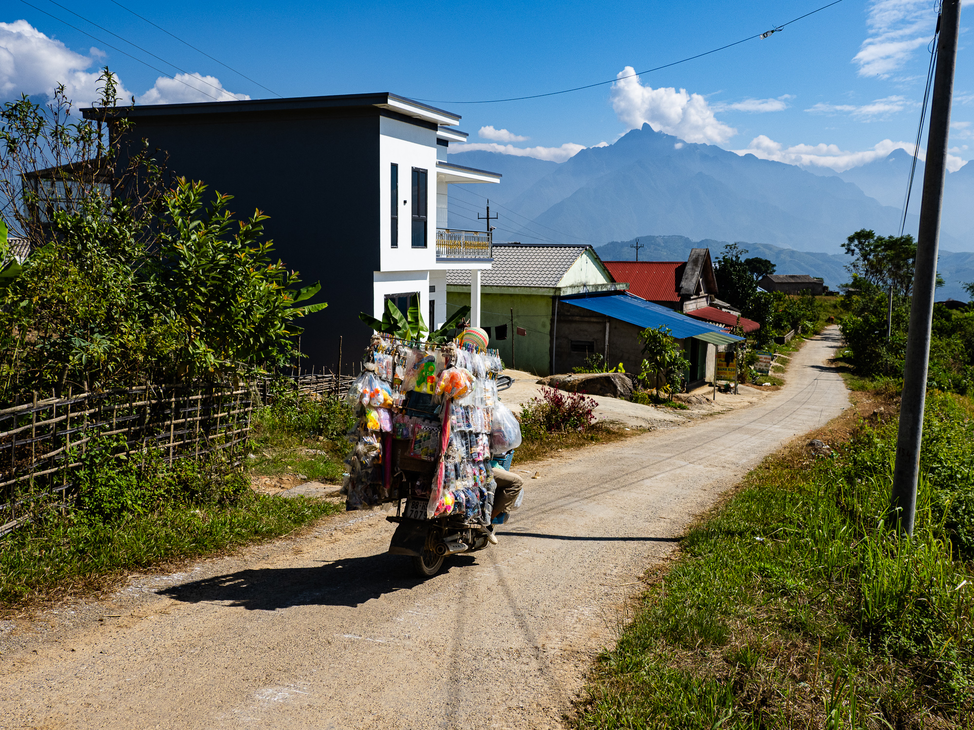 The first climb of the two was mostly forested, but occasionally I could look back and enjoy views back towards Lai Chau. Limestone karst formations surrounded the city, all backed by 3,000 m peaks. A pass at 1,375 m brought me to the west side of the mountains I’d been climbing, far above the Nam Ma River. I descended to a junction where a group of women were set up on the roadside selling various produce. I got a ball of sticky rice wrapped in a palm leaf for lunch, then started on the second climb of the day—a 900 m grunt up to Sin Ho. It was never too hard and I slowly ticked away the kilometres, the cool temps in the mountains a welcome reprieve compared to the previous day. At one point I attempted what I thought would be a scenic detour, only to turn back when the track turned into a steep dirt trail. Back to the highway it was.