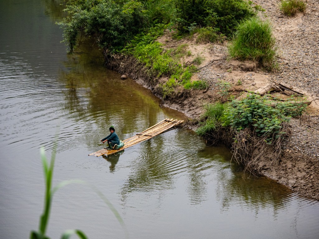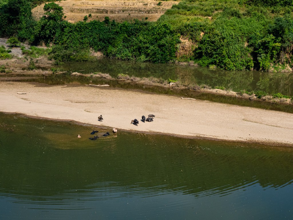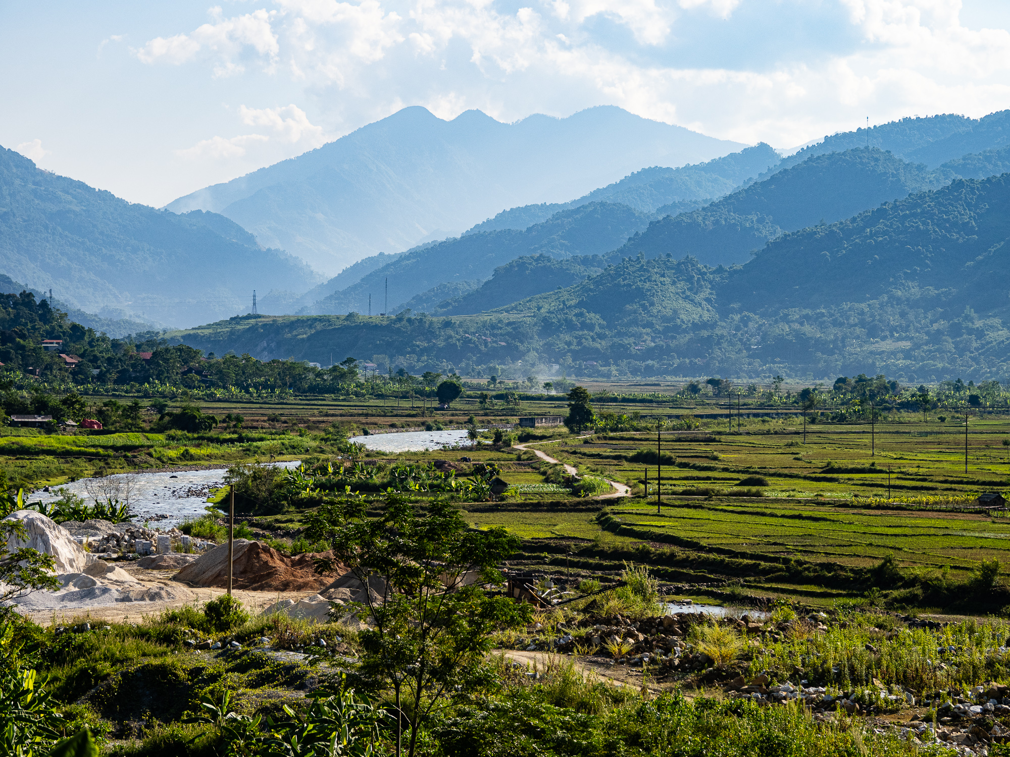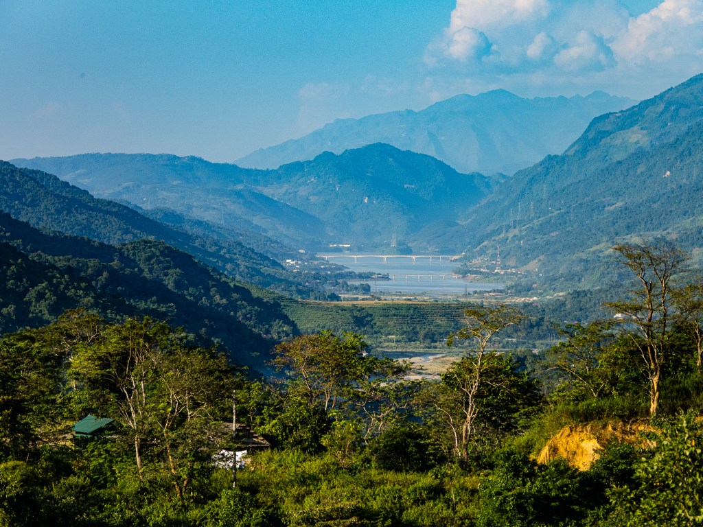 I got a late start due to a work meeting and didn’t leave town until 10 a.m. The road out of Sin Ho was under construction and made for an unpleasant start to the day. I love dirt road touring, but navigating dusty construction zones is another matter. The road was still open, but eventually I hit a proper closure and waited along with dozens of other motorcyclists. When the road finally opened, I waited until they could pass and the dust could settle. Not long after, I was back on pavement and a 1,300 m descent to the Nam Ma River. It was a beautiful ride, with vast mountain views and almost no traffic save for a few motorcycles, cows, and goats.