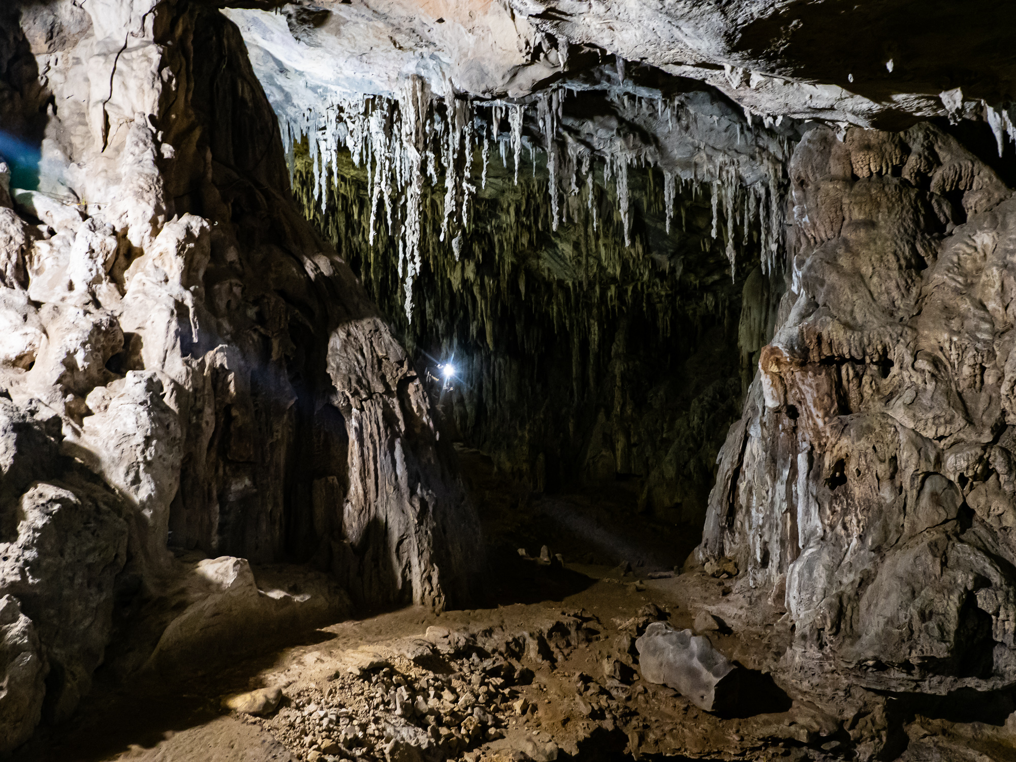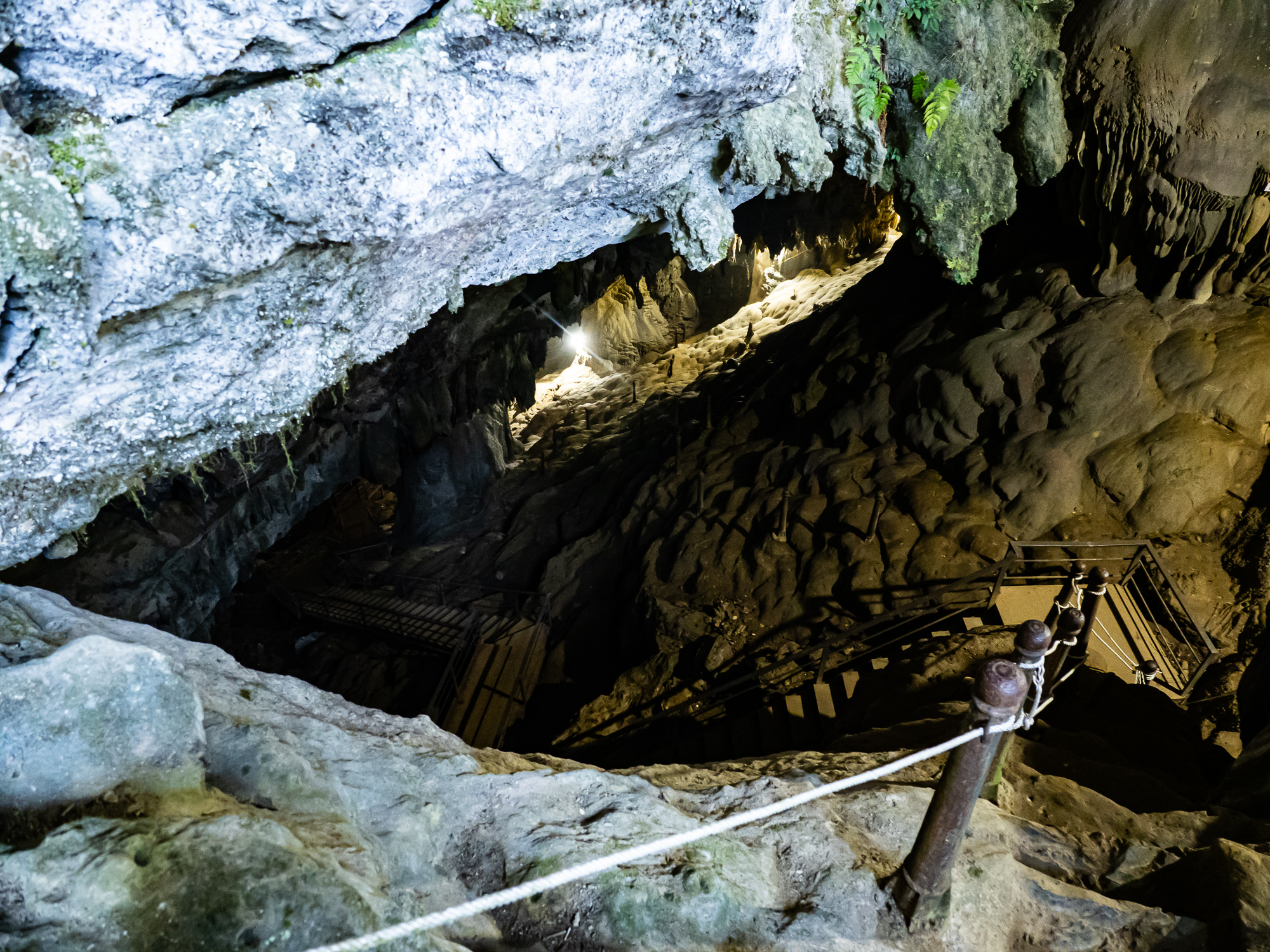First, I stopped to check out a local cave. Vietnam’s limestone mountains have been eroded for millennia and caves abound. This one, Pu Sam Cap, was supposed to be one of the better ones. I was greeted at the entrance by a man who didn’t speak English. Using a mix of gestures and photos, he explained how to turn on the lights to the far cave, handed me a map, and sent me on my way. I grabbed my headlamp just in case. The first cave was right off the highway and I impressed by how vast it was. This wasn’t anything like the cramped caverns I had experienced elsewhere. Massive stalagmites and stalactites grew from the floor and ceiling. The pathway made it out the other side and took me uphill to the second cave, where I found the light switch and went in. I descended some steep metal stairs into the heart of the main hall. From here, I was able to explore semi-freely, careful not to get hurt as I navigated the slick, rocky ground.