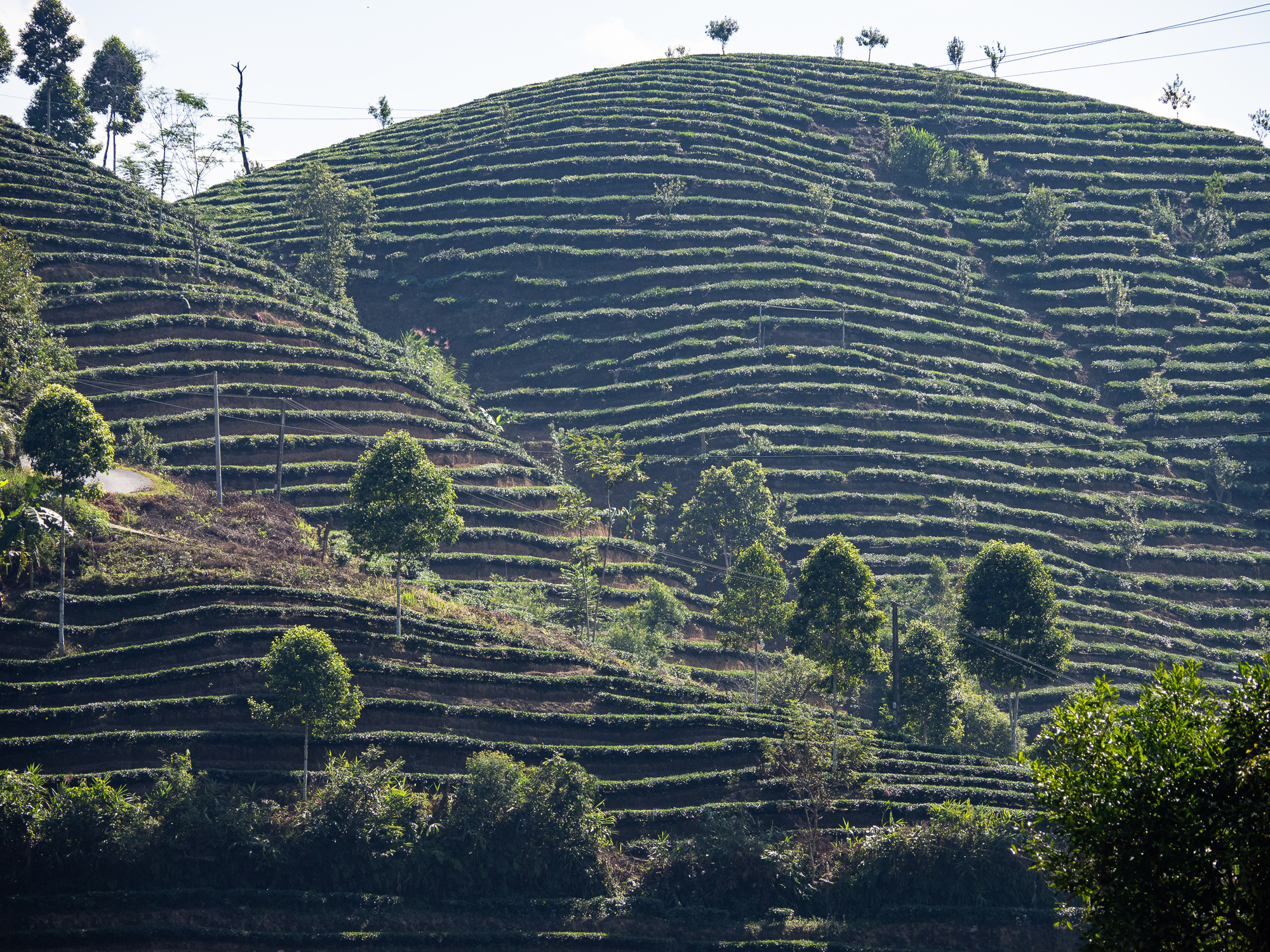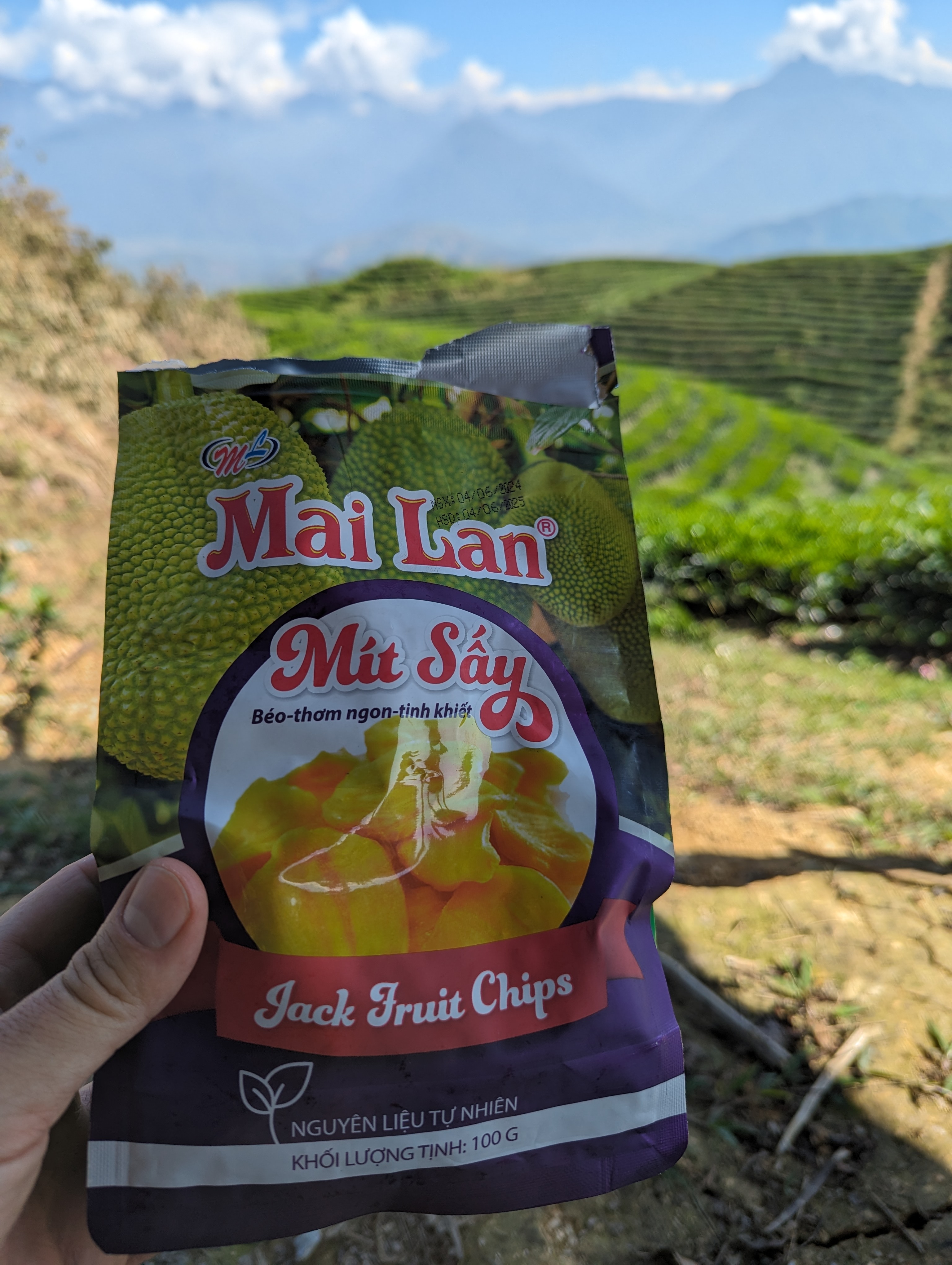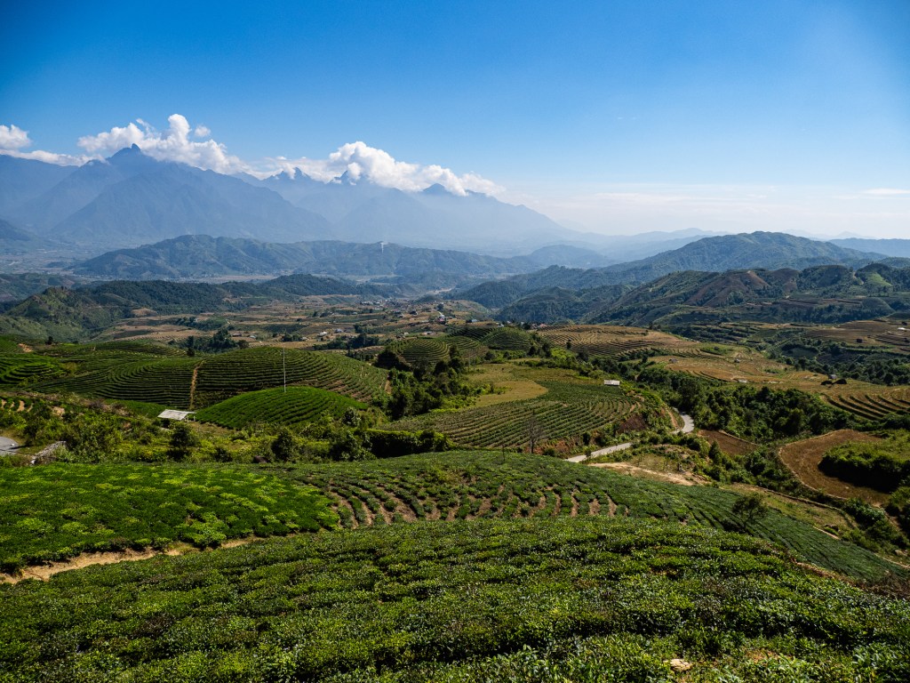 As I hit the road, the sky brightened as the fog faded. By the time I turned off the main highway, the mountains were back in view. It was a gorgeous morning as I pedaled along quiet backroads through endless tea fields. While the rice harvest was over, the tea plantations were in full bloom and I enjoyed cycling through rounded hills with row upon row of tea bushes. As I climbed slowly out of the valley and into the mountains, the views became more expansive and dramatic, the tea plantations backdropped by the towering Hoang Lien Mountains. I founded a shaded wooden platform to have a snack and enjoy the view.