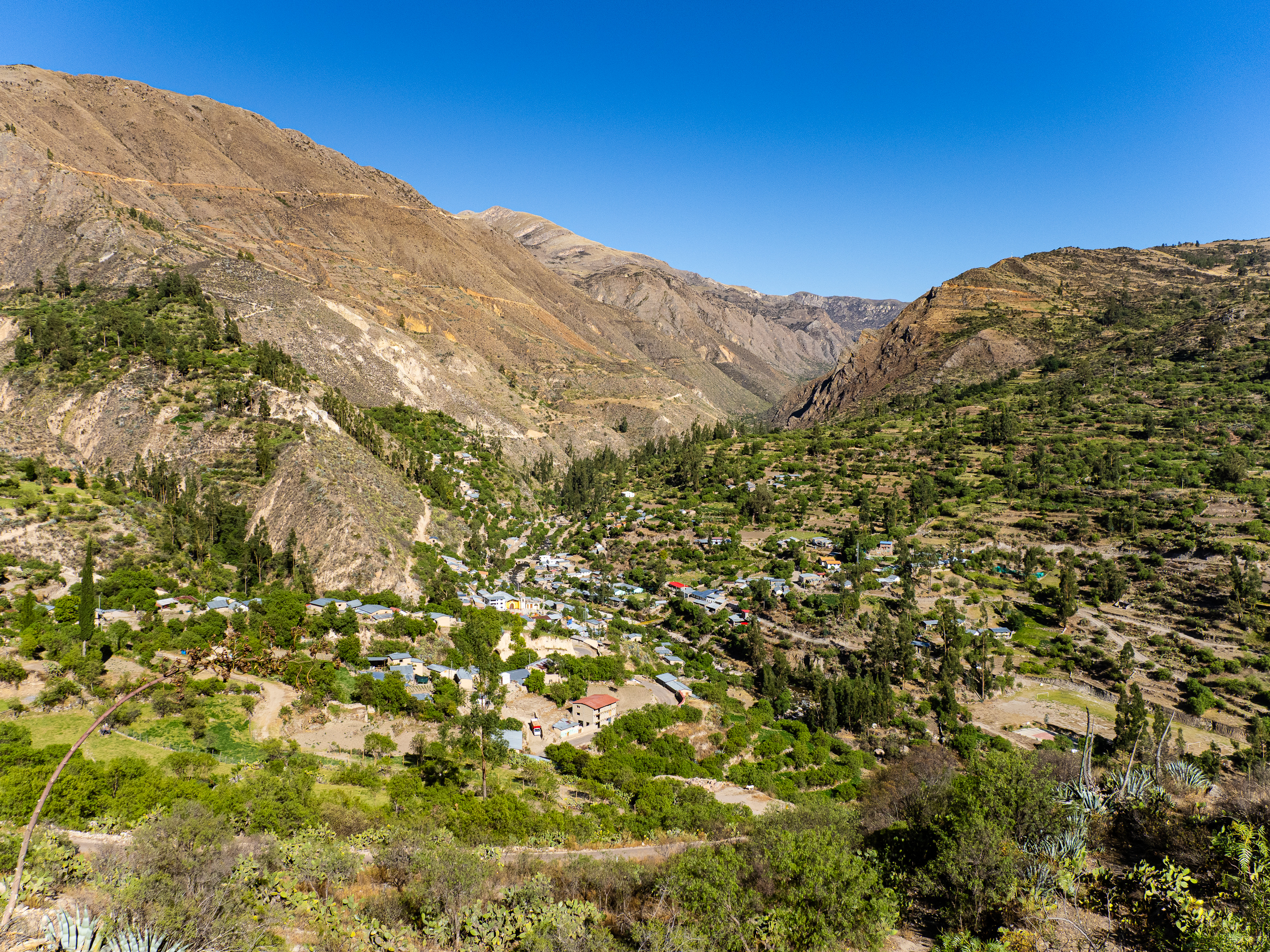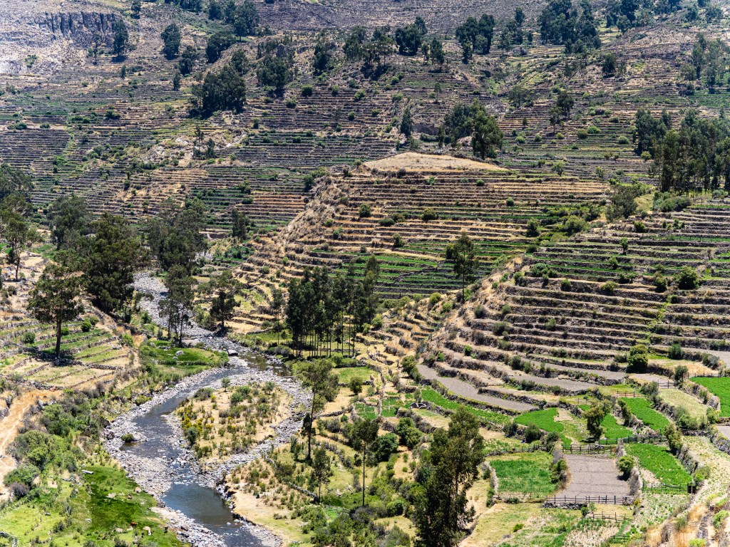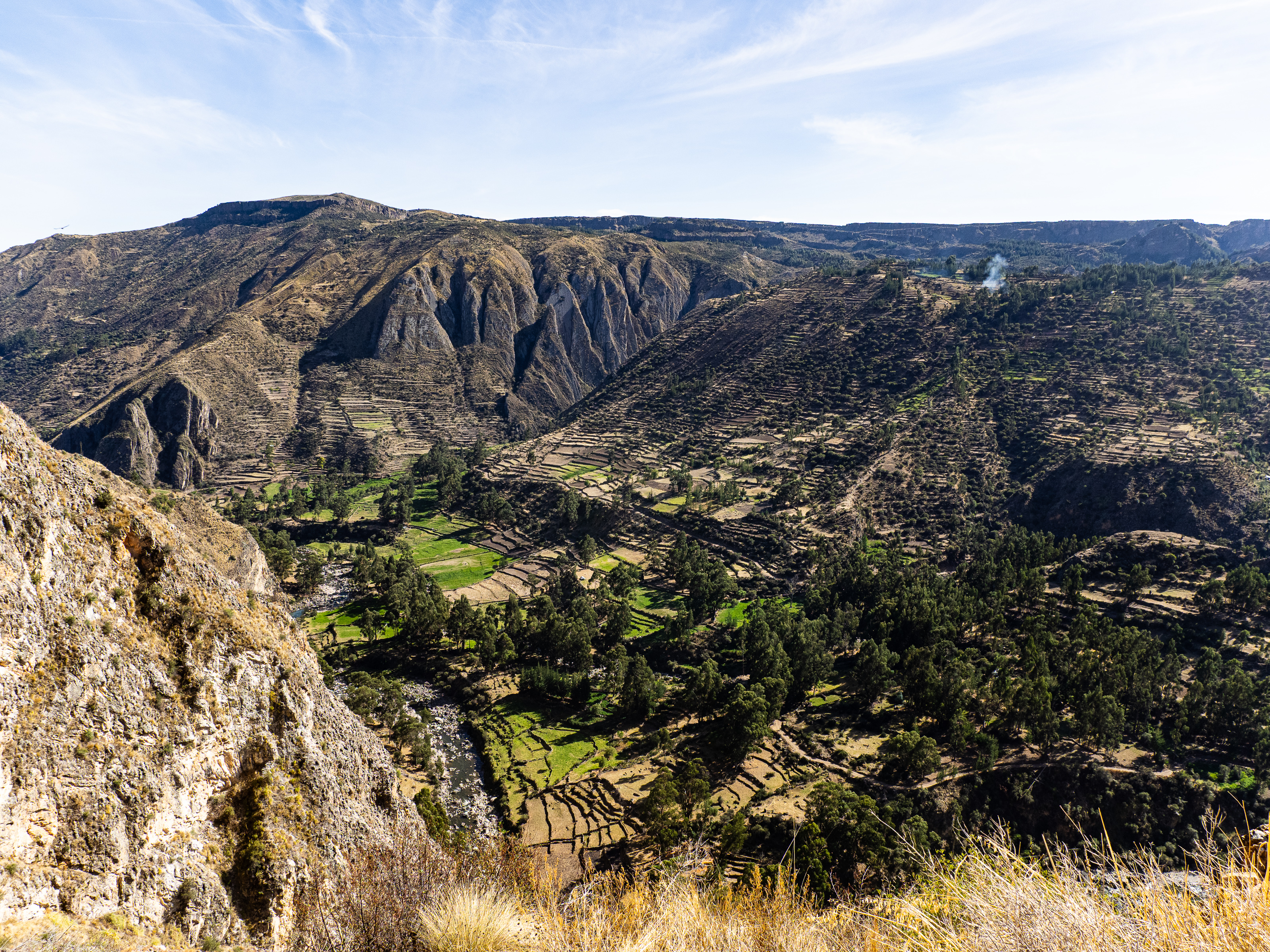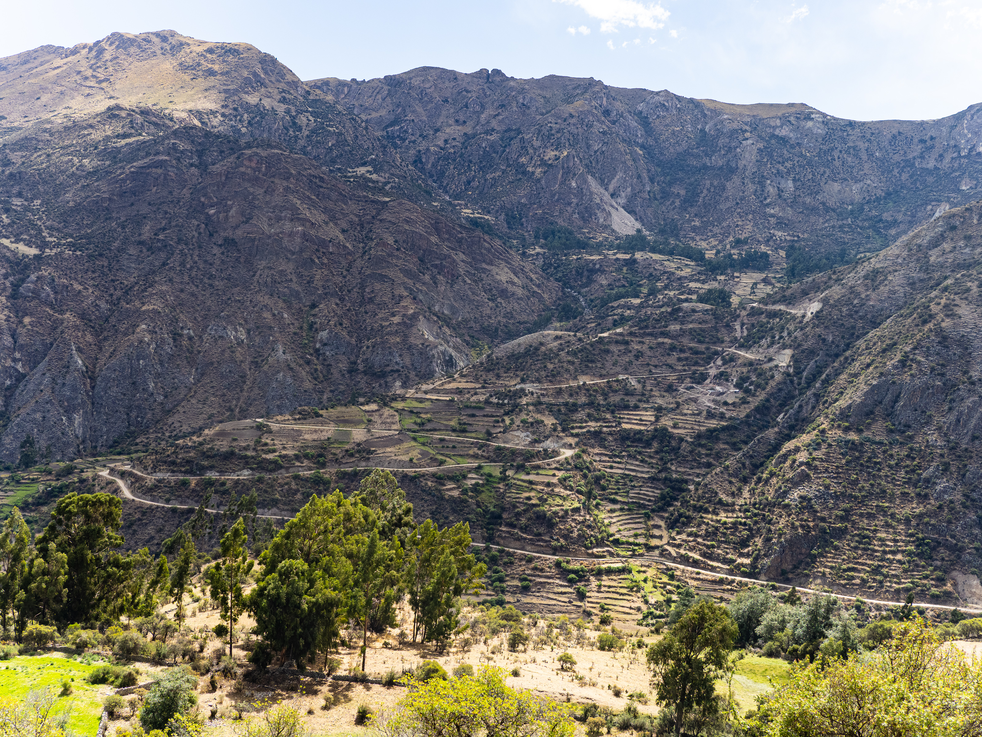 I was extremely happy I did. The valley I entered was filled with curious geological formations, eroded hoodoos, slot canyons, steep cliffs, and colourful rock formations. I passed by a remote ranch and followed the road along the reaches of the upper canyon before passing through the isolate village of Santa Ana and descending steeply to the river below. There was no easy path along the river and the road climbed steeply above it before finally descending to the town of Luren. There, I lay back in the plaza before I finally found the owner of the only hospedaje in town. The alternative was beginning the 900m climb out of town and hoping to find a place to camp, but I was already pretty tired so I stayed put. The room was as barebones as it gets, but the bed was decently comfy and it was cheap.