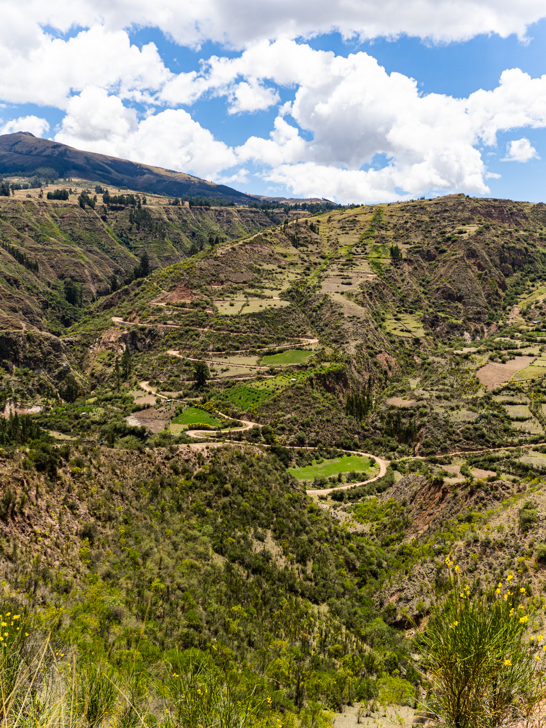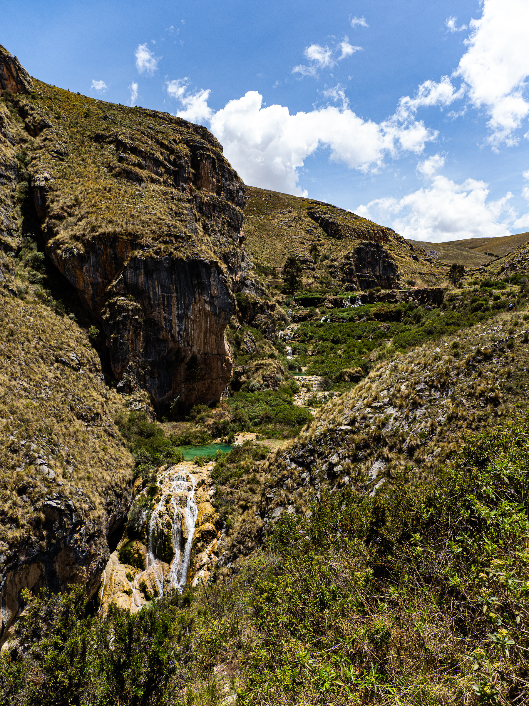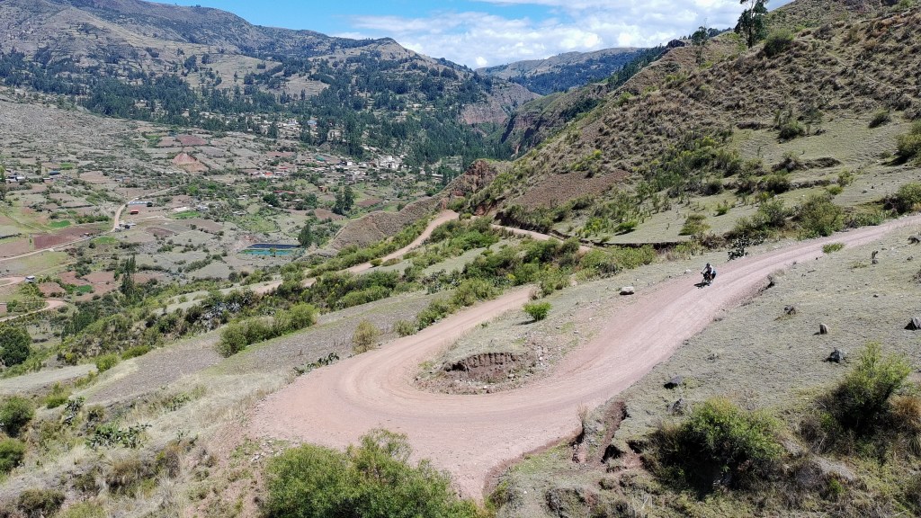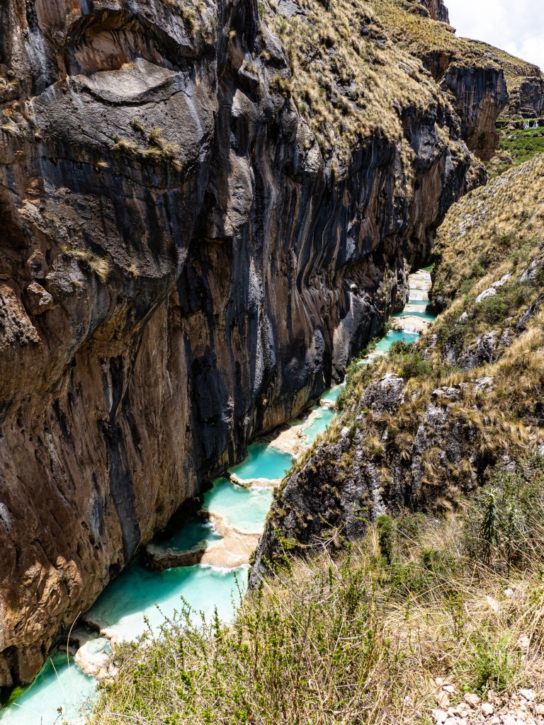 The next morning, I took off uphill and began the long climb towards Aguas Turquesas Millpu, a site known for it’s spectacular series of turquoise pools tucked beneath towering limestone cliffs. It’s pretty off-the-beaten track, but is somewhat famous on social media and I wondered if it match the hype. To get there, I had to climb nearly 1,200 m over 24 km. The first 9 km was on nice pavement, but then I turned onto a rough dirt road. I was pretty surprised the route to a well-known tourist attraction was this potholed. I climbed higher, passing through the small village of Huancaraylla. From there, the road dropped, then began a steep series of switchbacks to Circamarca and onwards towards Millpu.