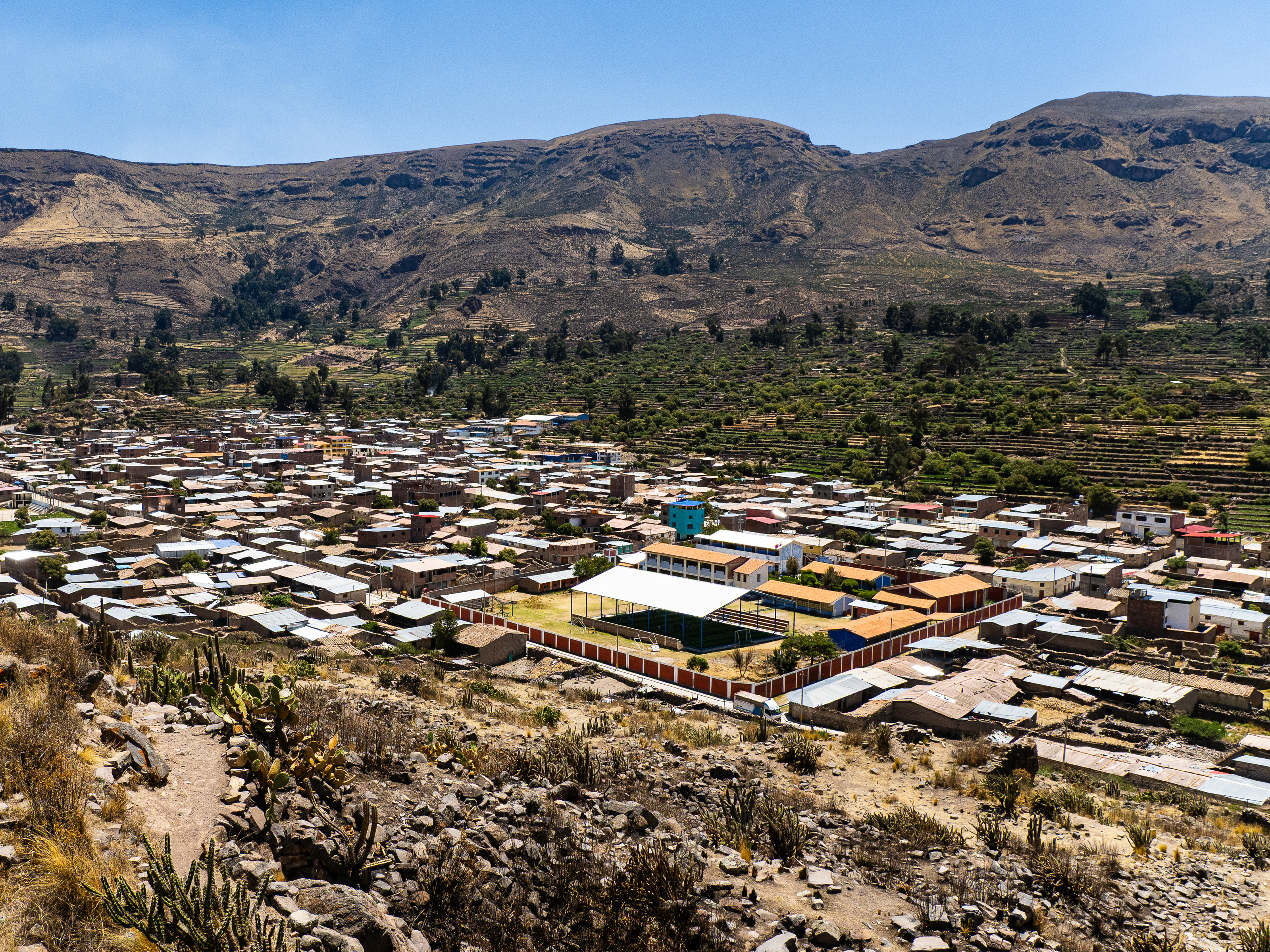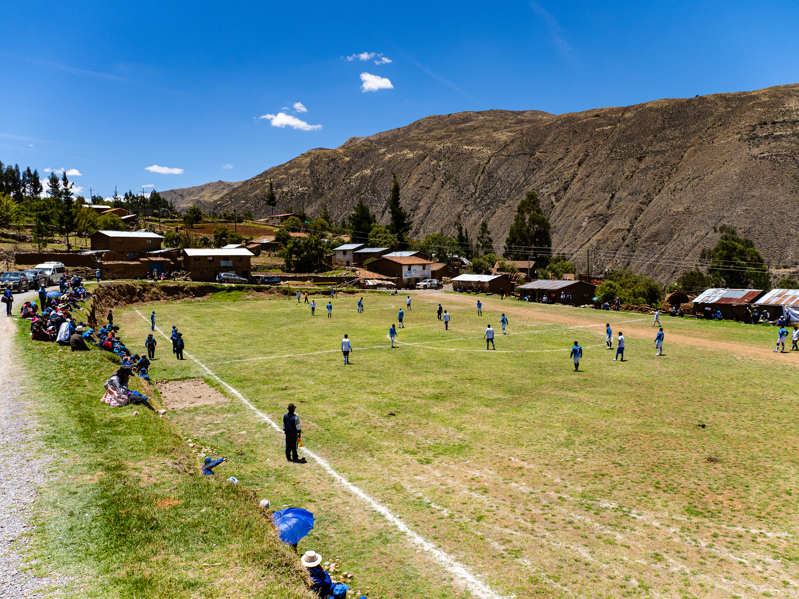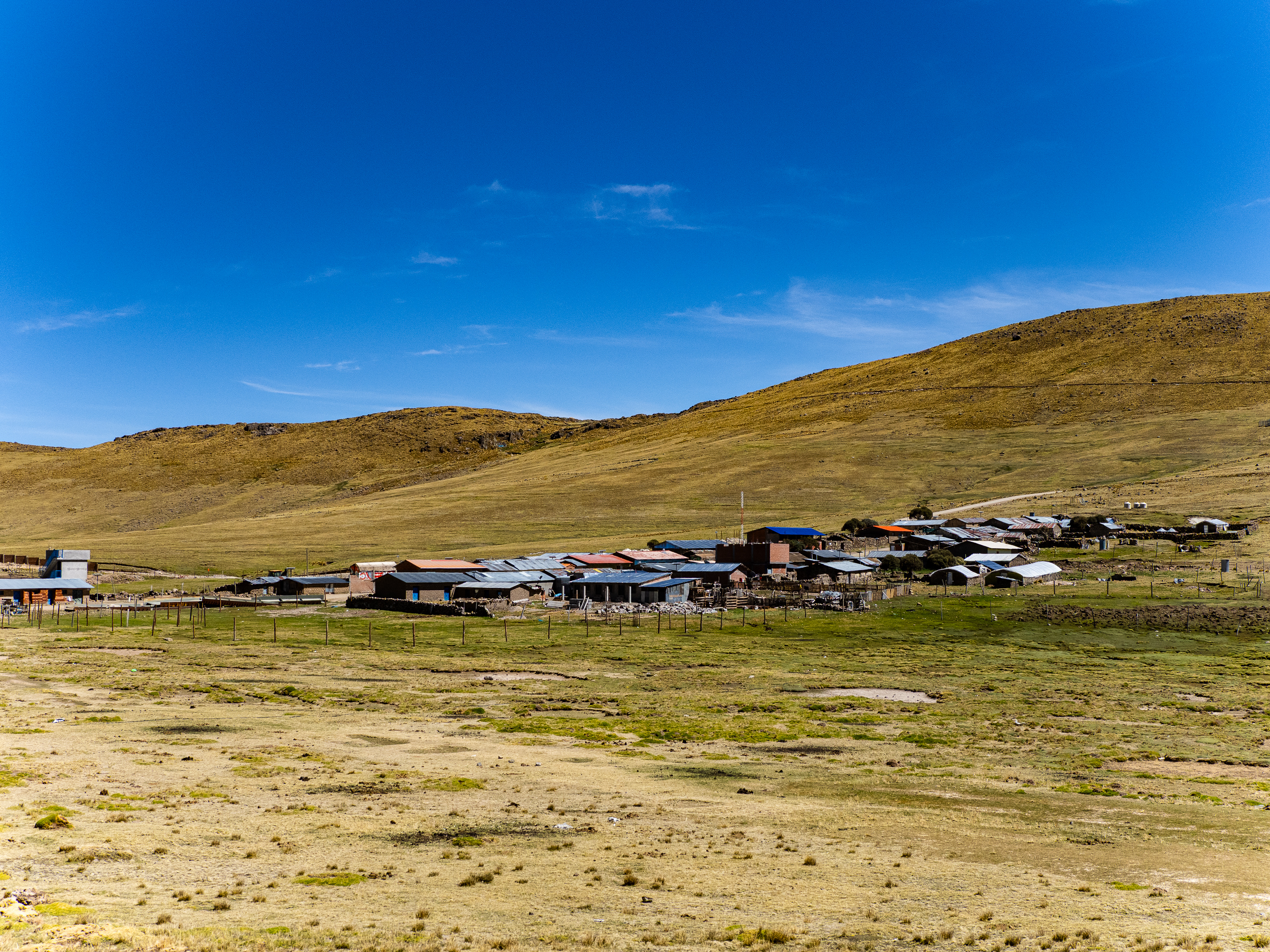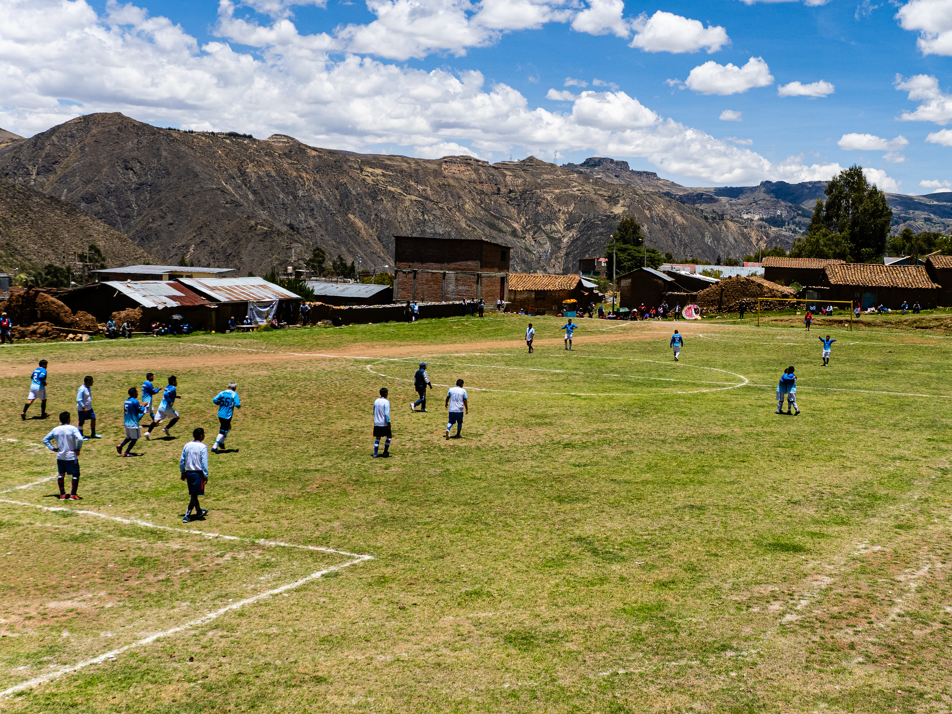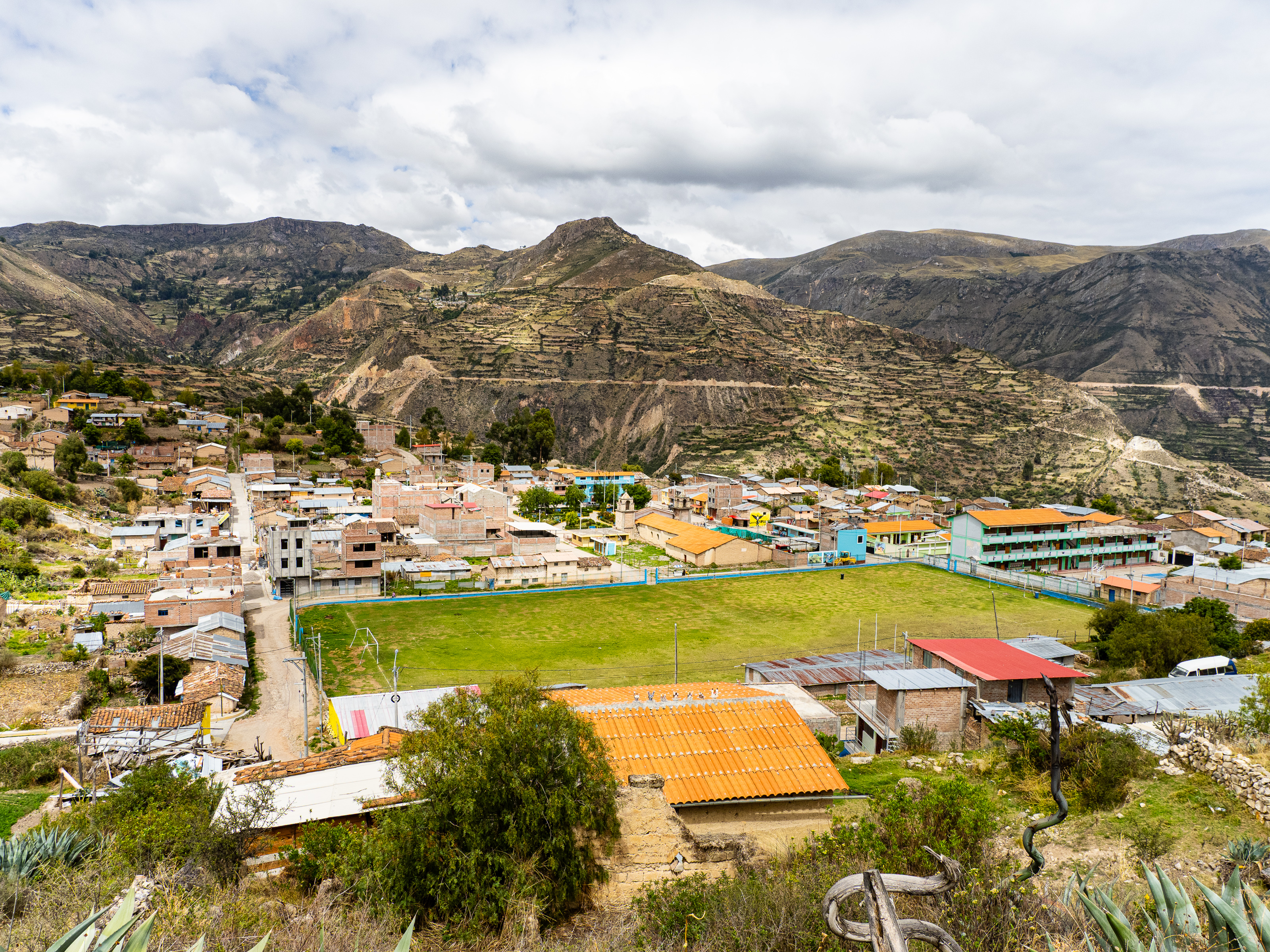 The next morning, I continued my ride across the plateaus, then ascended to a 4,400 metre pass. I descended through a colourful landscape to the village of Carapo 1,200m below, where the whole town was gathered for a soccer game. I found a restaurant in town and had lunch while the owner told me of her dreams to leave Peru for either Spain or the United States. Sadly, she didn’t see any future in her country.