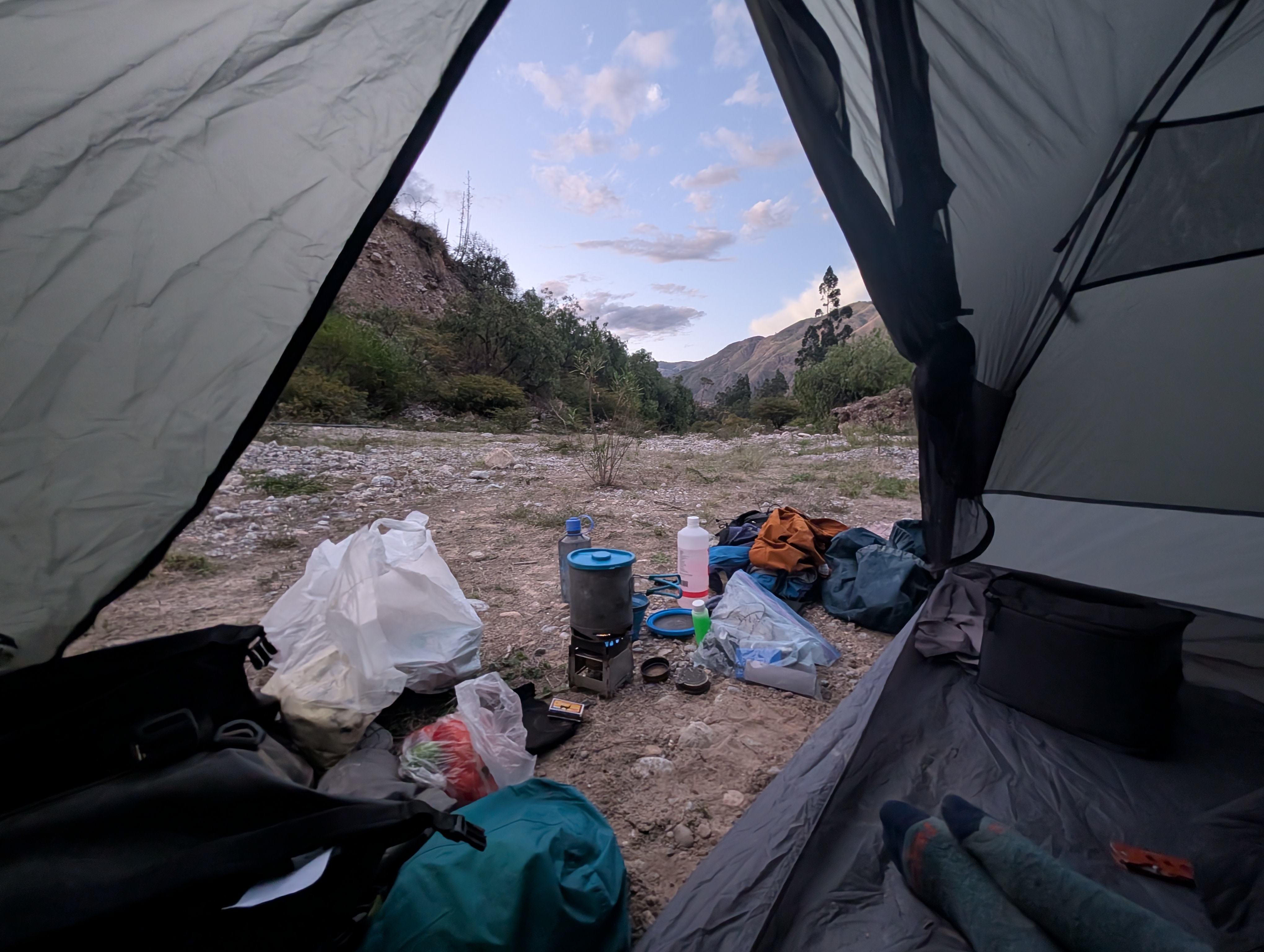 That’s where things got interesting. There’s no way to sugarcoat this, but a little earlier, I took a bit of a messy roadside poop (my body was doing fine, but my stomach less so). As I was setting up camp, an elderly Quechua woman walked down the road past my spot, but seemed to ignore me. She disappeared around the corner, so I went to wash myself off in the creek. I got back to my tent and changed with the fly open, thinking I was alone. Suddenly, I hear some high-pitched shrieking. The woman was standing on the hillside across the creek and was watching me change. She was yelling in Quechua and didn’t seem to understand my attempts to communicate in Spanish. I tried telling her I was just camping for the night and kept saying, “No Quechua.”
