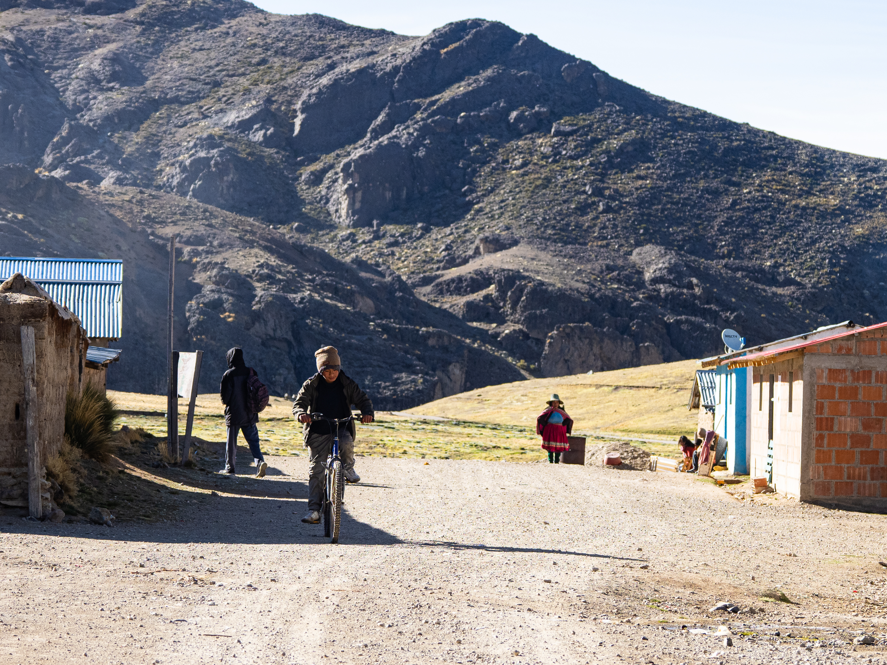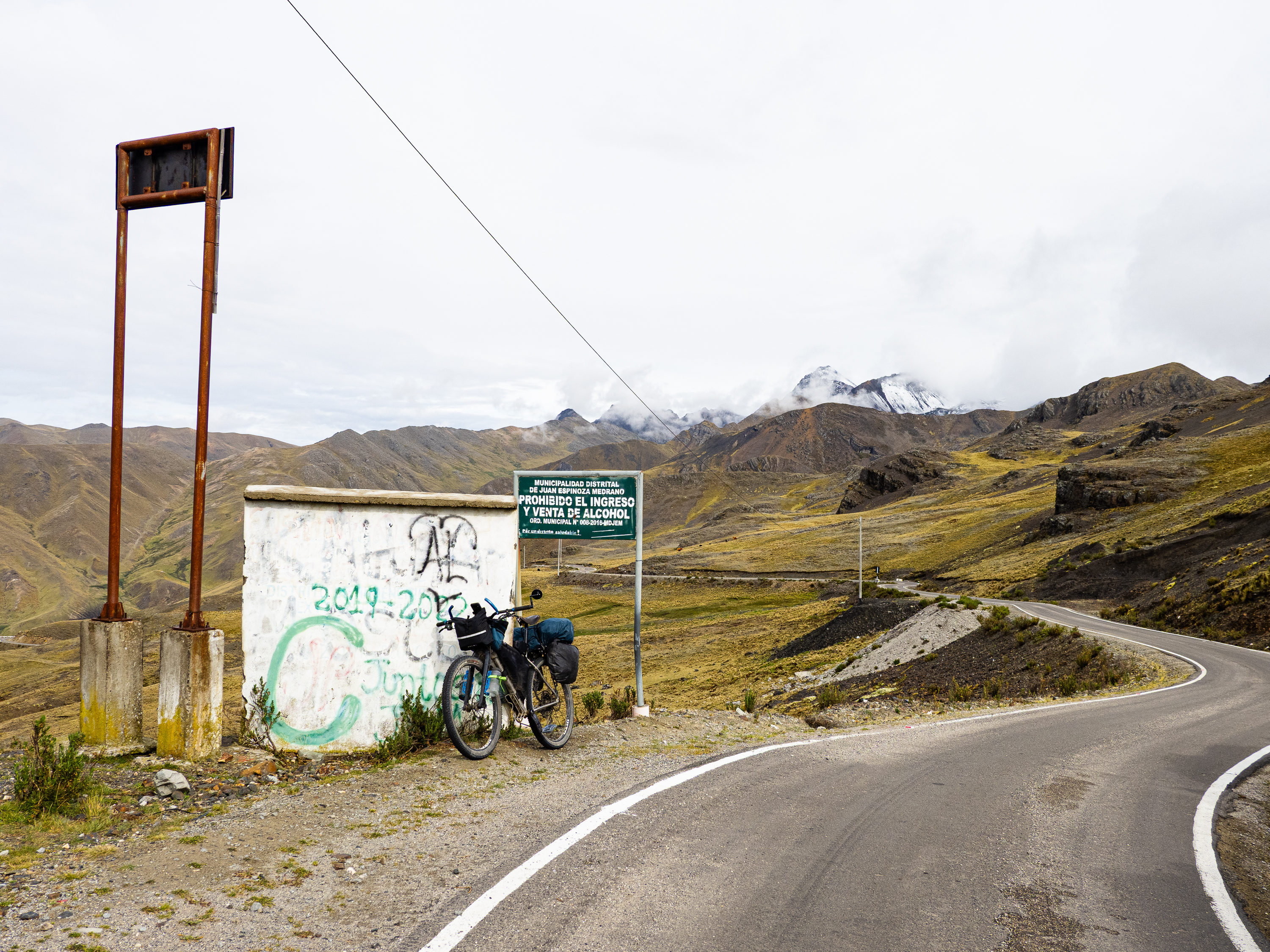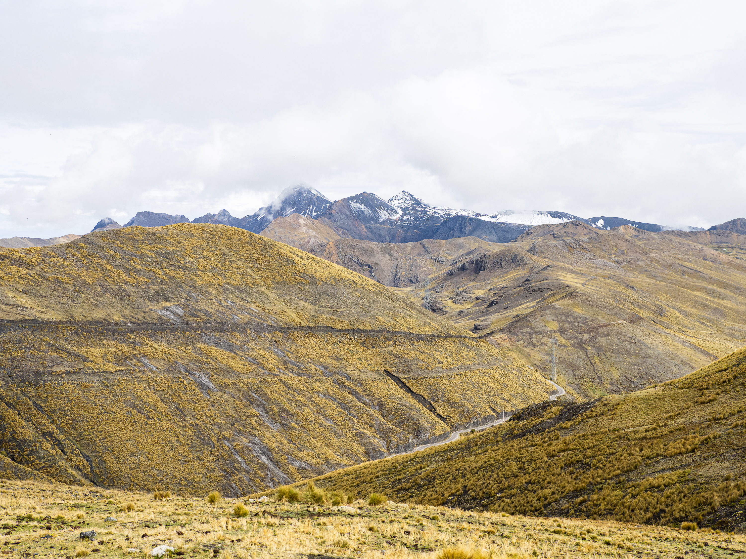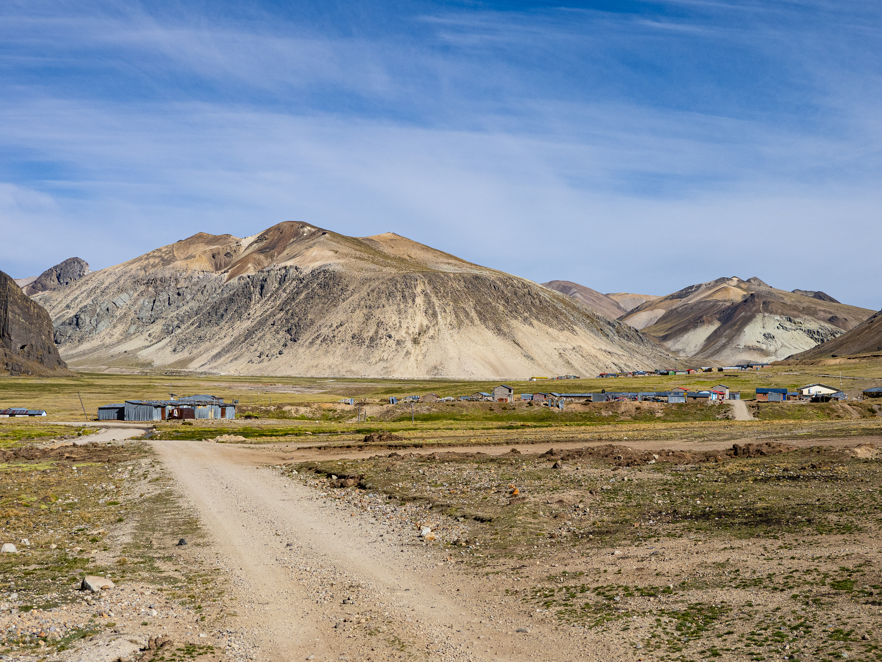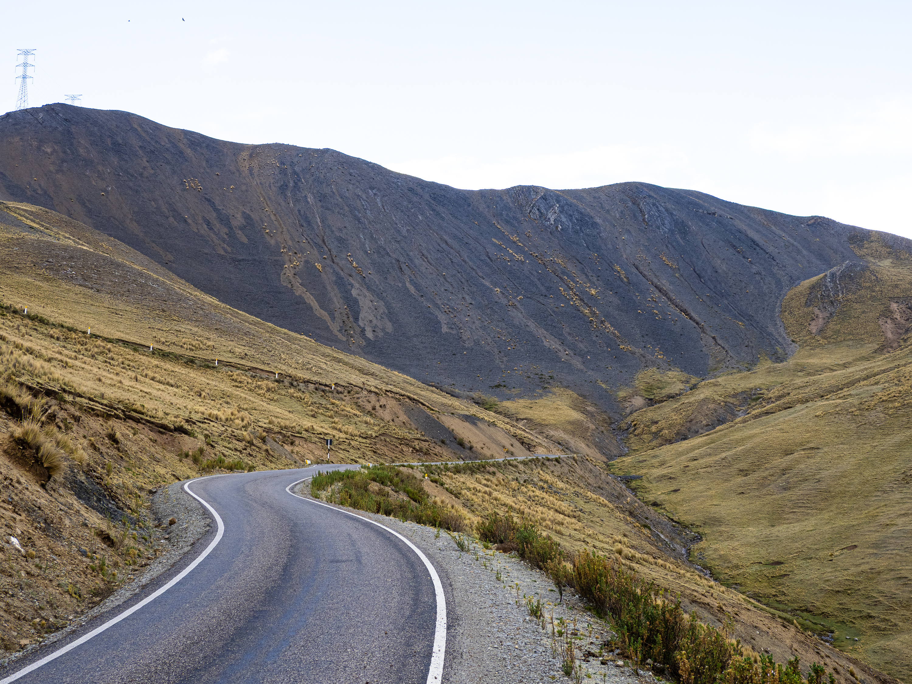 I had a cold sleep at 4,500 metres. I woke up to clear skies and a rising sun casting a luminous glow on the valley. I said farewell to my hosts and climbed back to the plateau, cycling around a pyramidal peak and eventually reaching the main road through this region. After a few days of isolation, I would now be joined by periodic trucks rumbling back and forth to the region’s massive mines. It was a pleasant ride on a well-graded road, with no major climbs, but the altitude – 30 km above 4,600m – did slow me down a little.