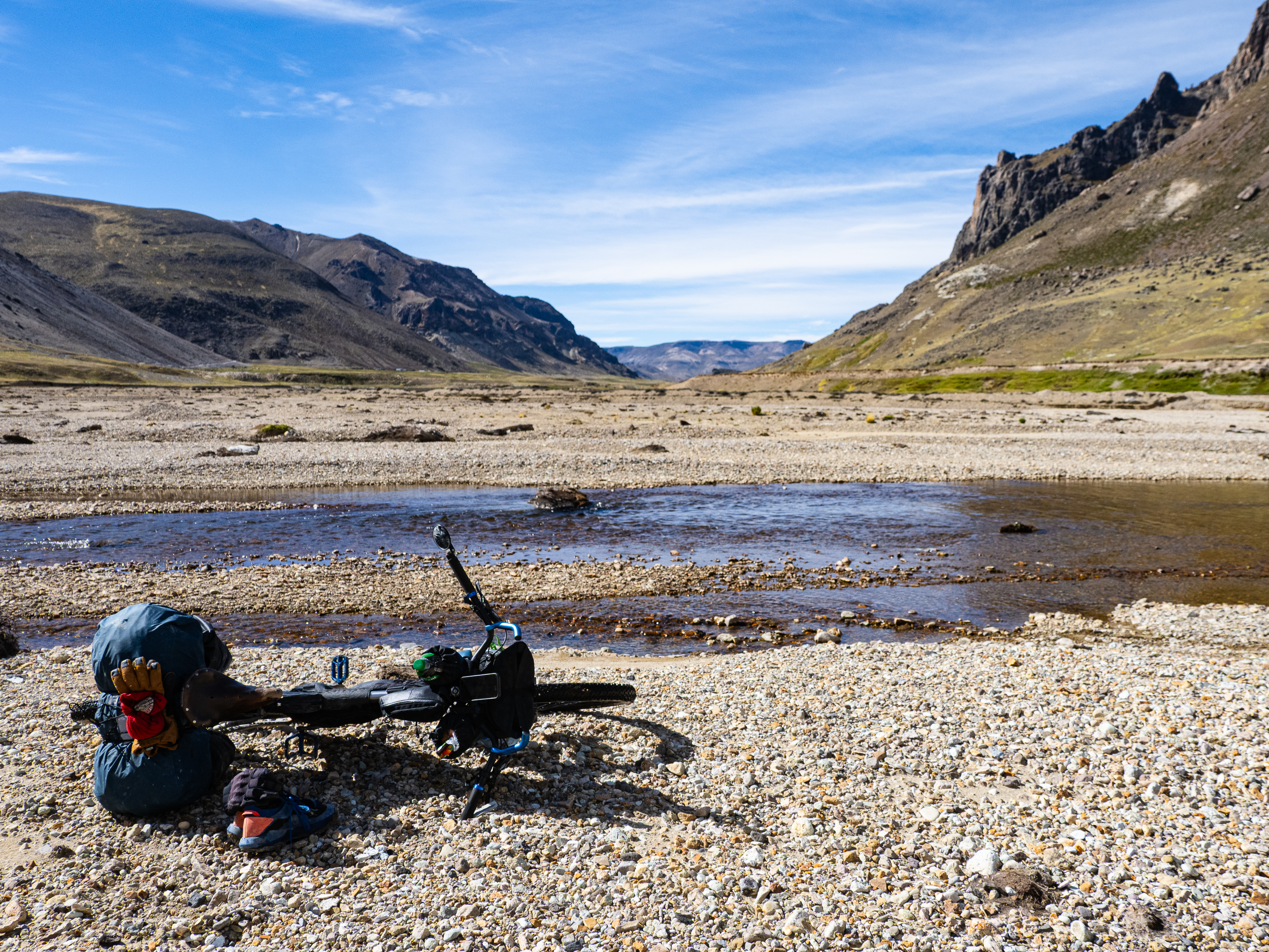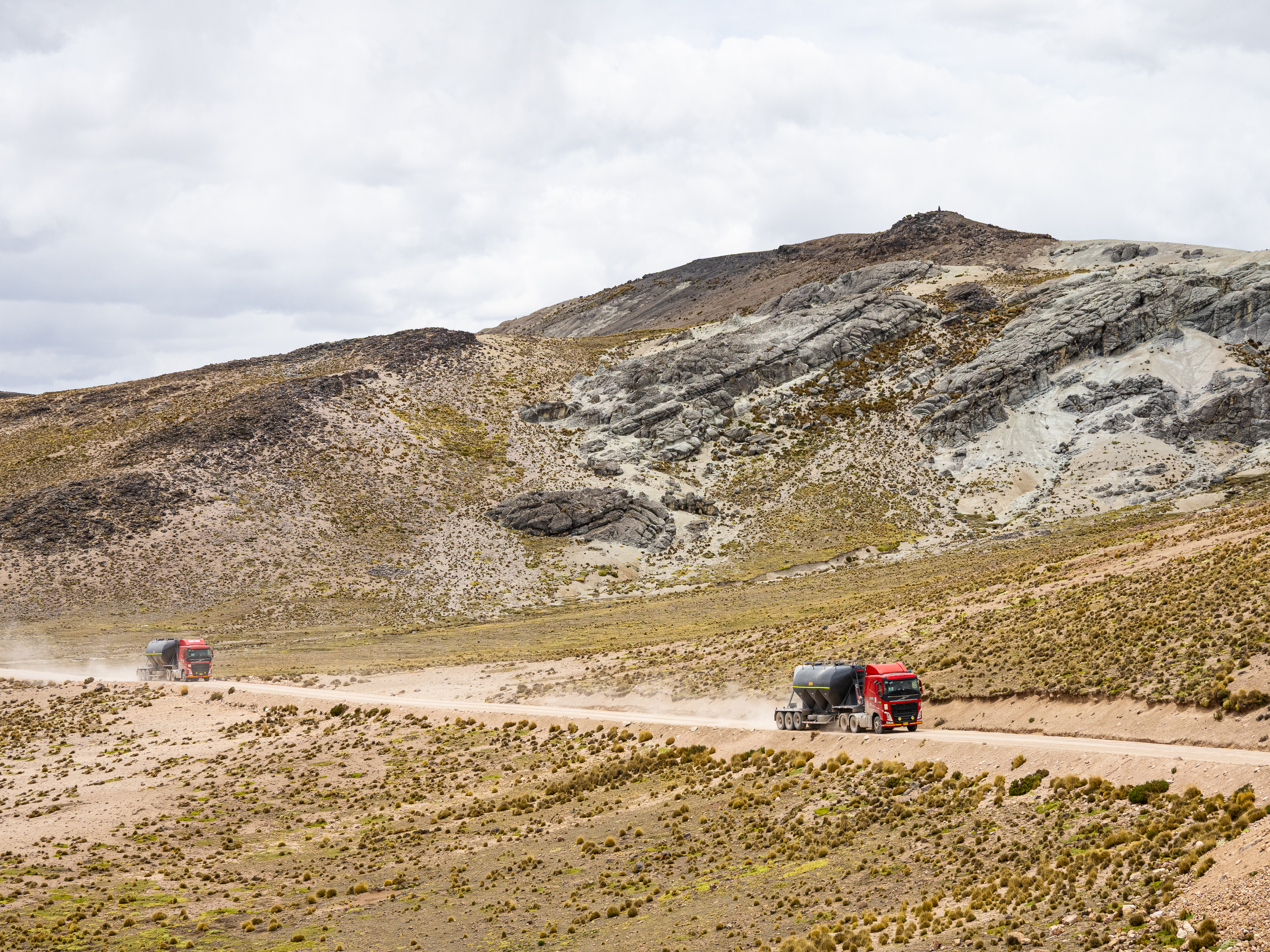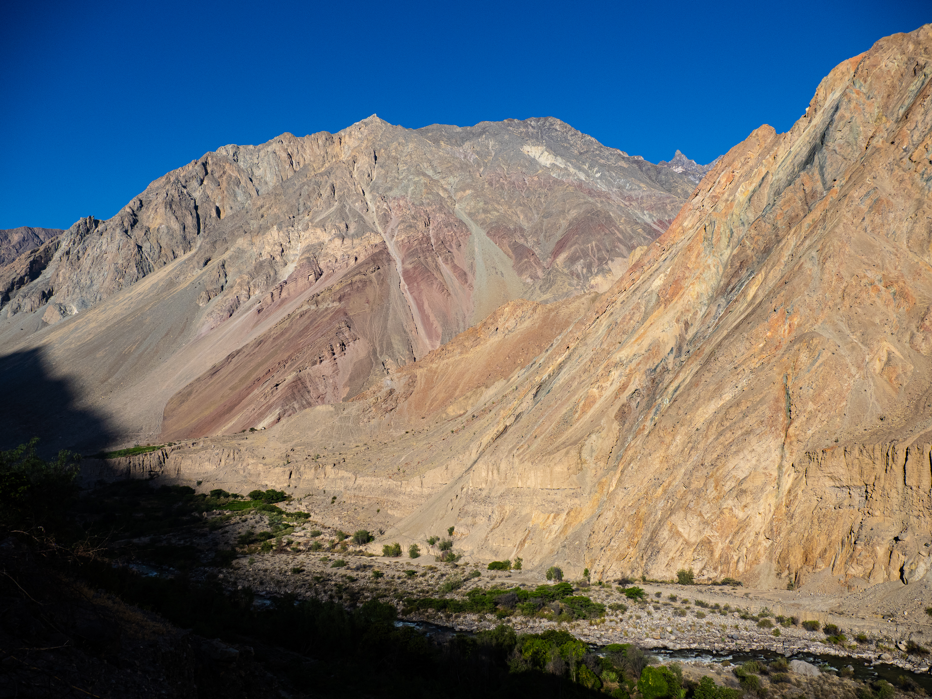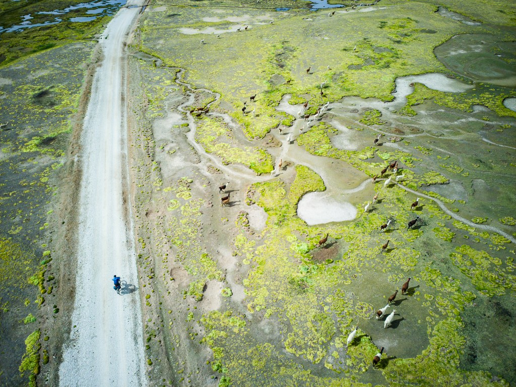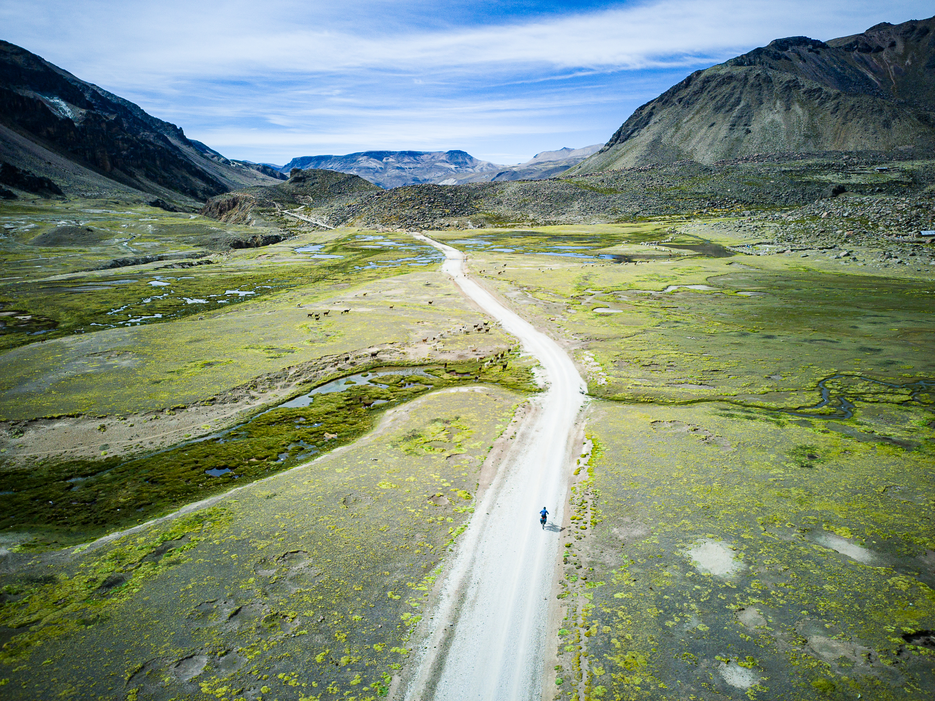 I had a cold sleep at 4,500 metres. I woke up to clear skies and a rising sun casting a luminous glow on the valley. I said farewell to my hosts and climbed back to the plateau, cycling around a pyramidal peak and eventually reaching the main road through this region. After a few days of isolation, I would now be joined by periodic trucks rumbling back and forth to the region’s massive mines. It was a pleasant ride on a well-graded road, with no major climbs, but the altitude – 30 km above 4,600m – did slow me down a little.