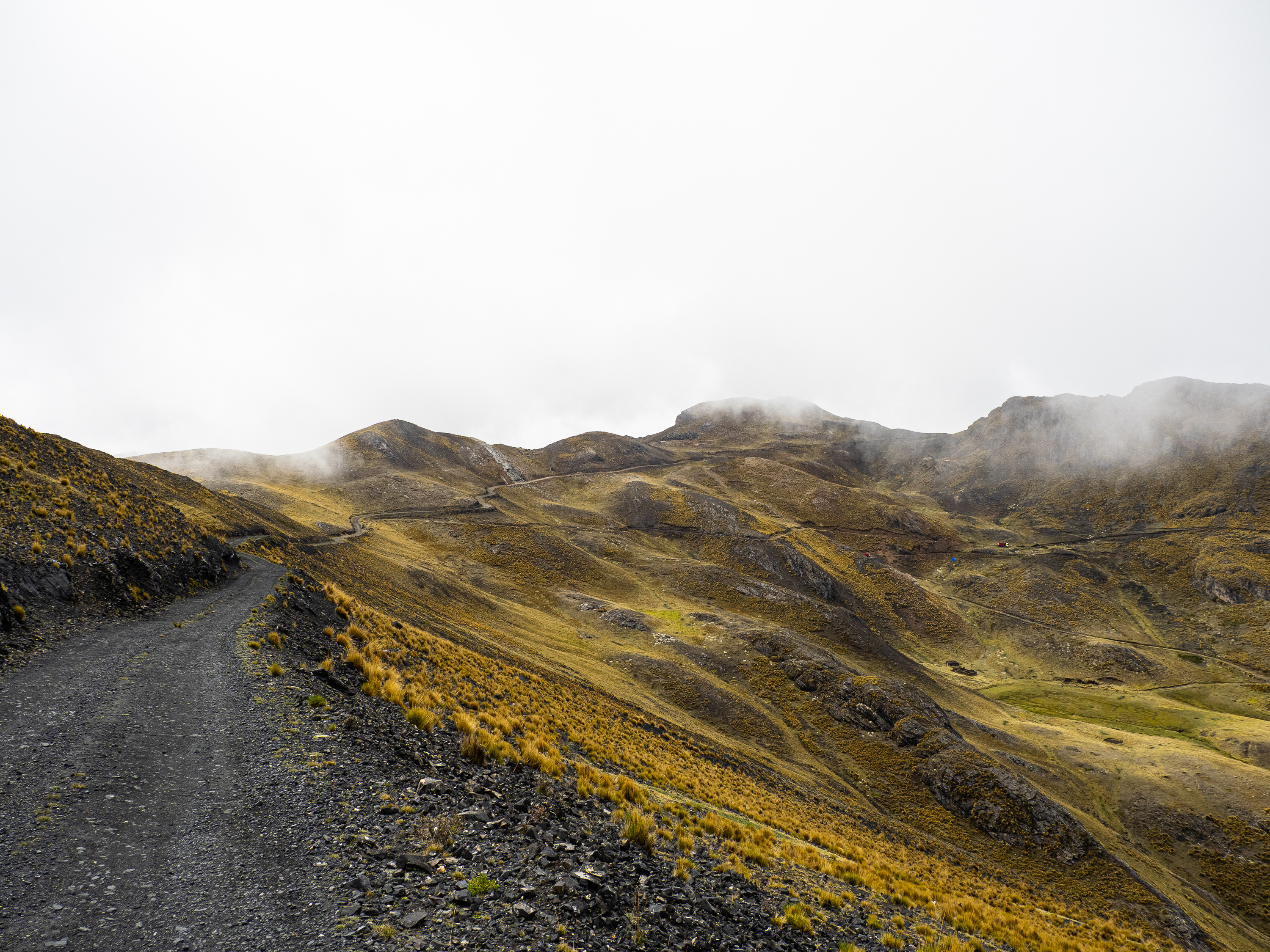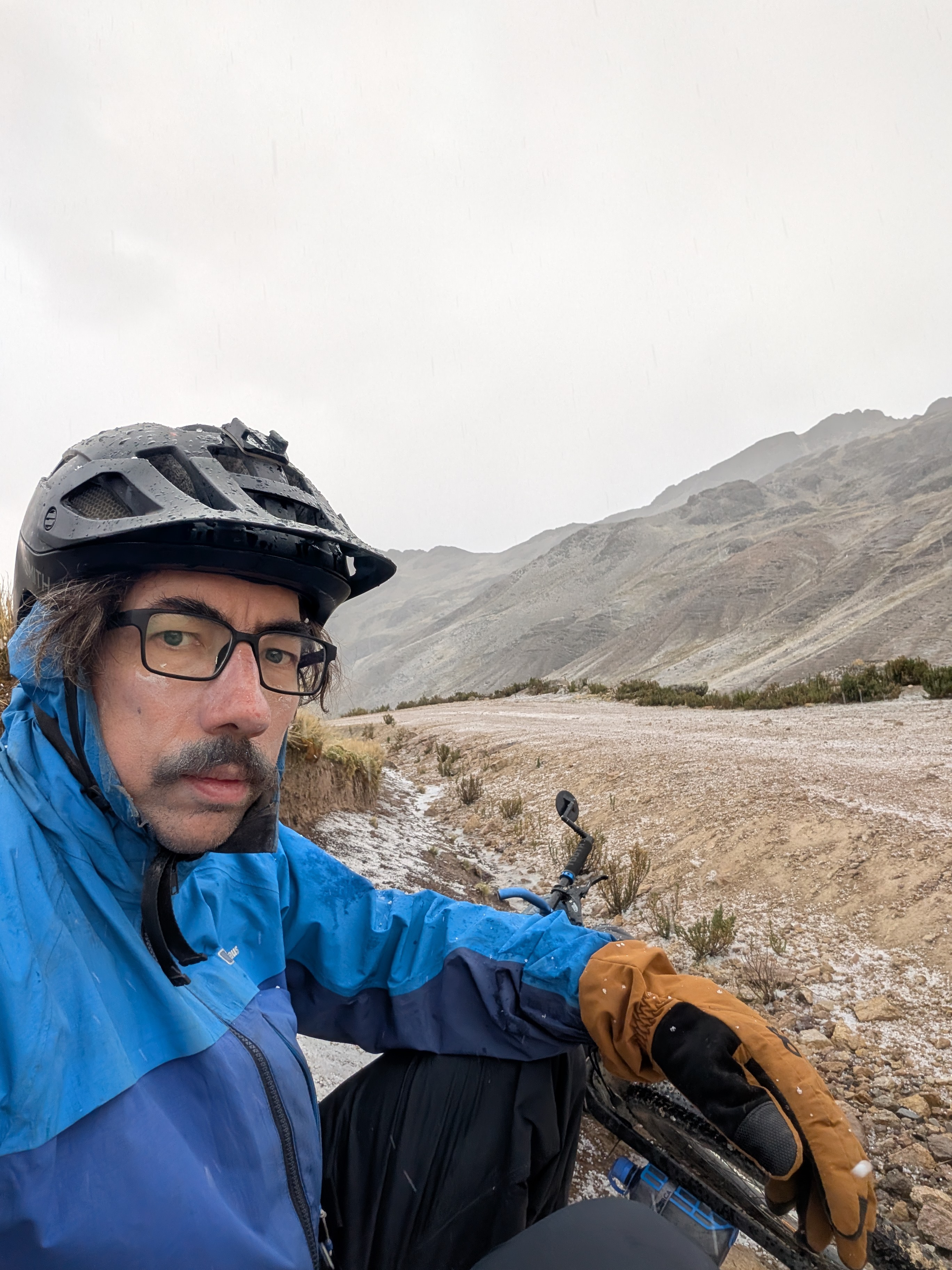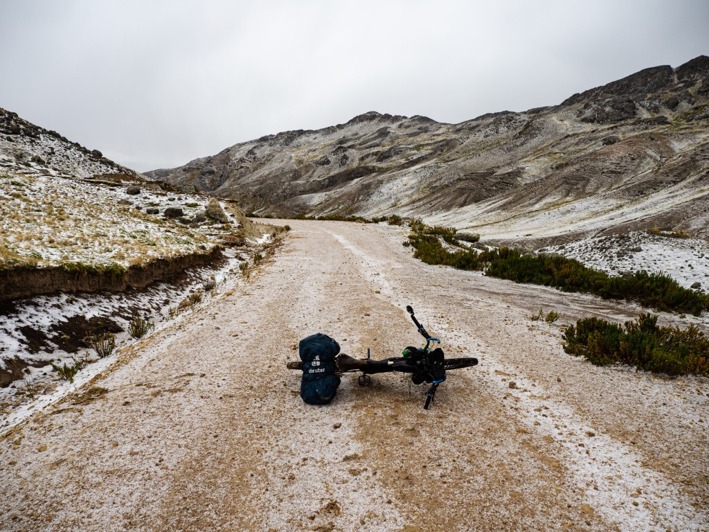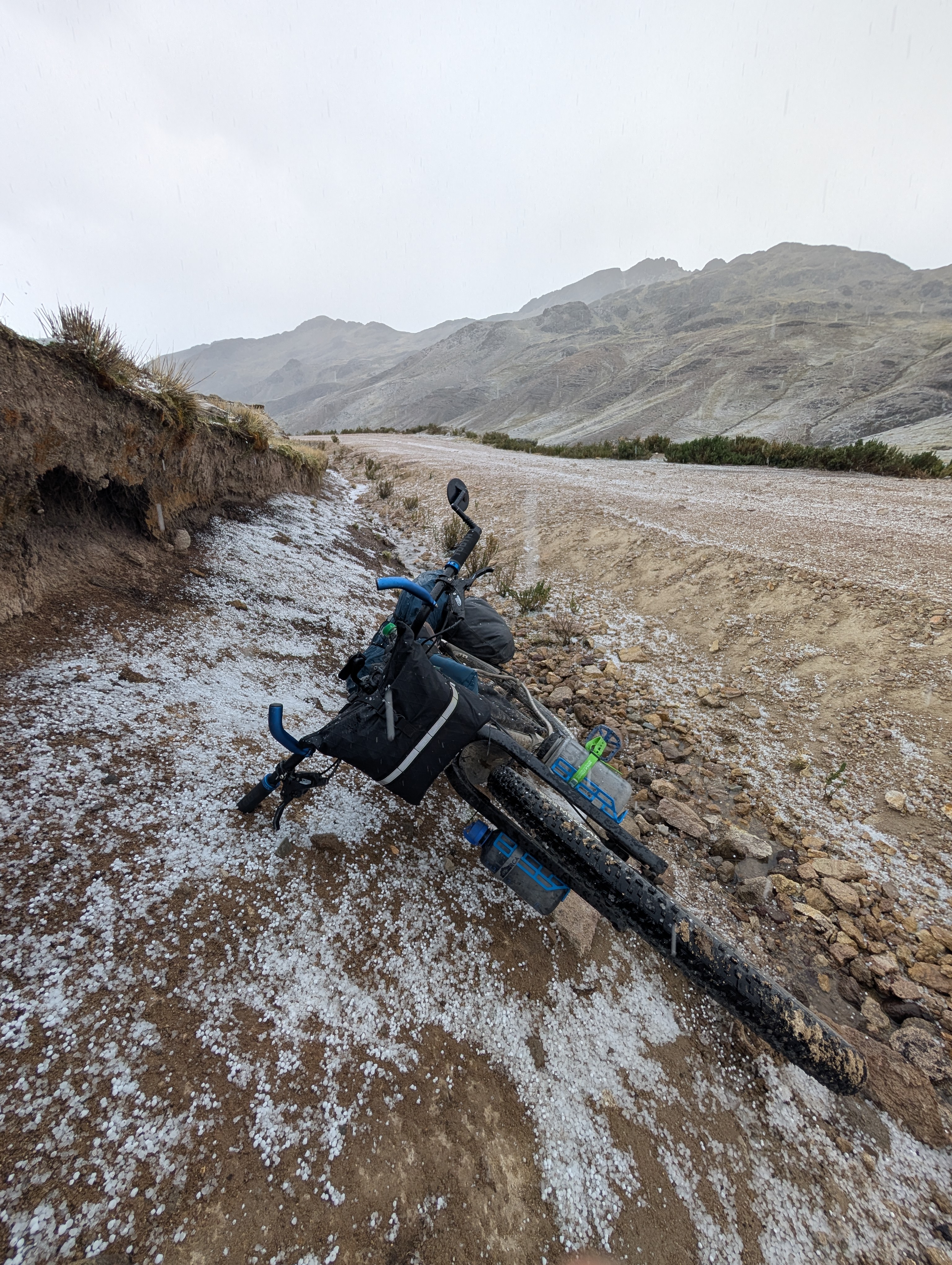 As I began the climb to the 4,800m high-point of the day, a distinct rumble began to echo through the mountains. Dark clouds approached and I could feel the storm approaching. The crashes got louder and I could see lightning in the distance. The hail began and slowly intensified. I could see a truck up ahead and hoped maybe it could provide shelter, but it drove away before I caught up. I looked around for a place to hide and saw nothing. With the storm getting closer, I did the safest thing I could and huddled in the ditch. The hail blanketed the landscape as the thunder roared and lightning flashed around me. I curled into a ball, hoping for the best.
