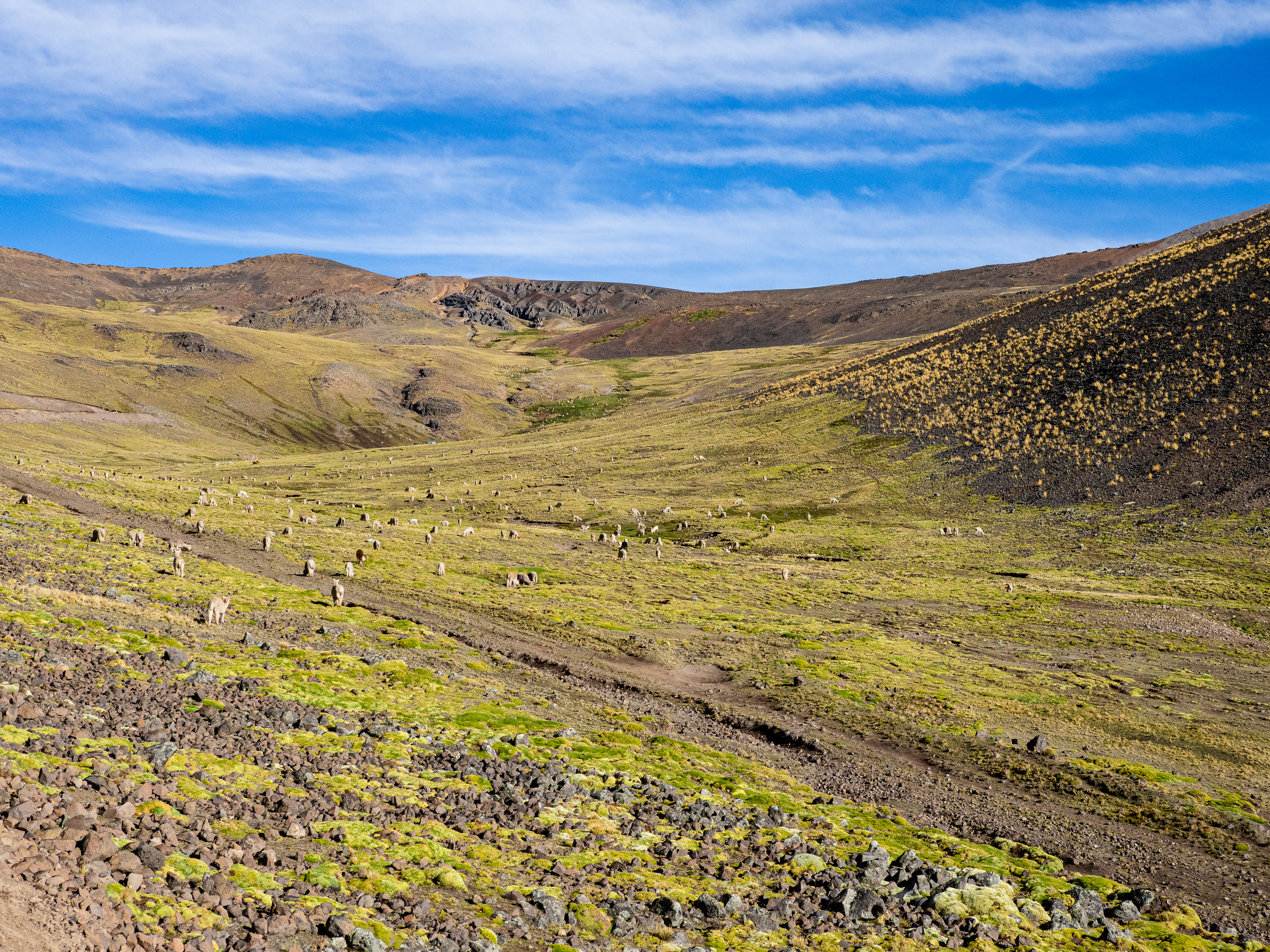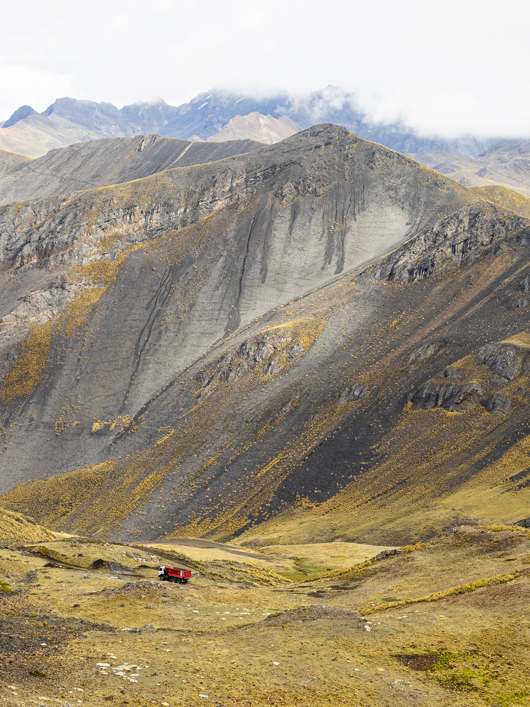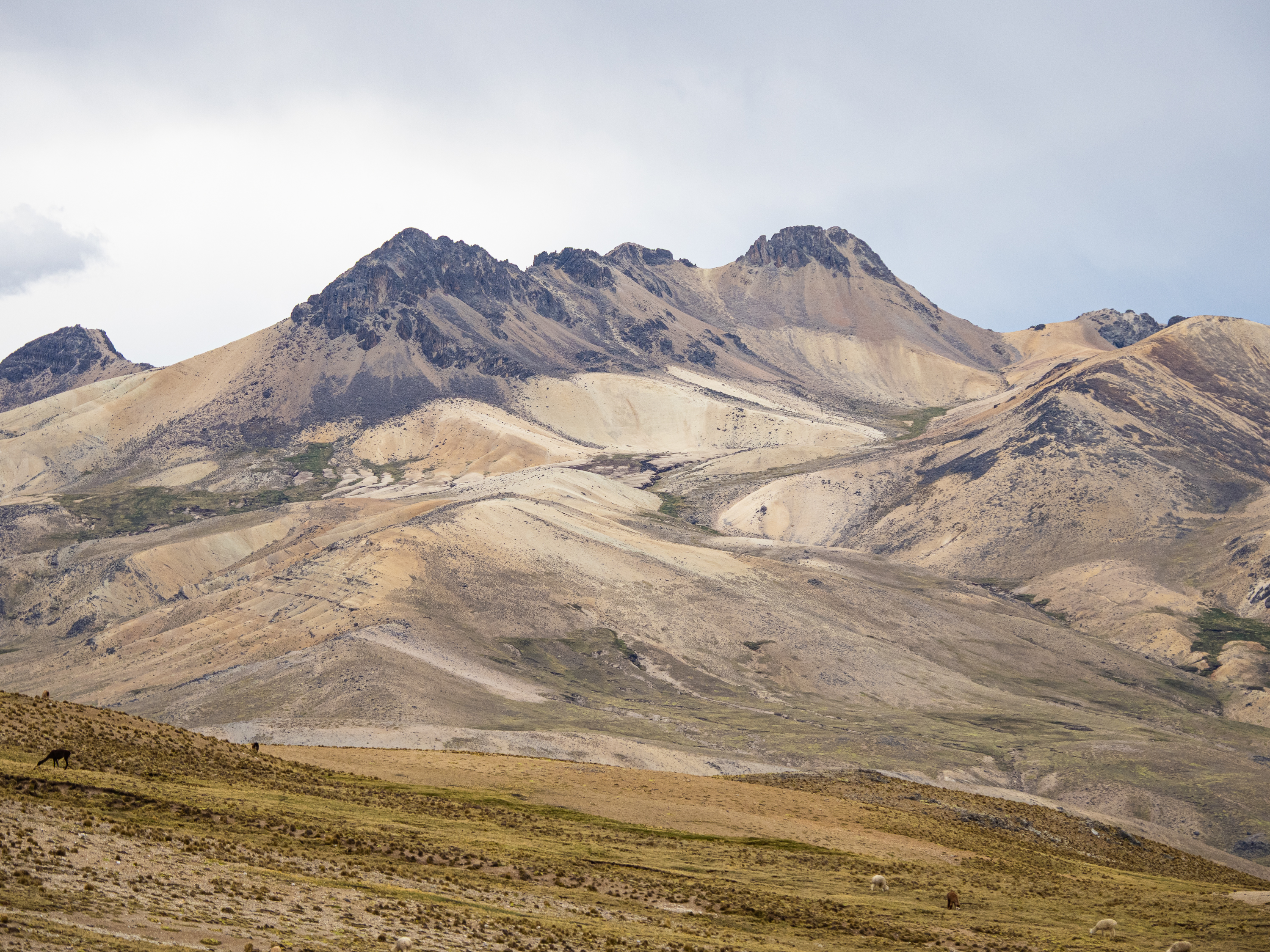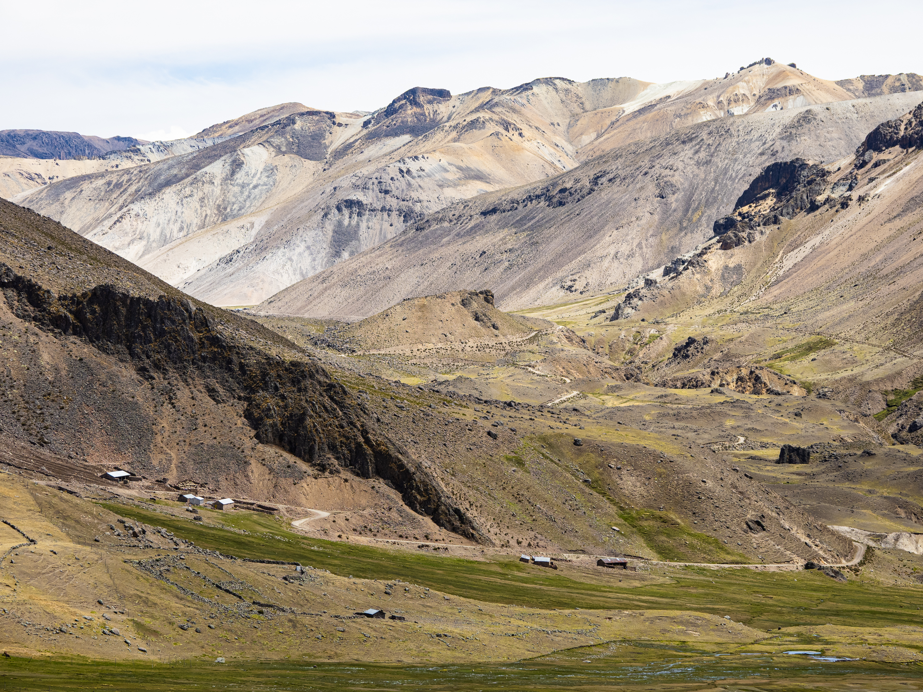 The storm did pass, but it was only a prelude of what was to come. The road continued to wind it’s way through the mountains, while the peaks themselves became increasingly dramatic. Jet black mountains streaked with grey rock falls capped red and pink mineral-rich soil, interspersed with tussock fields. I passed dispersed herds of llamas and alpacas, and the occasional shepherds home. It can’t be an easy life in these remote areas at over 4,500m elevation.