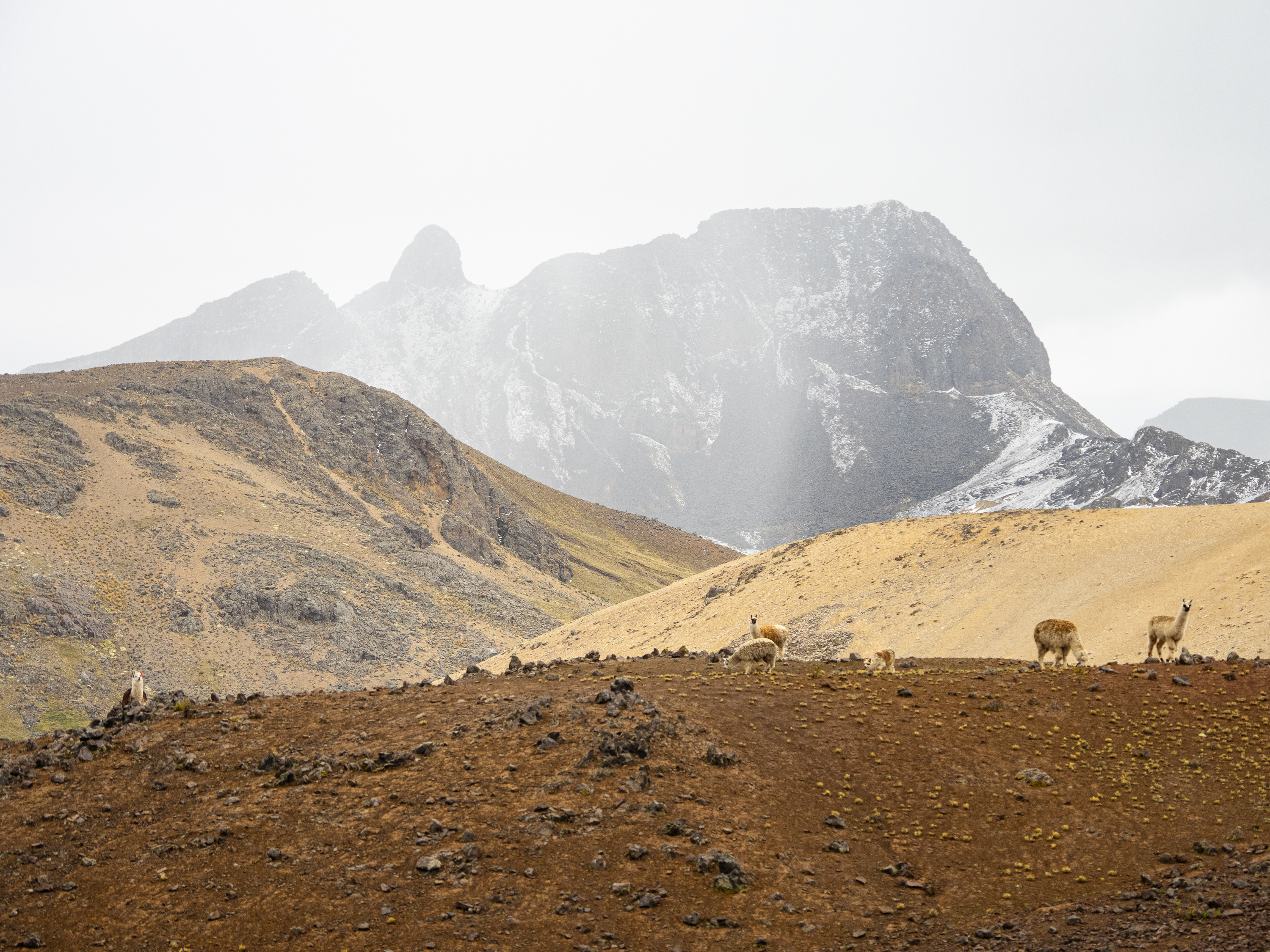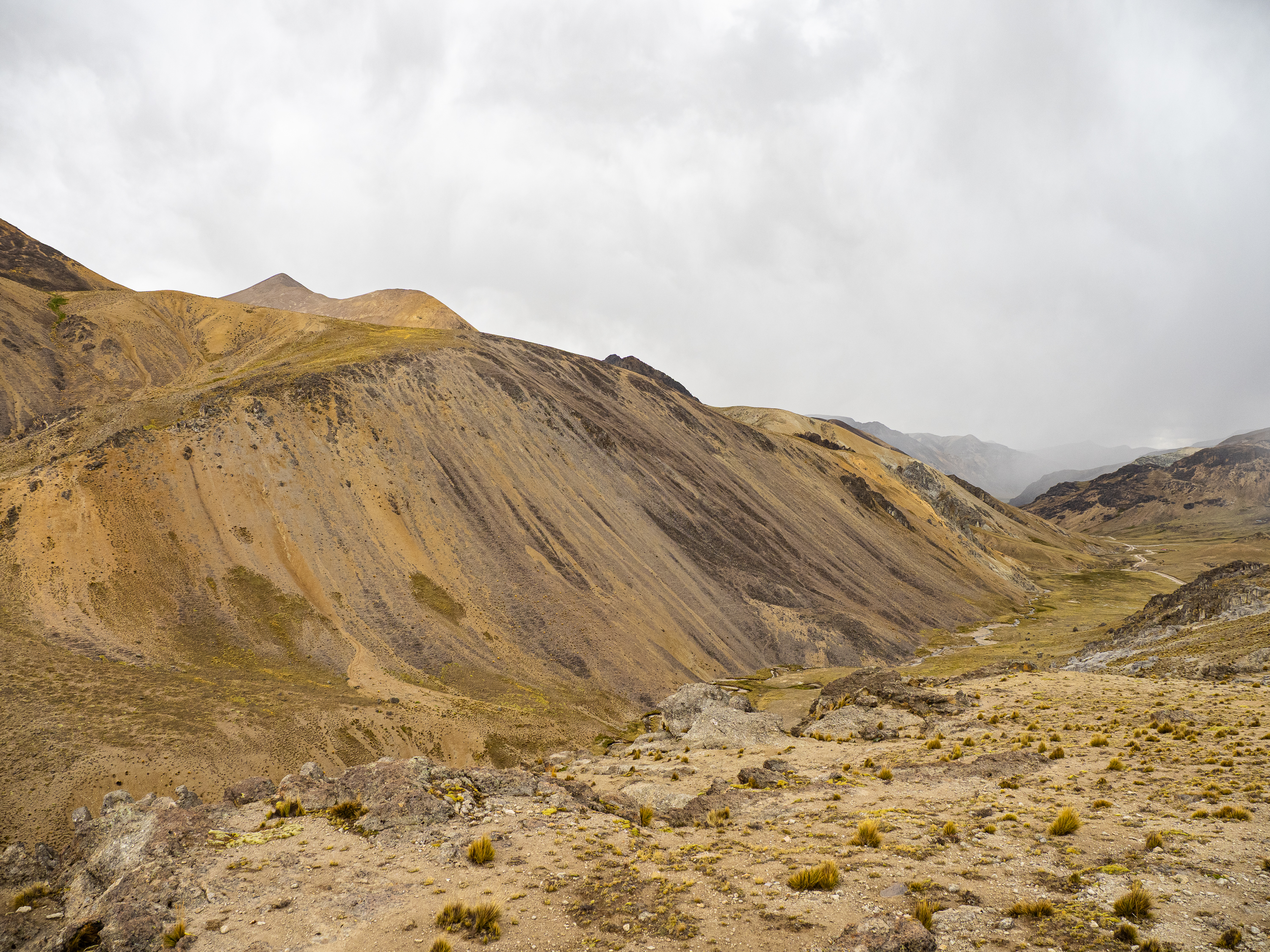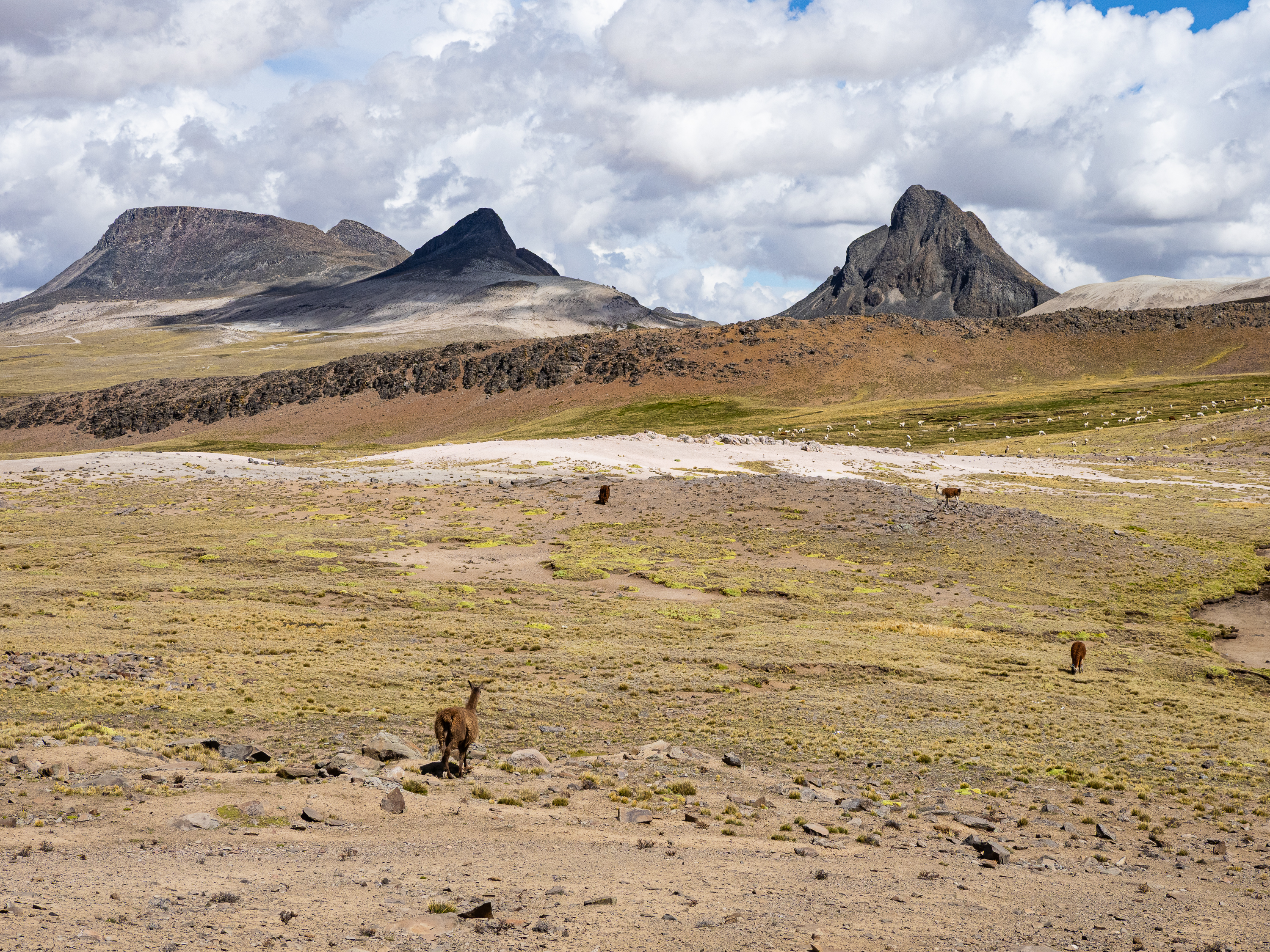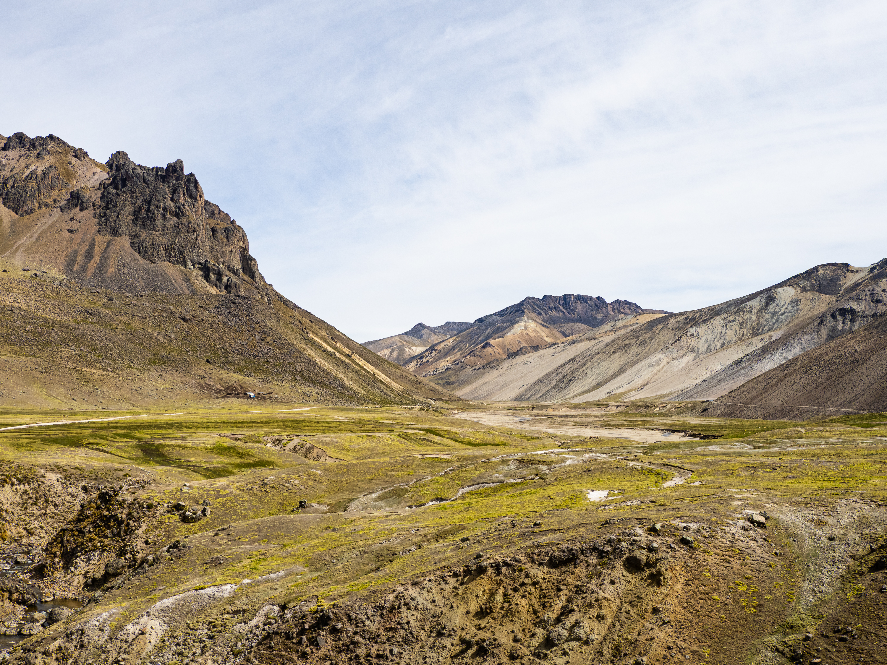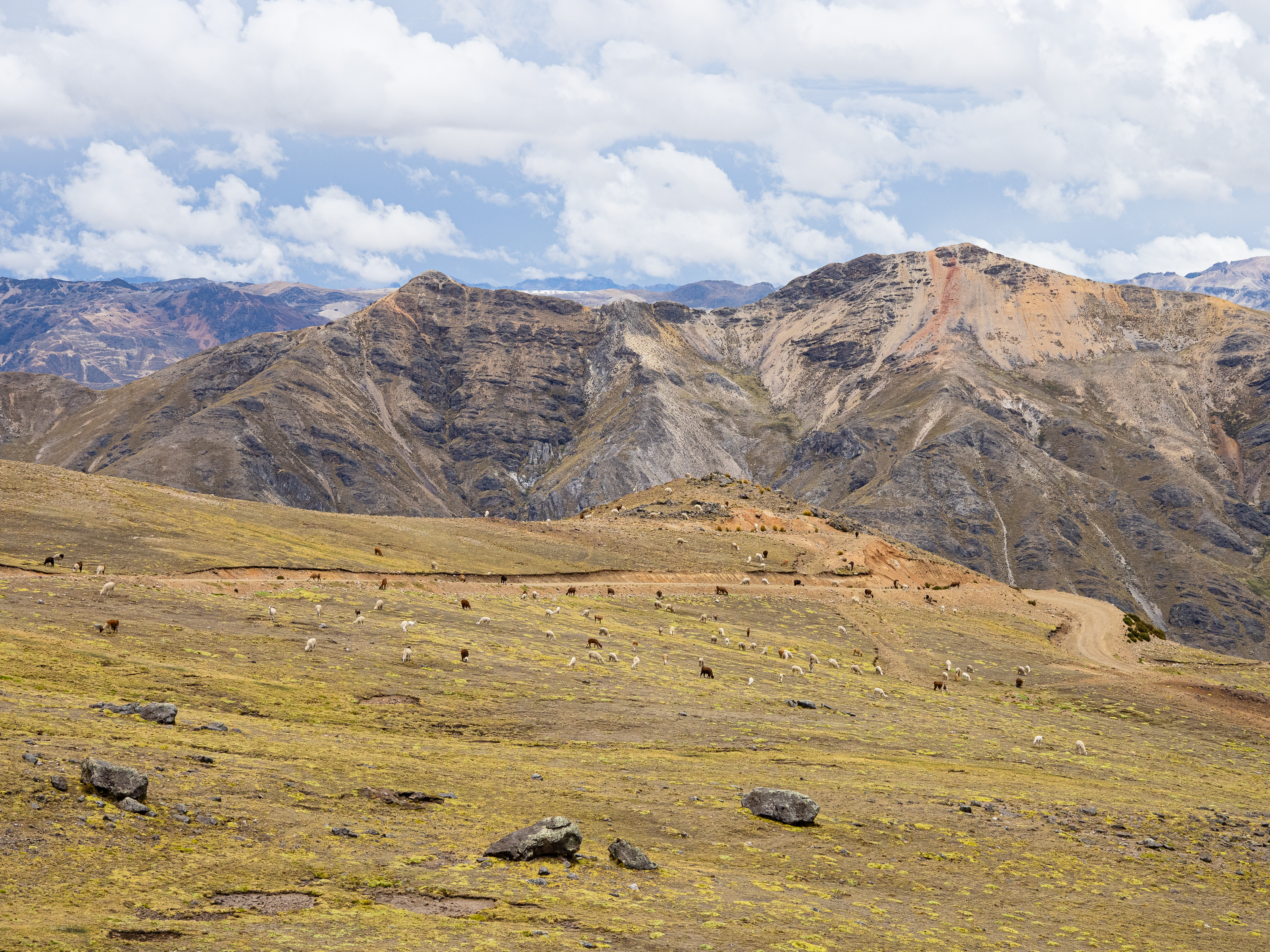 The storm did pass, but it was only a prelude of what was to come. The road continued to wind it’s way through the mountains, while the peaks themselves became increasingly dramatic. Jet black mountains streaked with grey rock falls capped red and pink mineral-rich soil, interspersed with tussock fields. I passed dispersed herds of llamas and alpacas, and the occasional shepherds home. It can’t be an easy life in these remote areas at over 4,500m elevation.