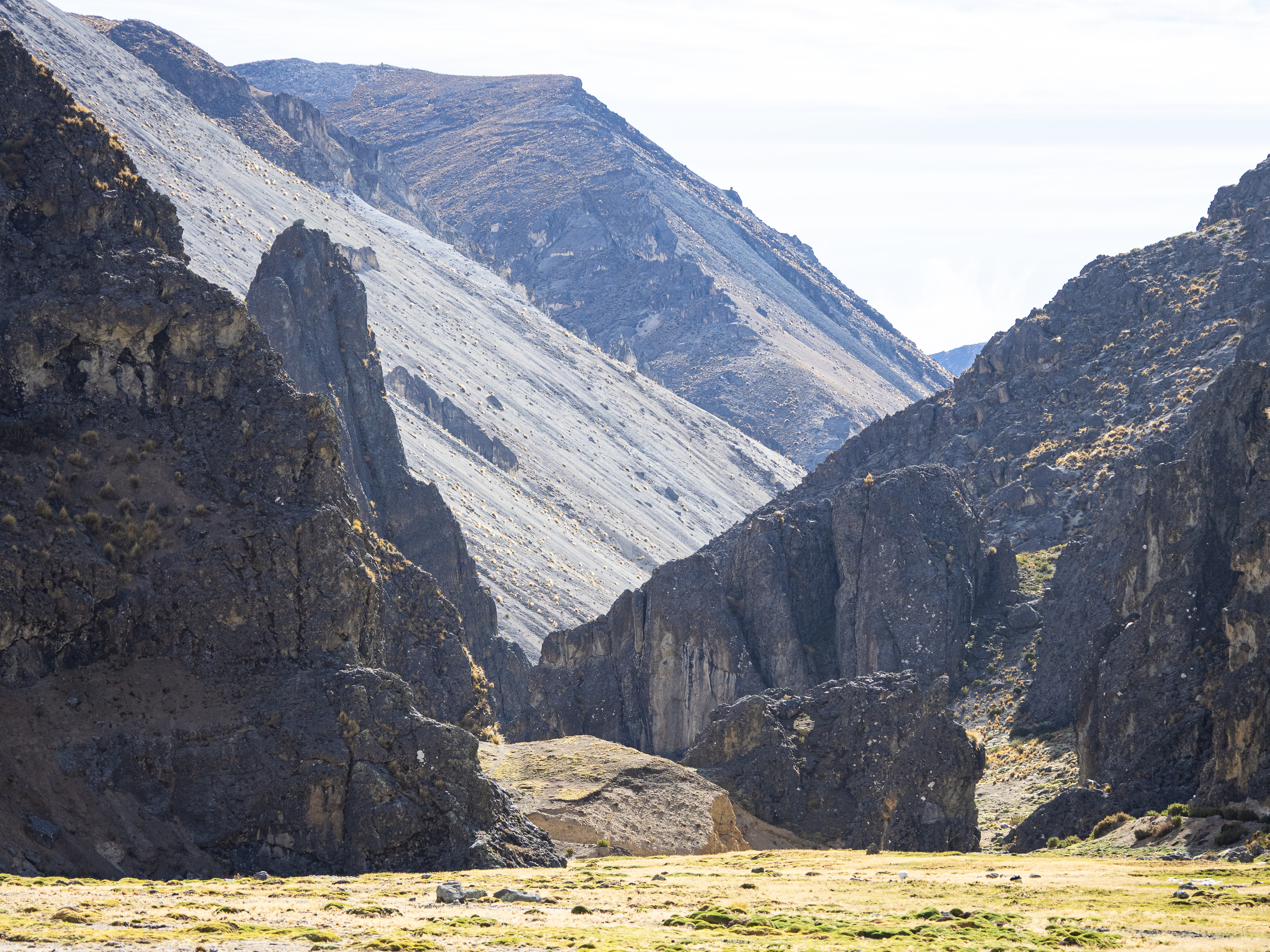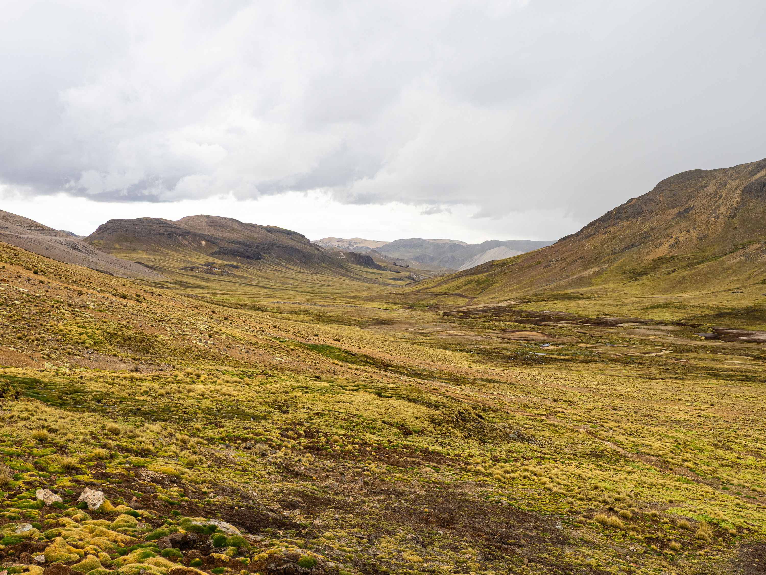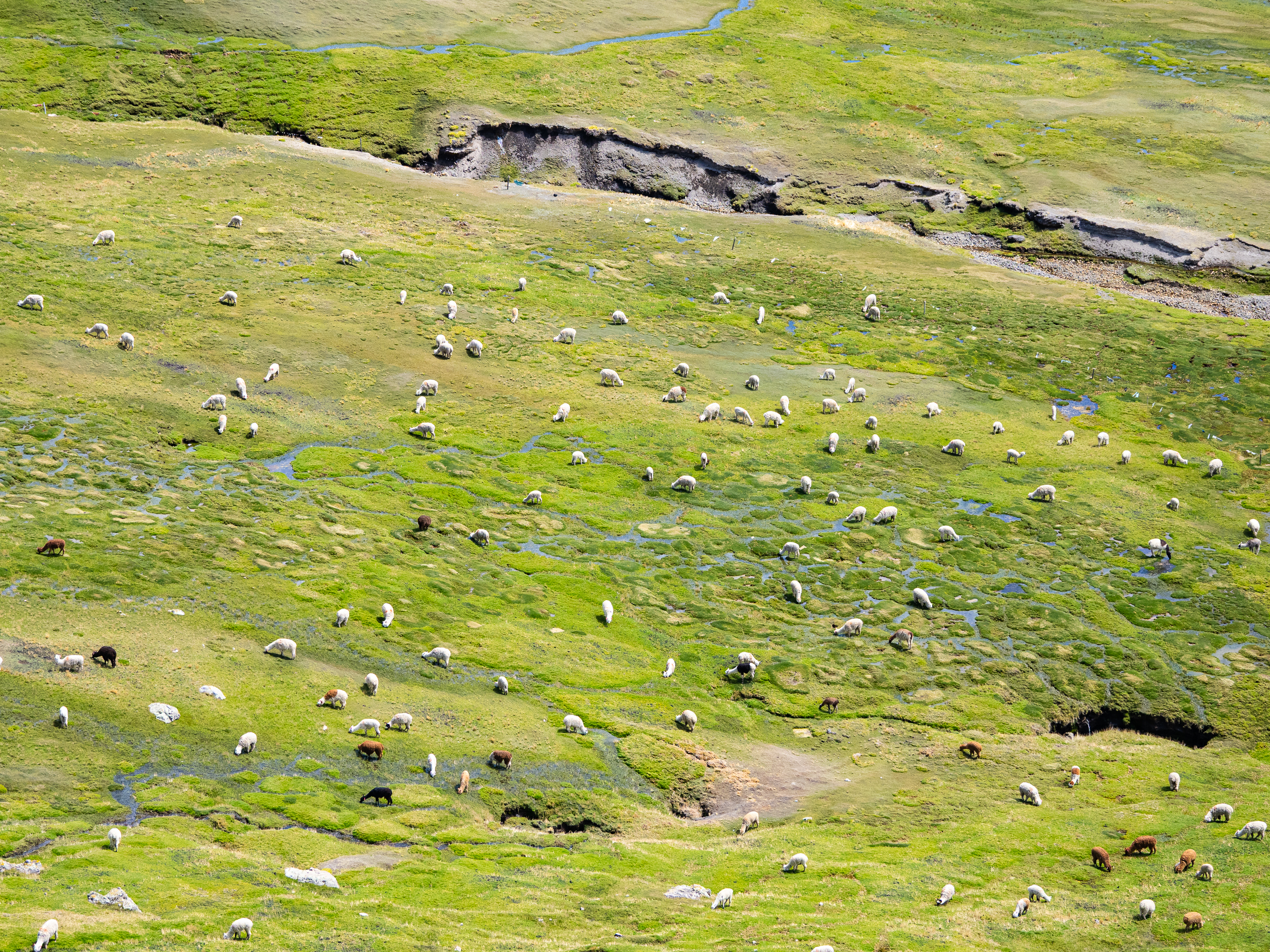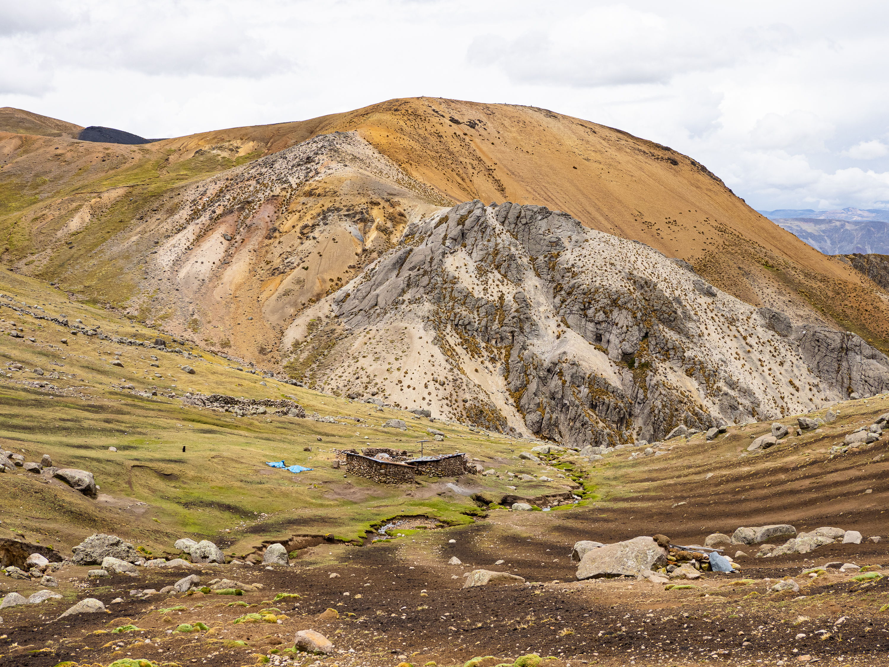 The storm did pass, but it was only a prelude of what was to come. The road continued to wind it’s way through the mountains, while the peaks themselves became increasingly dramatic. Jet black mountains streaked with grey rock falls capped red and pink mineral-rich soil, interspersed with tussock fields. I passed dispersed herds of llamas and alpacas, and the occasional shepherds home. It can’t be an easy life in these remote areas at over 4,500m elevation.