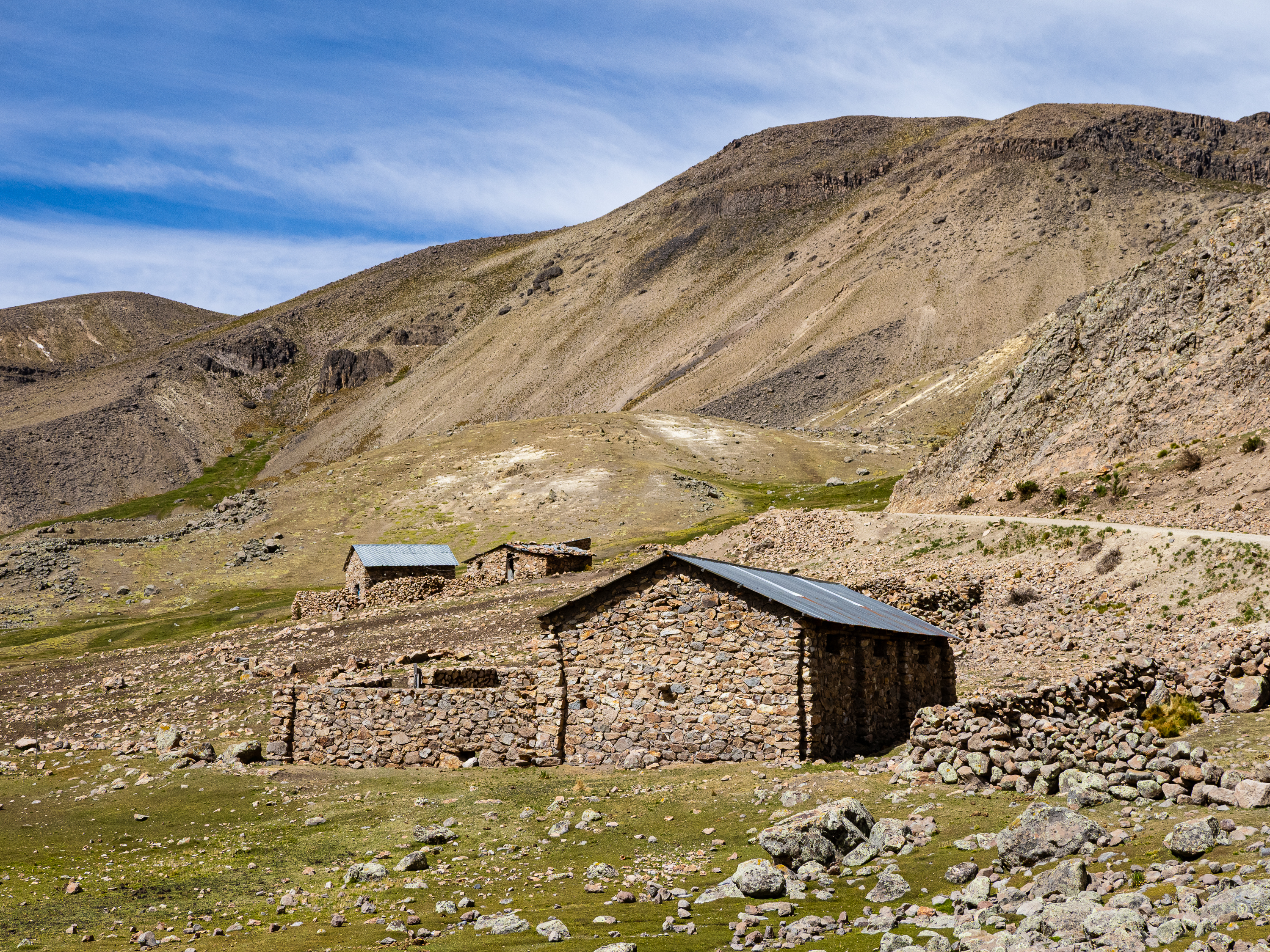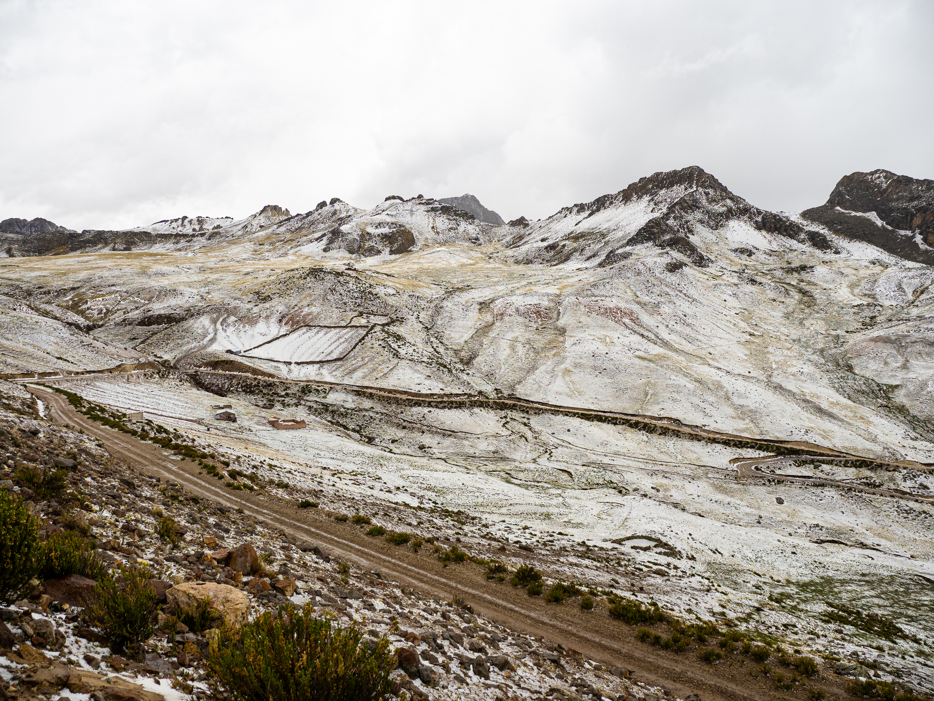 The first day out of Challuanca was one of the least interesting days of the trip. Carrying four days of food, I cruised down the highway, then turned off onto a paved secondary road and began a 1,600m climb back into the puna. I passed through one small village that was surrounded by historic Incan terraces. Later, I had a conversation with a local drunk farmer and his sober wife that I struggled to extract myself from. I set up camp at 4,300m, and for the first time on my ride, it rained at night.