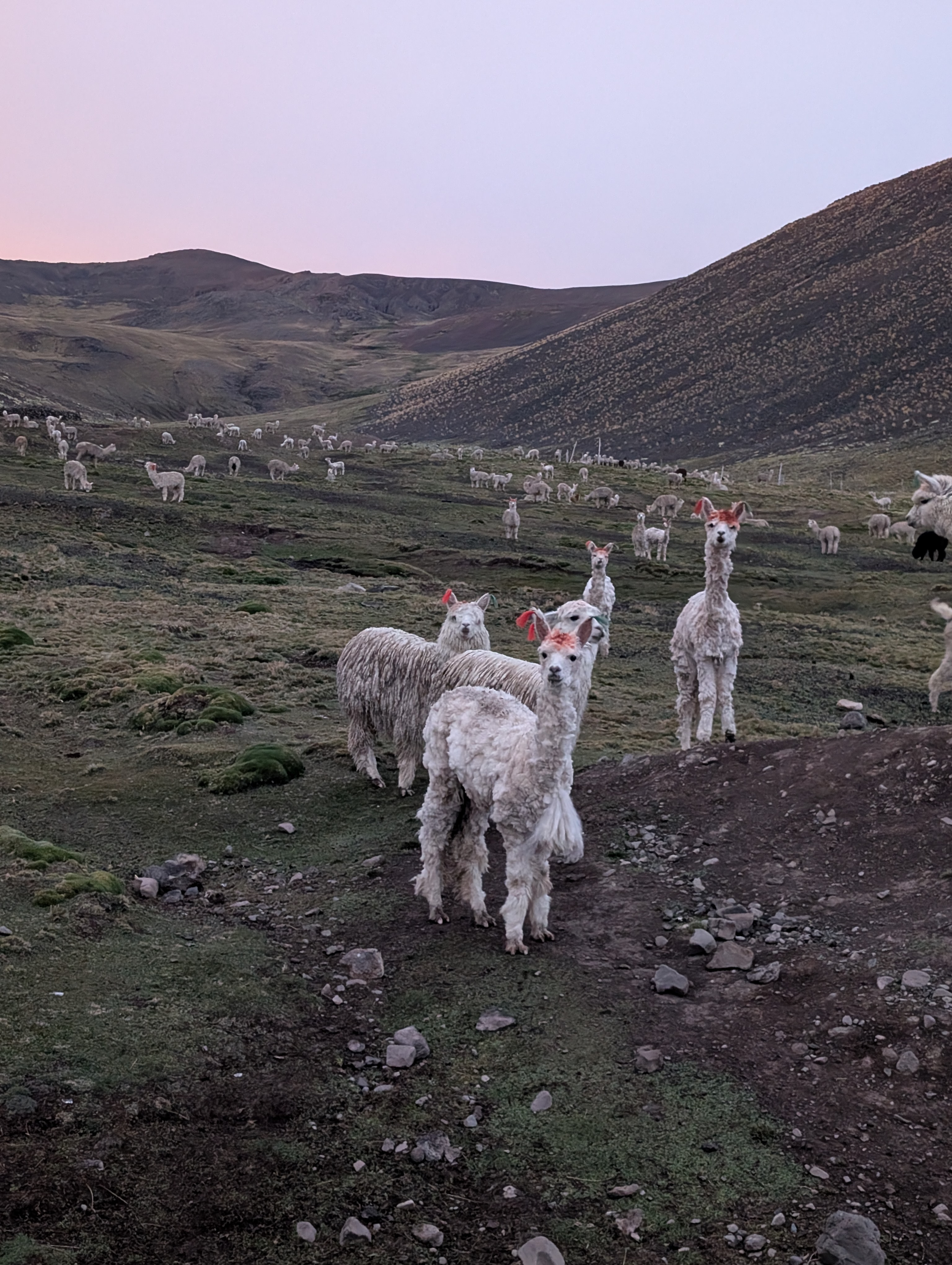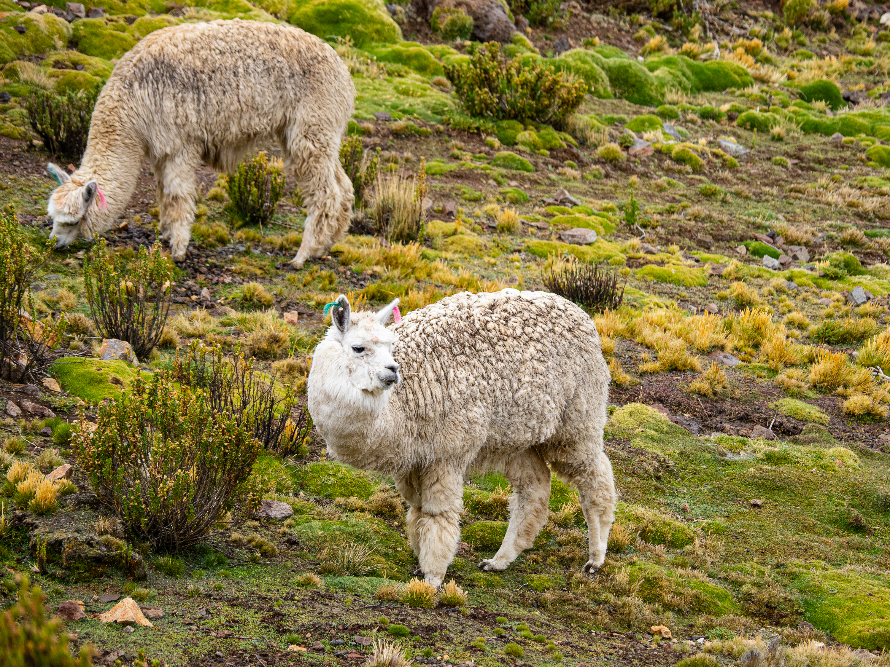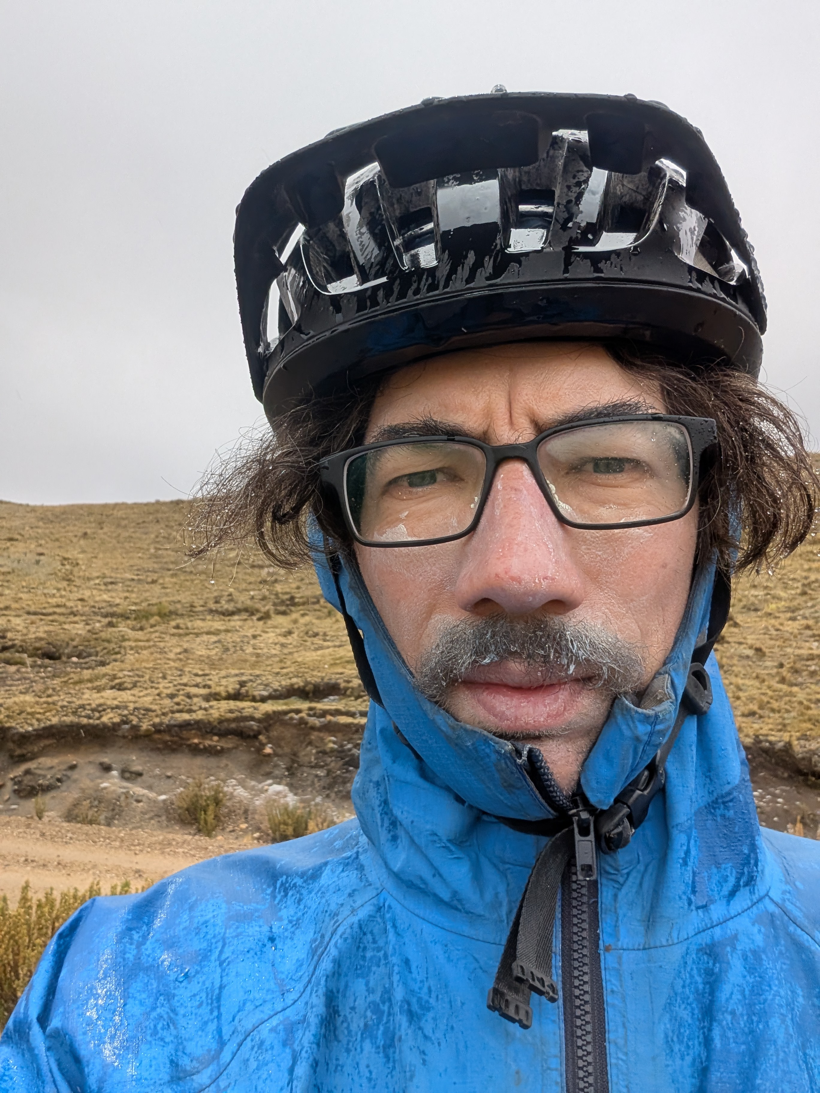 After an uncertain amount of time, the storm let up. The lightning became fainter and the thunder quieter. The hail let up and I felt safe emerging from my huddle and setting out again. The roads were covered in a thick layer of ice chunks that crunched beneath my tires. I complete the climb and passed a herd of damp alpacas, whose thick wool protects them from the weather.